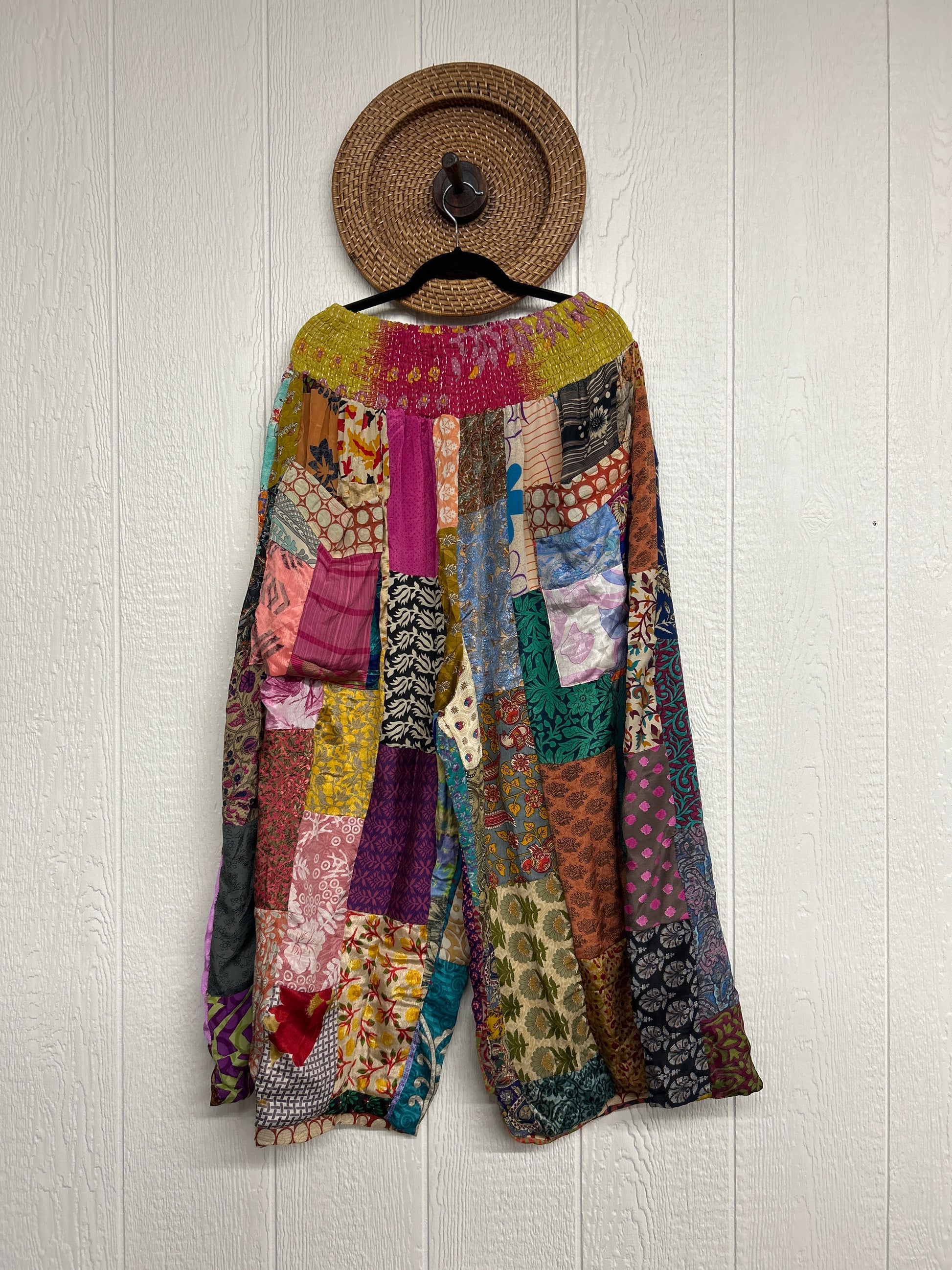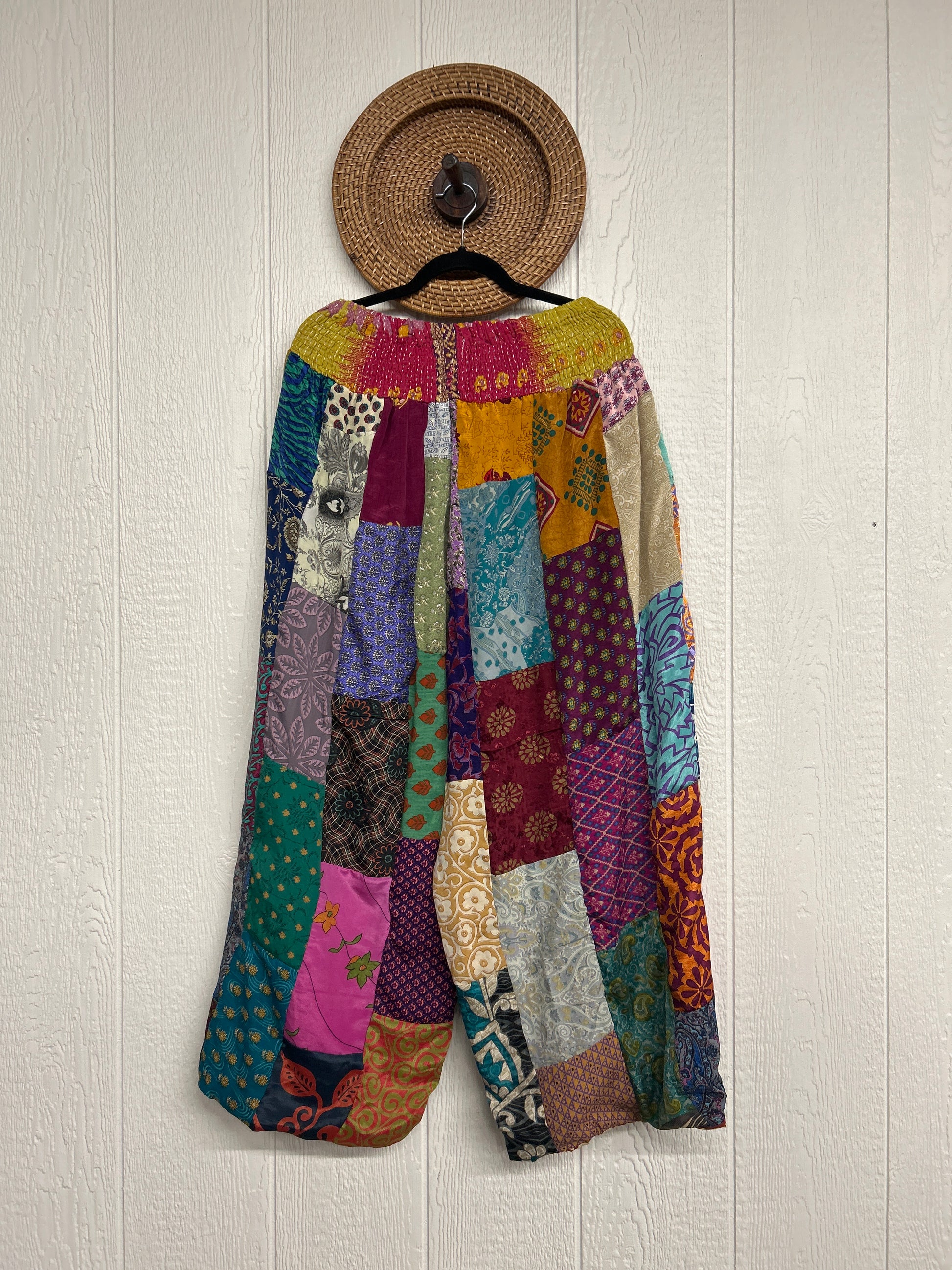 Features super wide legs that make your pants dance when you walk. Front slouchy pockets are deep enough to fill with your treasures. Vintage Rasgulla and Crepe Sari make up the beautiful patchwork featured on the outside with vintage cotton sari lining on the inside. Fully reversible and free size in all the ways!