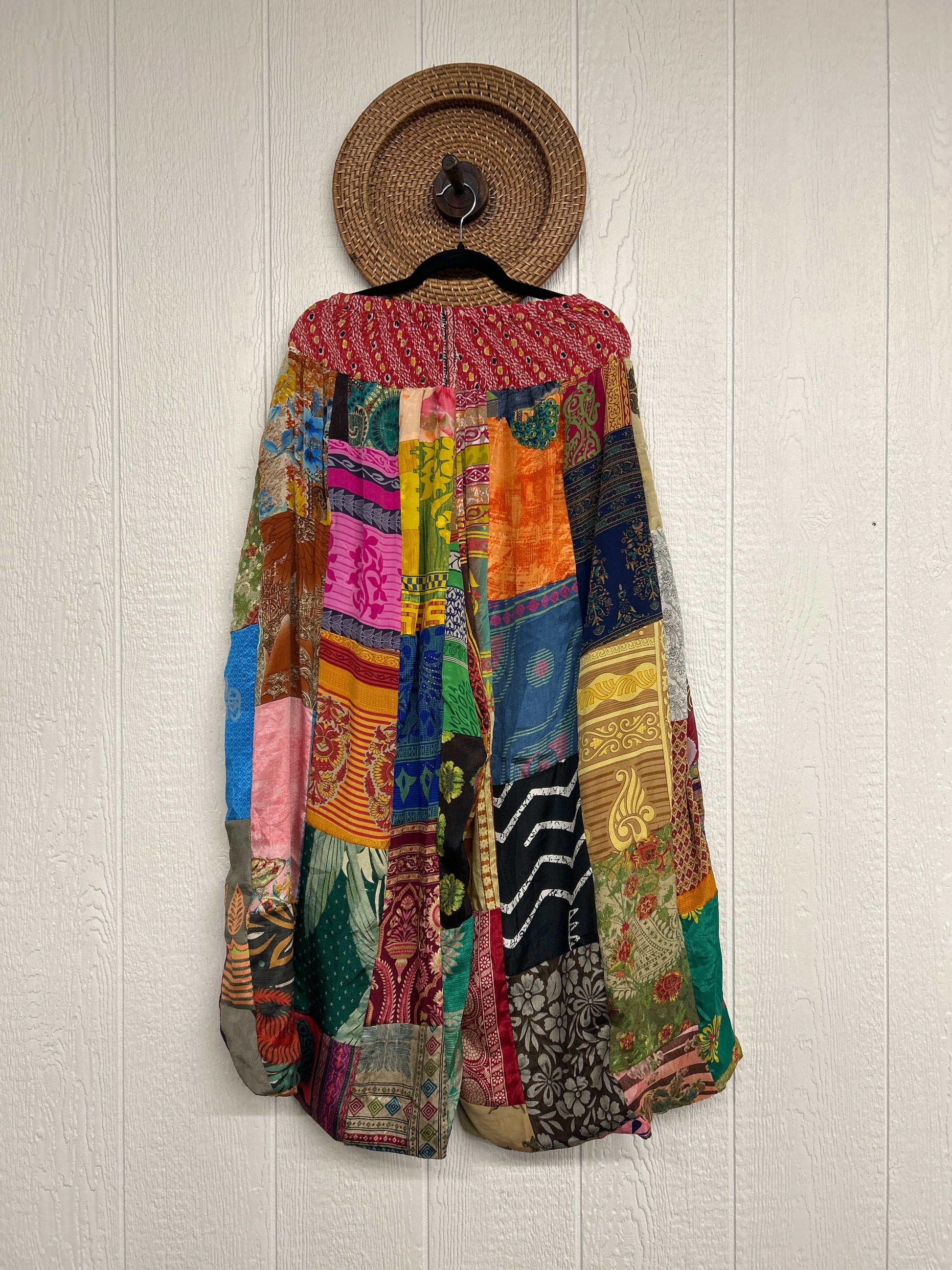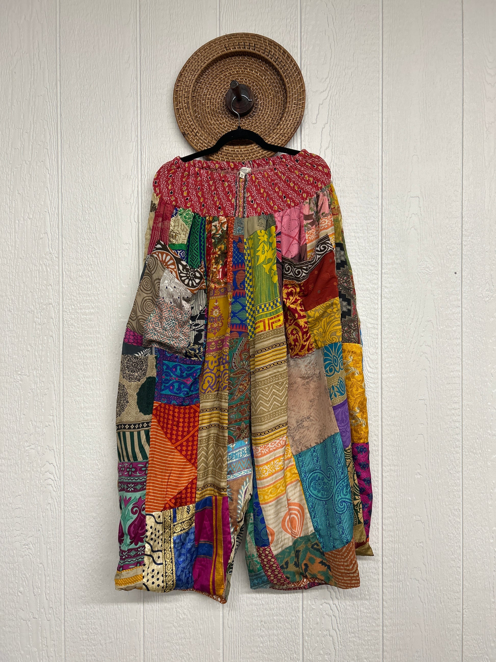 Features super wide legs that make your pants dance when you walk. Front slouchy pockets are deep enough to fill with your treasures. Vintage Rasgulla and Crepe Sari make up the beautiful patchwork featured on the outside with vintage cotton sari lining on the inside. Fully reversible and free size in all the ways!
