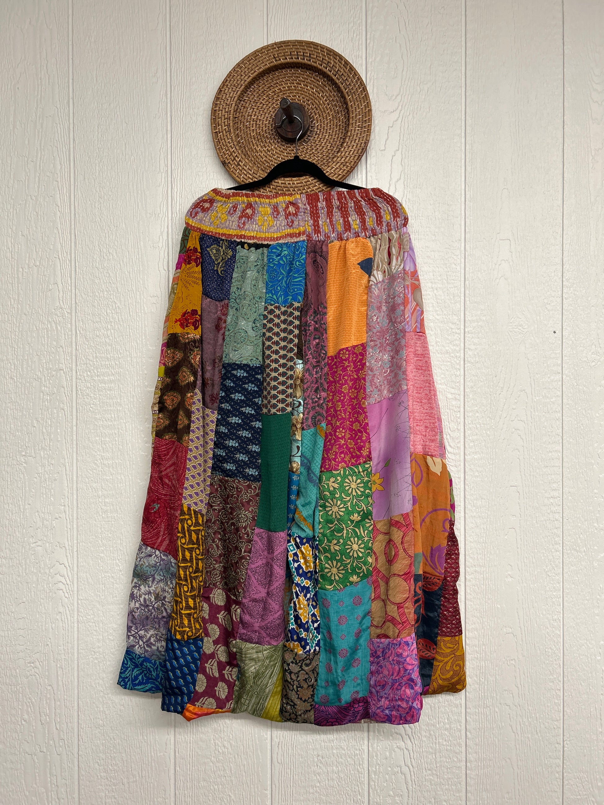 Features super wide legs that make your pants dance when you walk. Front slouchy pockets are deep enough to fill with your treasures. Vintage Rasgulla and Crepe Sari make up the beautiful patchwork featured on the outside with vintage cotton sari lining on the inside. Fully reversible and free size in all the ways!