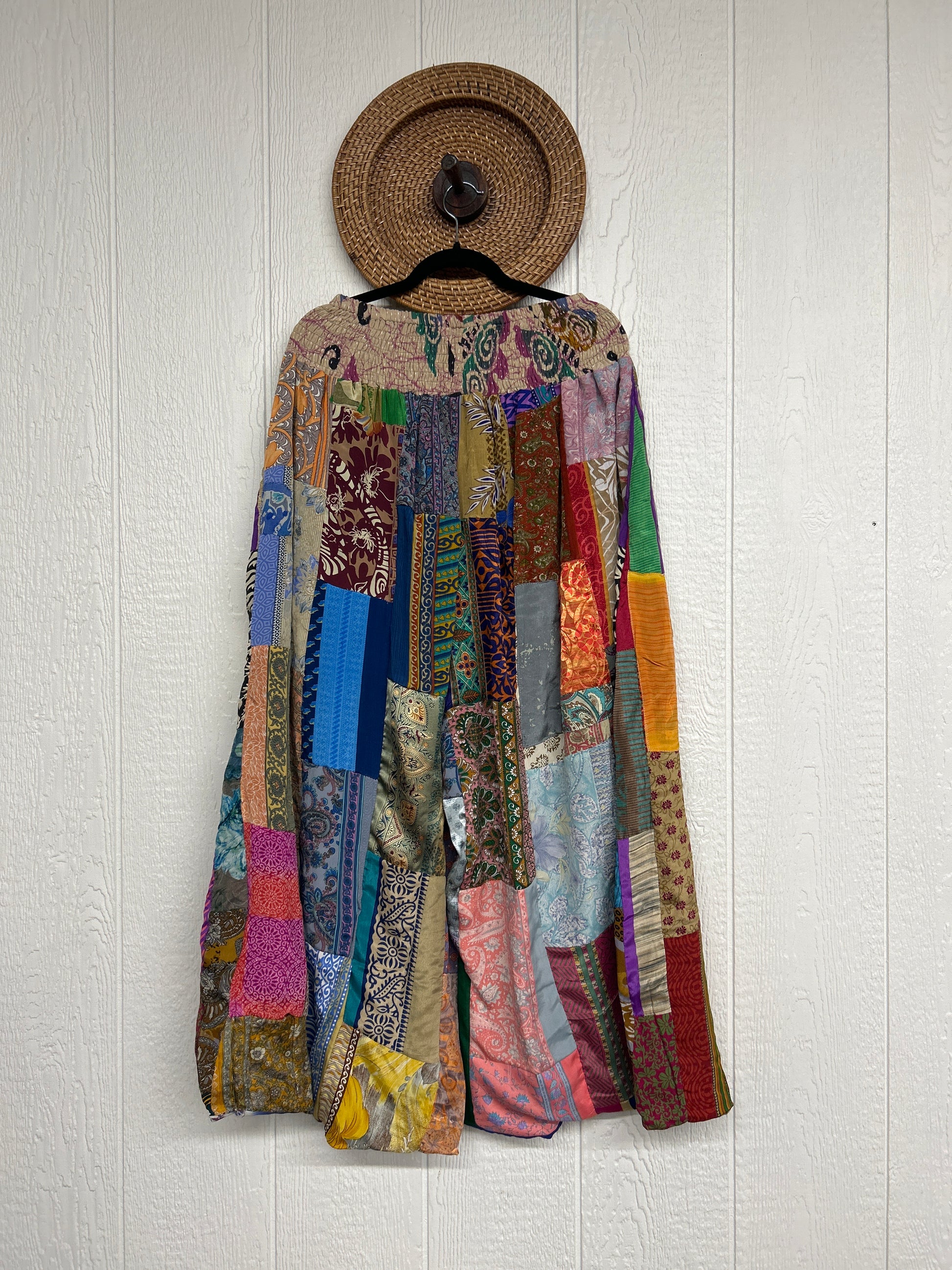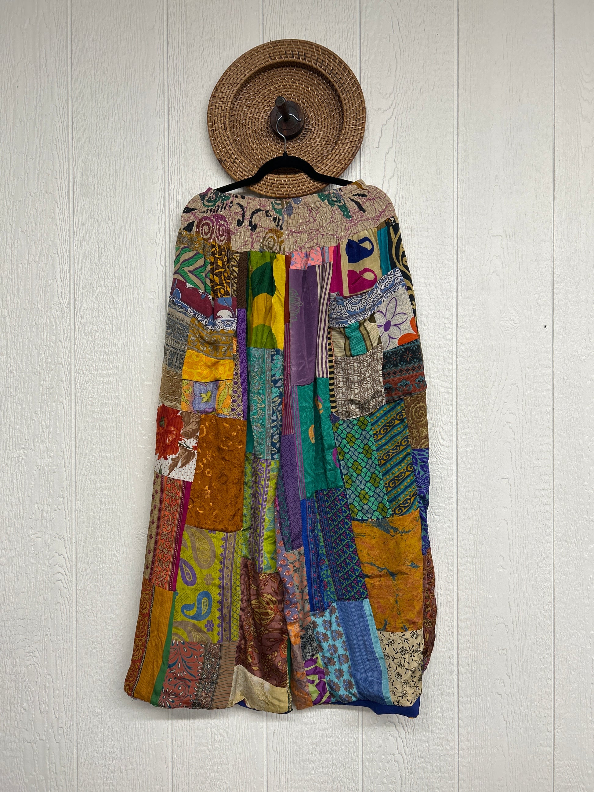 Features super wide legs that make your pants dance when you walk. Front slouchy pockets are deep enough to fill with your treasures. Vintage Rasgulla and Crepe Sari make up the beautiful patchwork featured on the outside with vintage cotton sari lining on the inside. Fully reversible and free size in all the ways!