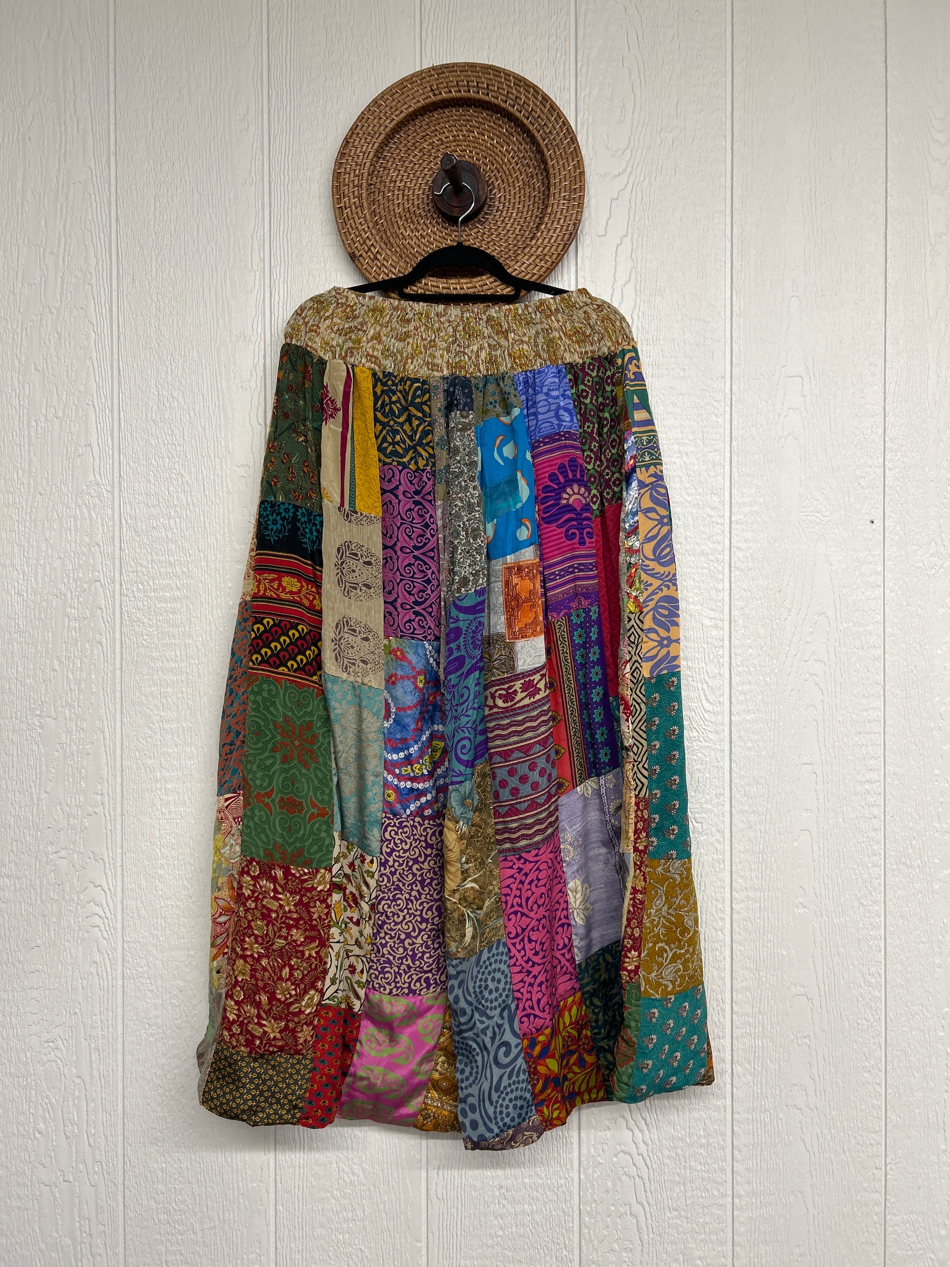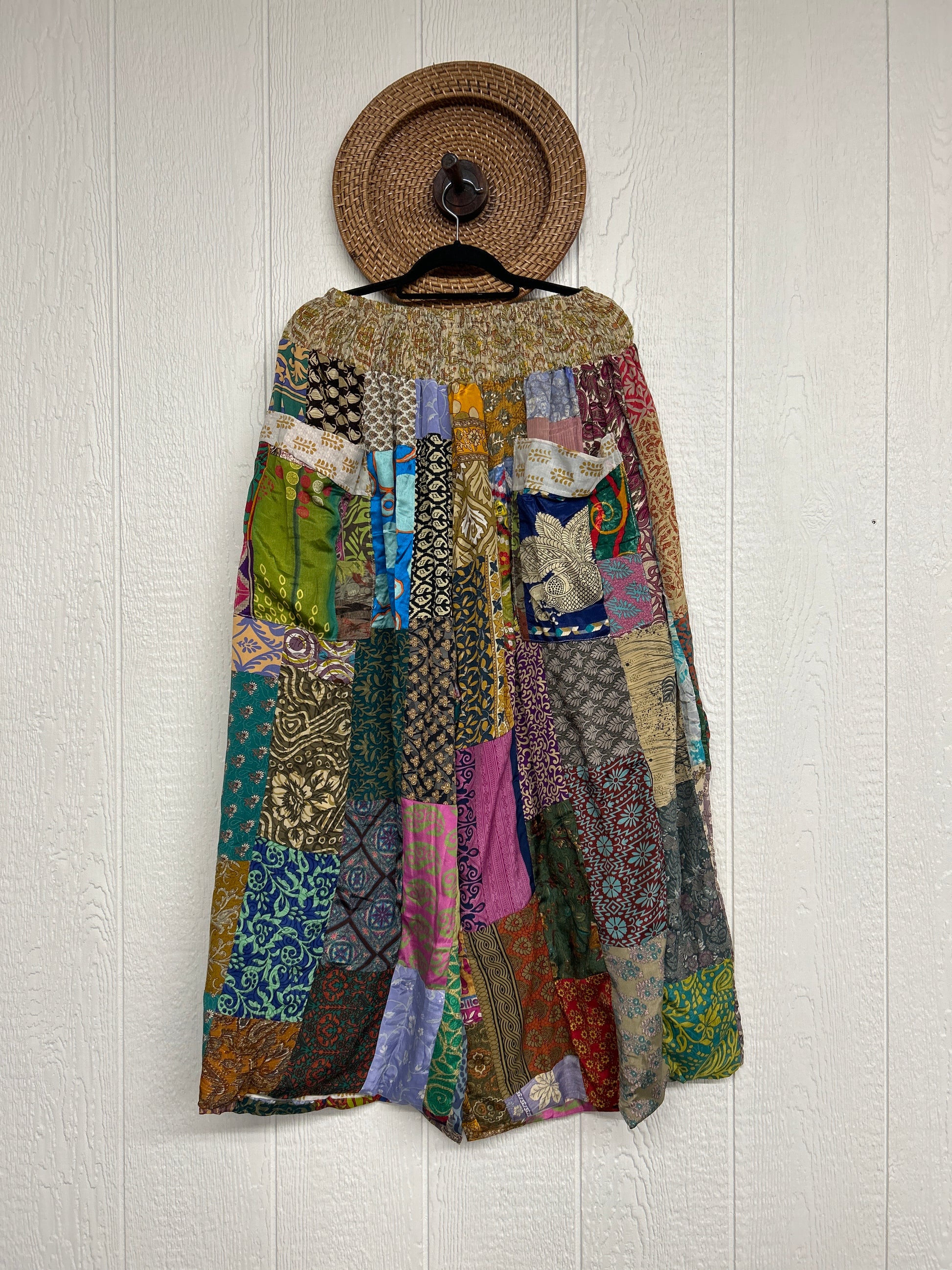 Features super wide legs that make your pants dance when you walk. Front slouchy pockets are deep enough to fill with your treasures. Vintage Rasgulla and Crepe Sari make up the beautiful patchwork featured on the outside with vintage cotton sari lining on the inside. Fully reversible and free size in all the ways!