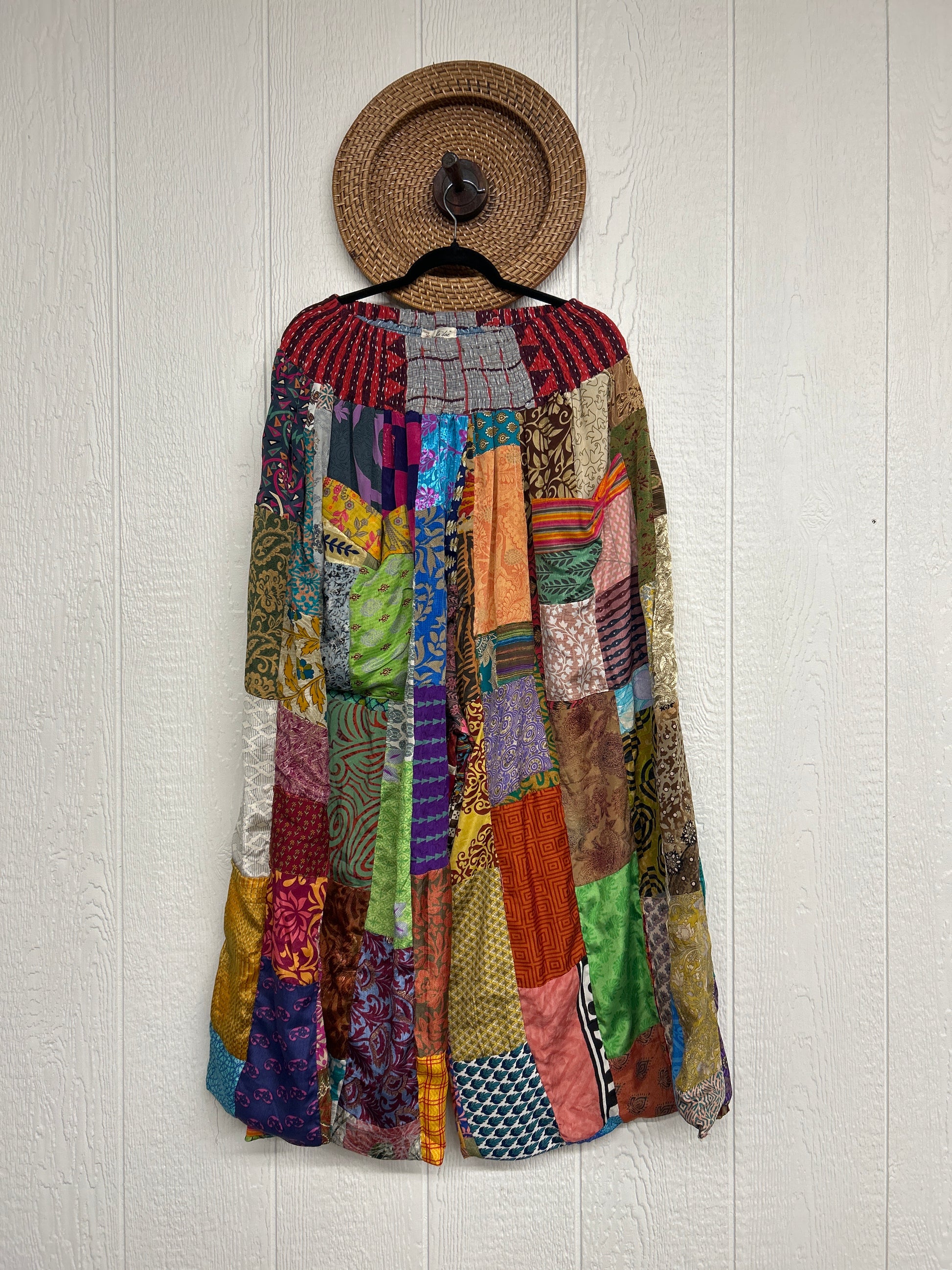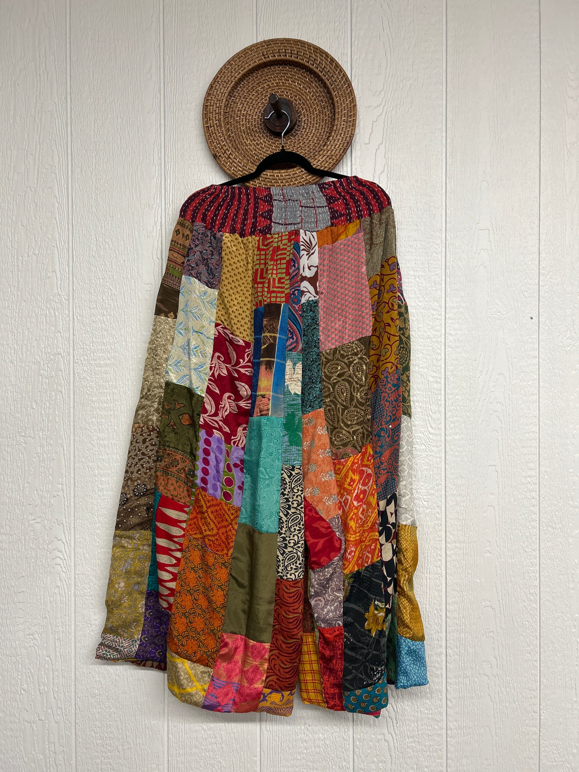 Features super wide legs that make your pants dance when you walk. Front slouchy pockets are deep enough to fill with your treasures. Vintage Rasgulla and Crepe Sari make up the beautiful patchwork featured on the outside with vintage cotton sari lining on the inside. Fully reversible and free size in all the ways!