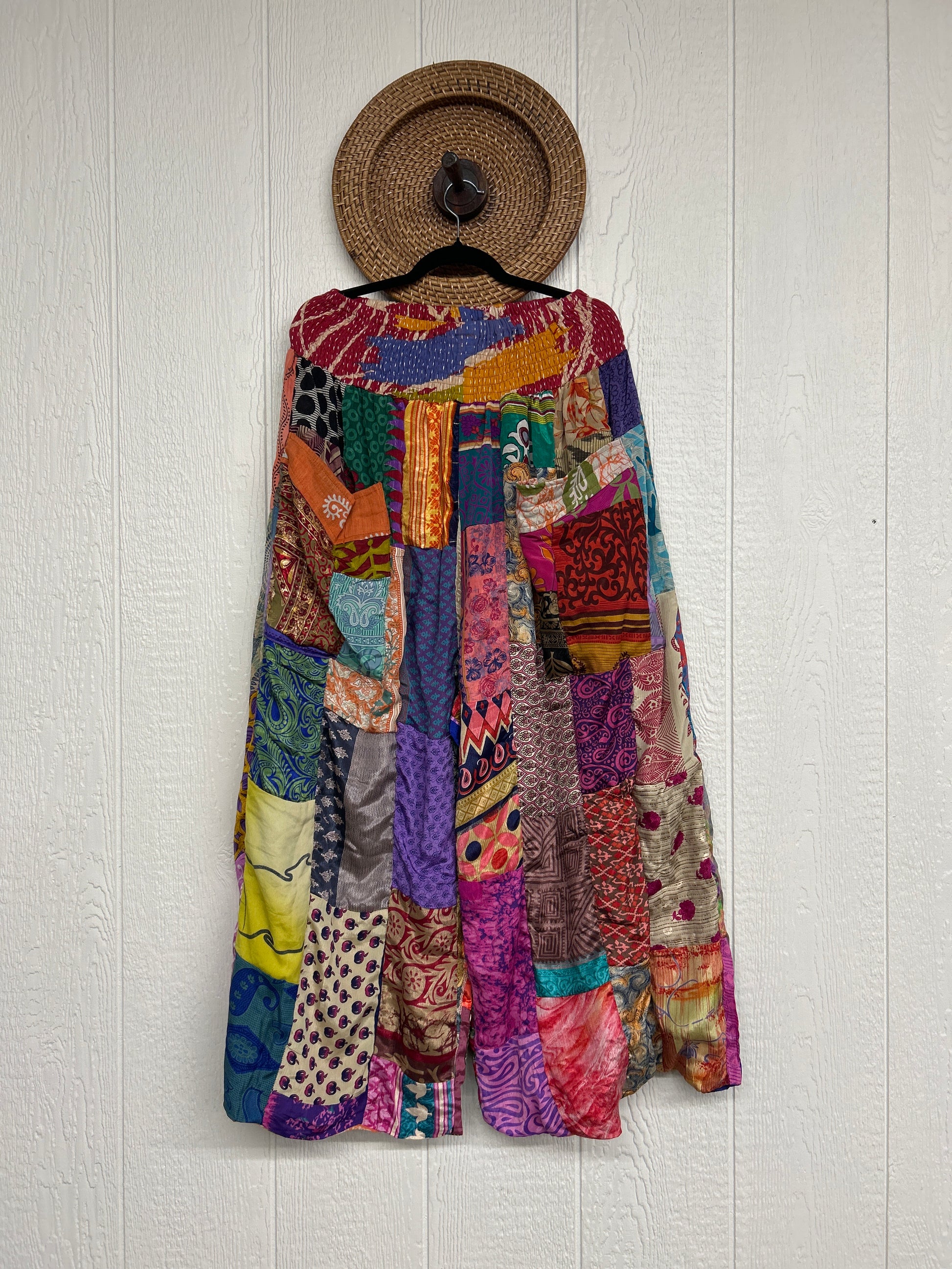 Features super wide legs that make your pants dance when you walk. Front slouchy pockets are deep enough to fill with your treasures. Vintage Rasgulla and Crepe Sari make up the beautiful patchwork featured on the outside with vintage cotton sari lining on the inside. Fully reversible and free size in all the ways!