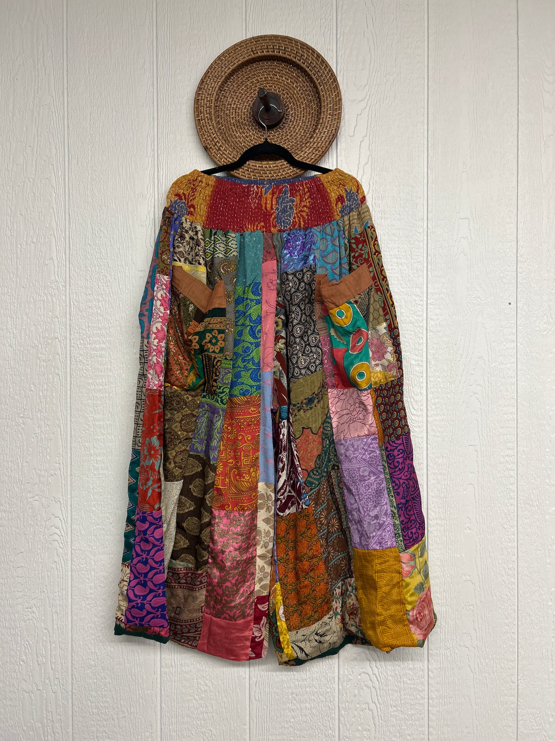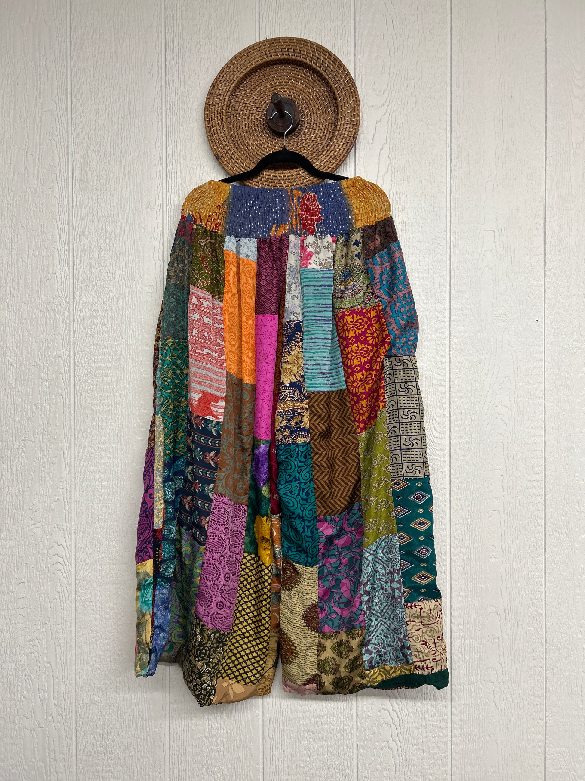 Features super wide legs that make your pants dance when you walk. Front slouchy pockets are deep enough to fill with your treasures. Vintage Rasgulla and Crepe Sari make up the beautiful patchwork featured on the outside with vintage cotton sari lining on the inside. Fully reversible and free size in all the ways!
