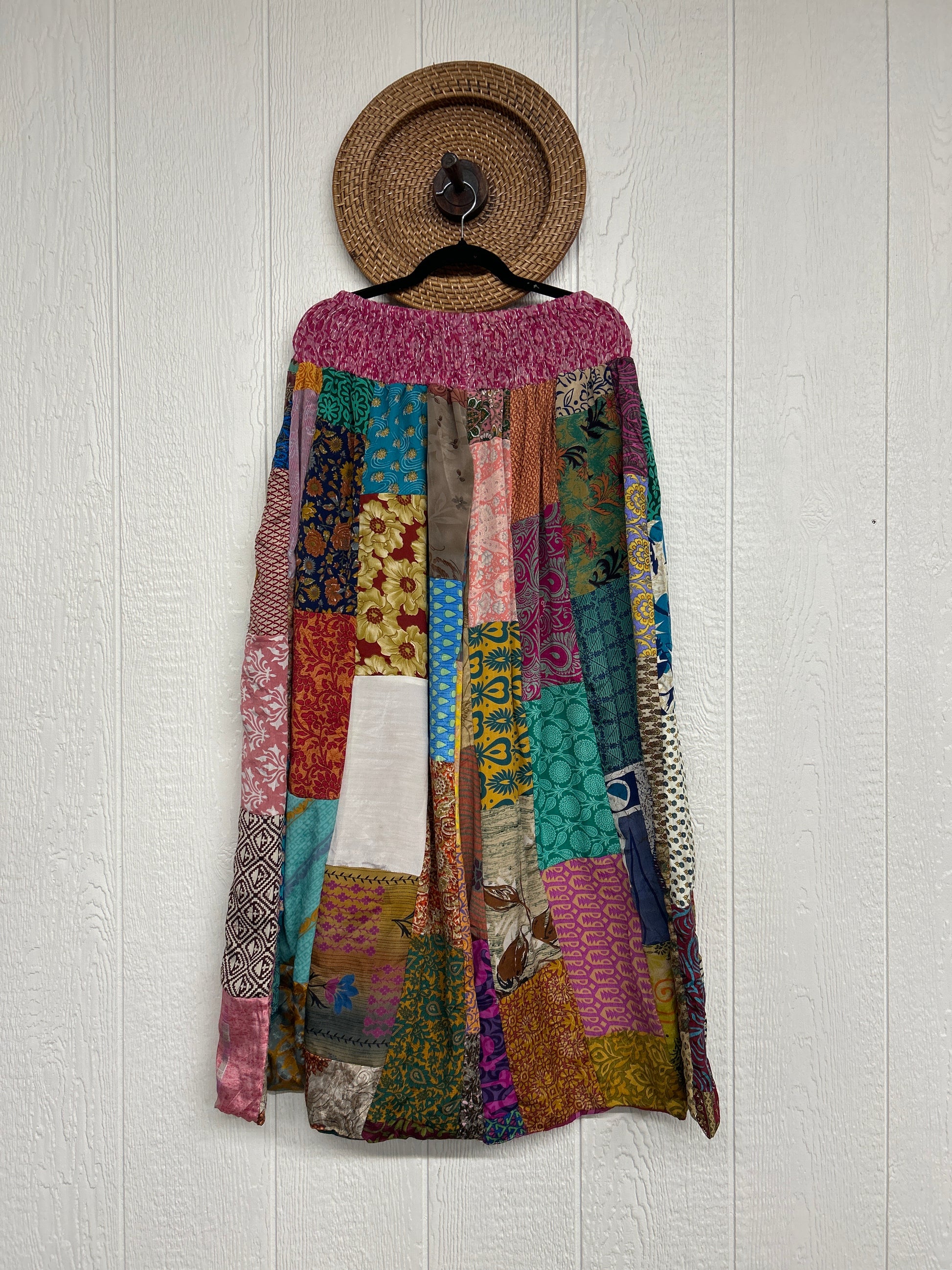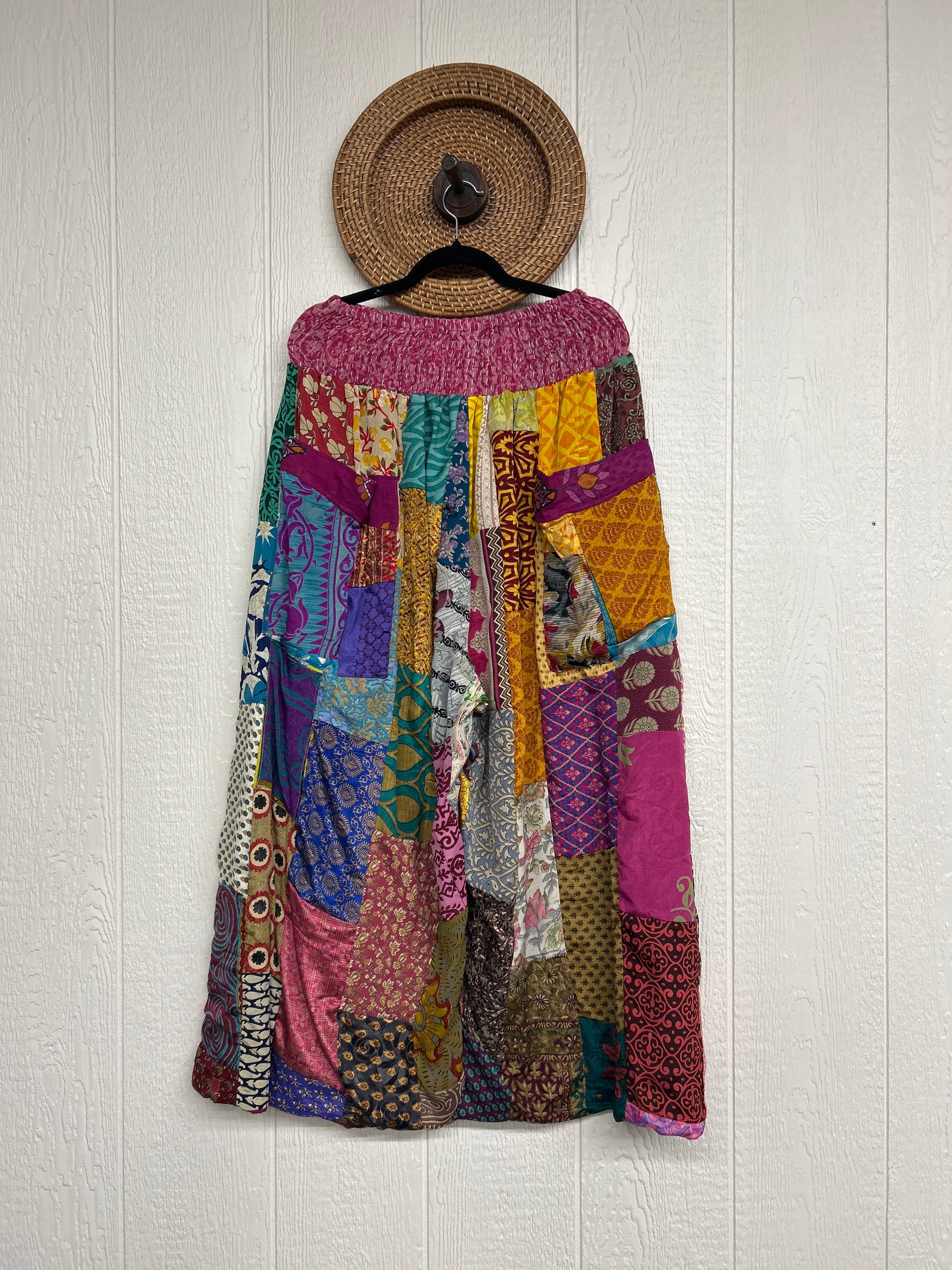 Features super wide legs that make your pants dance when you walk. Front slouchy pockets are deep enough to fill with your treasures. Vintage Rasgulla and Crepe Sari make up the beautiful patchwork featured on the outside with vintage cotton sari lining on the inside. Fully reversible and free size in all the ways!