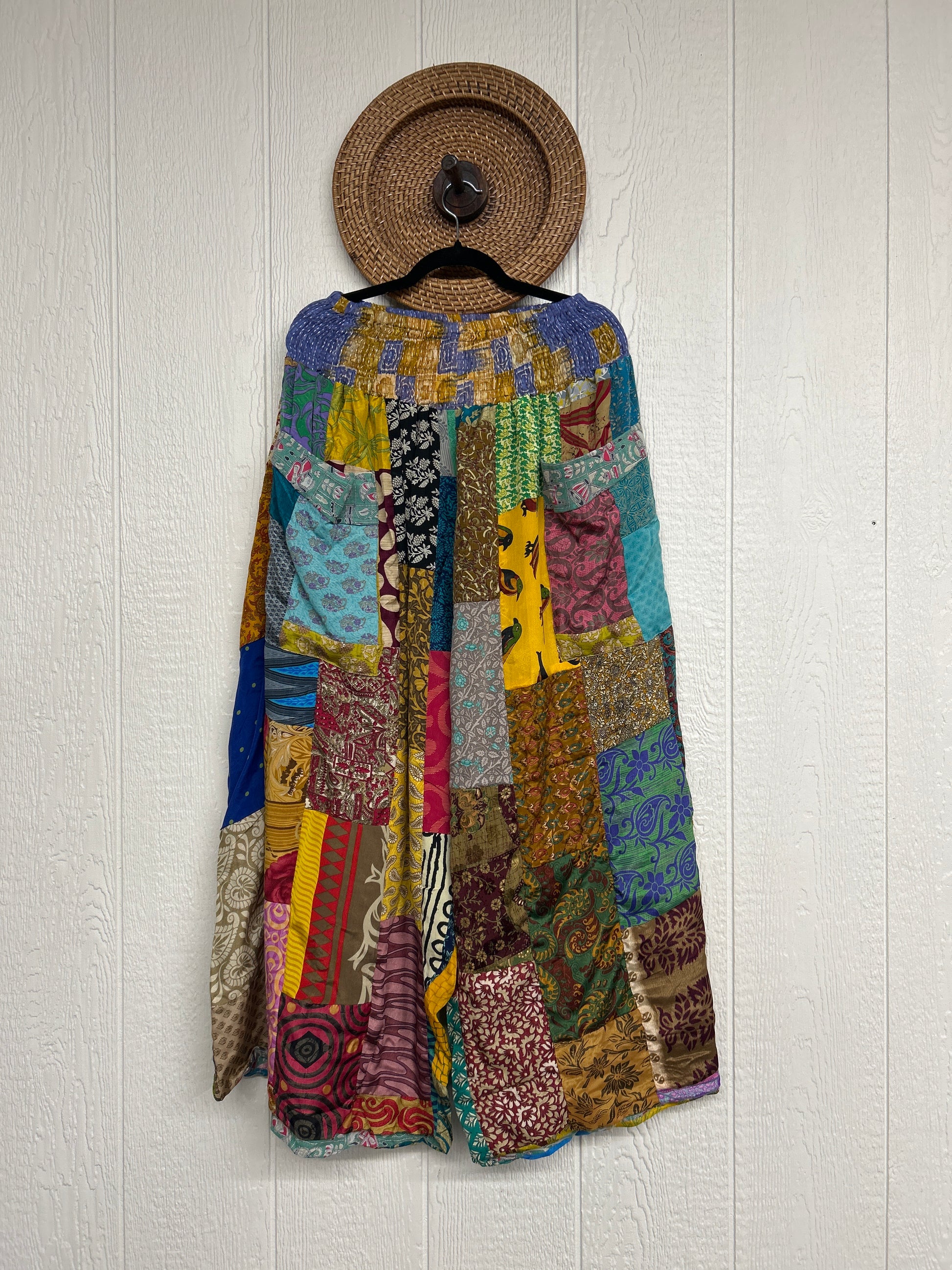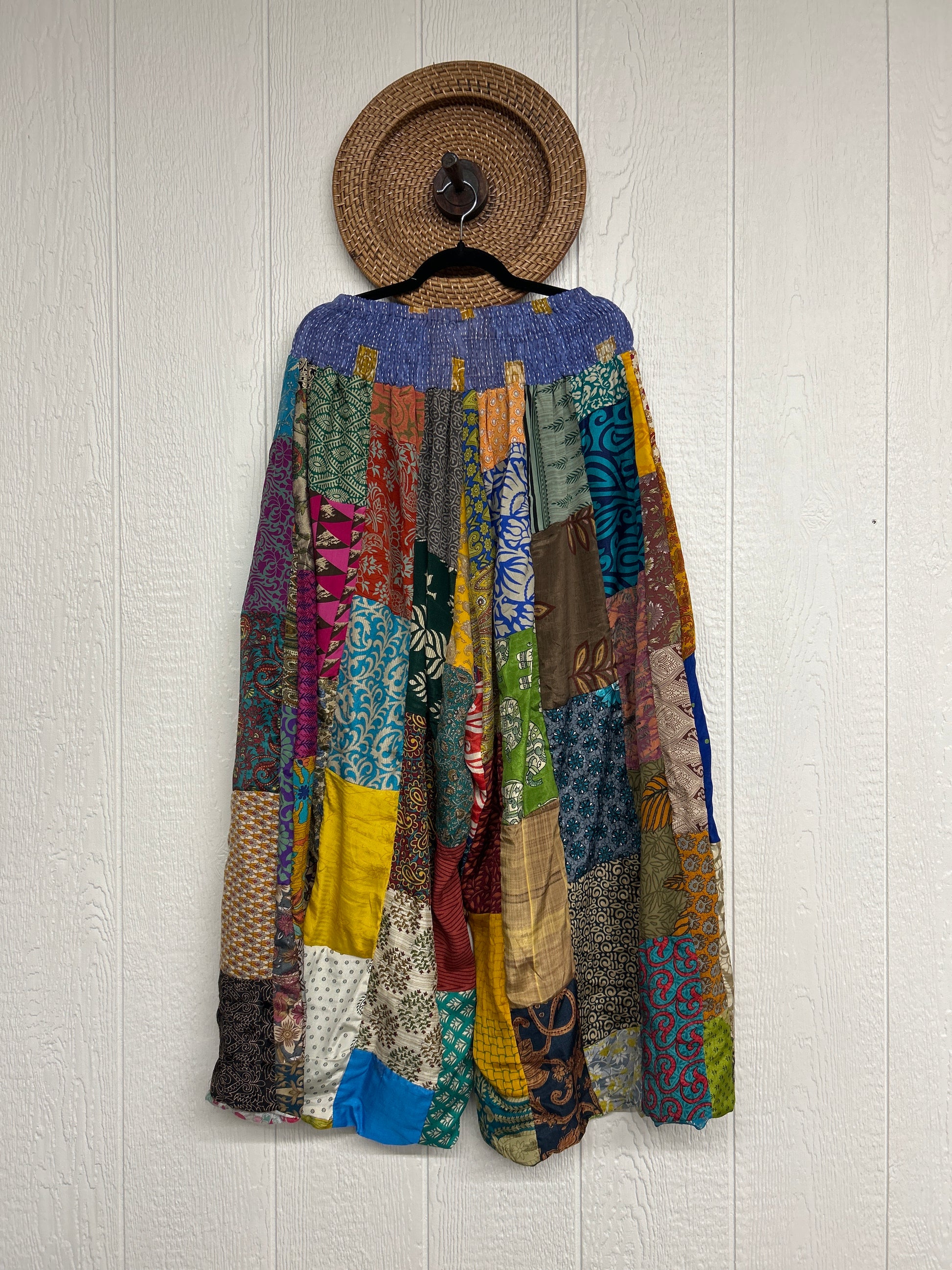 Features super wide legs that make your pants dance when you walk. Front slouchy pockets are deep enough to fill with your treasures. Vintage Rasgulla and Crepe Sari make up the beautiful patchwork featured on the outside with vintage cotton sari lining on the inside. Fully reversible and free size in all the ways!