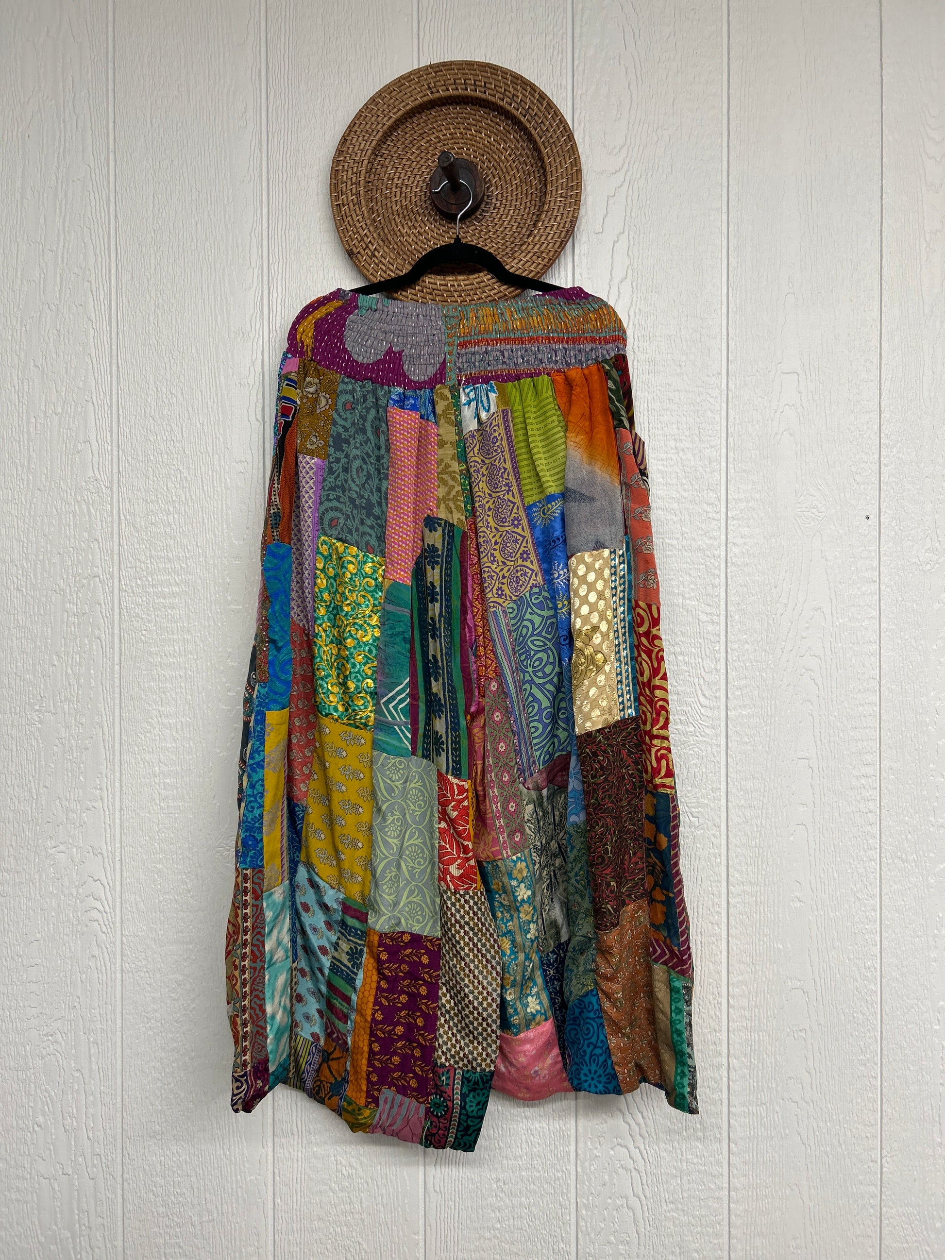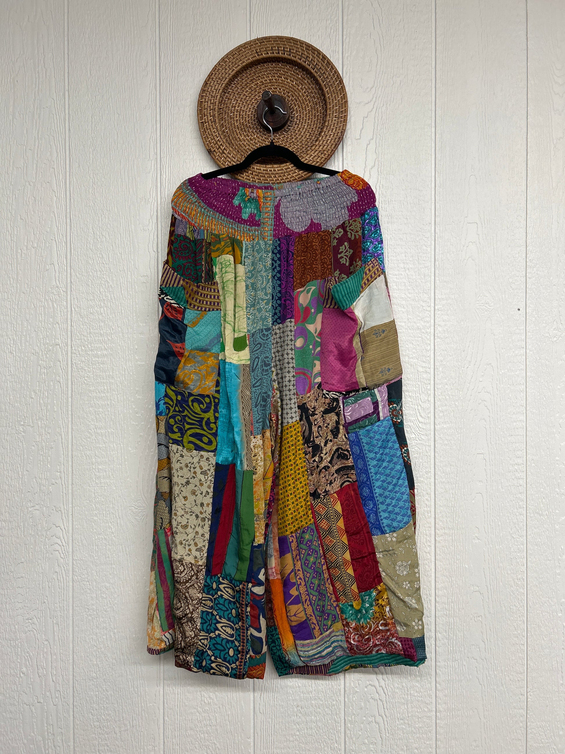 Features super wide legs that make your pants dance when you walk. Front slouchy pockets are deep enough to fill with your treasures. Vintage Rasgulla and Crepe Sari make up the beautiful patchwork featured on the outside with vintage cotton sari lining on the inside. Fully reversible and free size in all the ways!