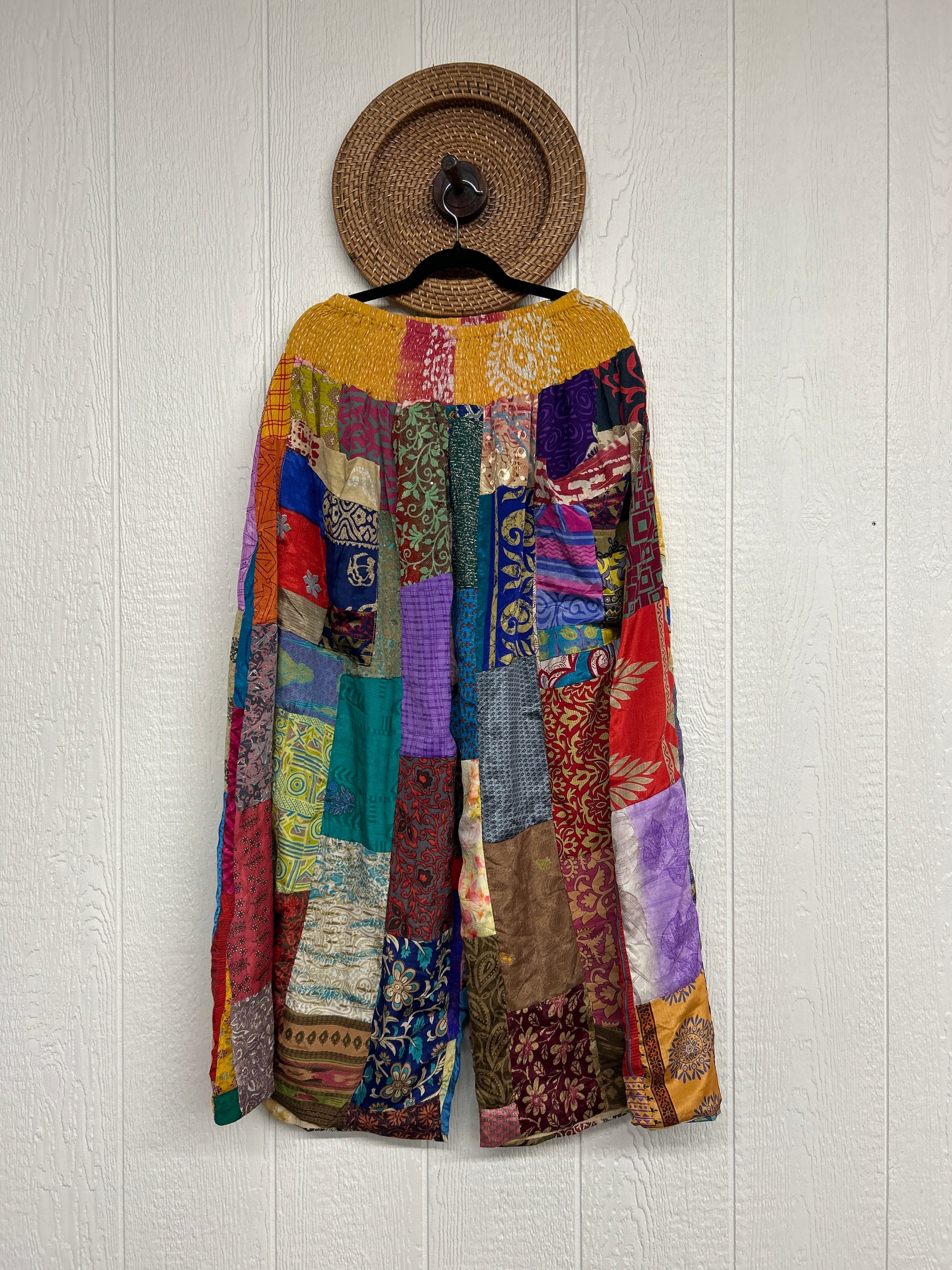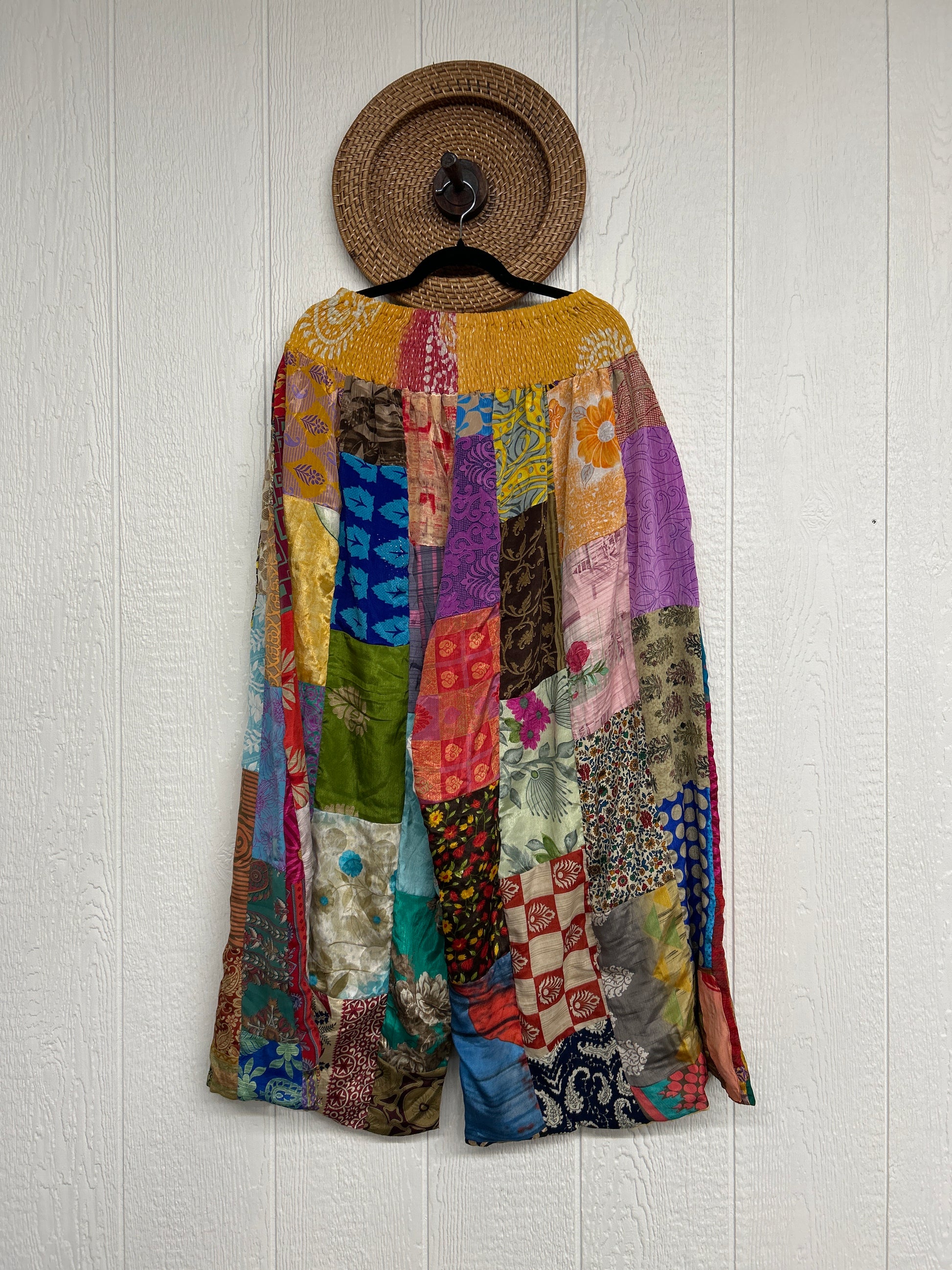 Features super wide legs that make your pants dance when you walk. Front slouchy pockets are deep enough to fill with your treasures. Vintage Rasgulla and Crepe Sari make up the beautiful patchwork featured on the outside with vintage cotton sari lining on the inside. Fully reversible and free size in all the ways!