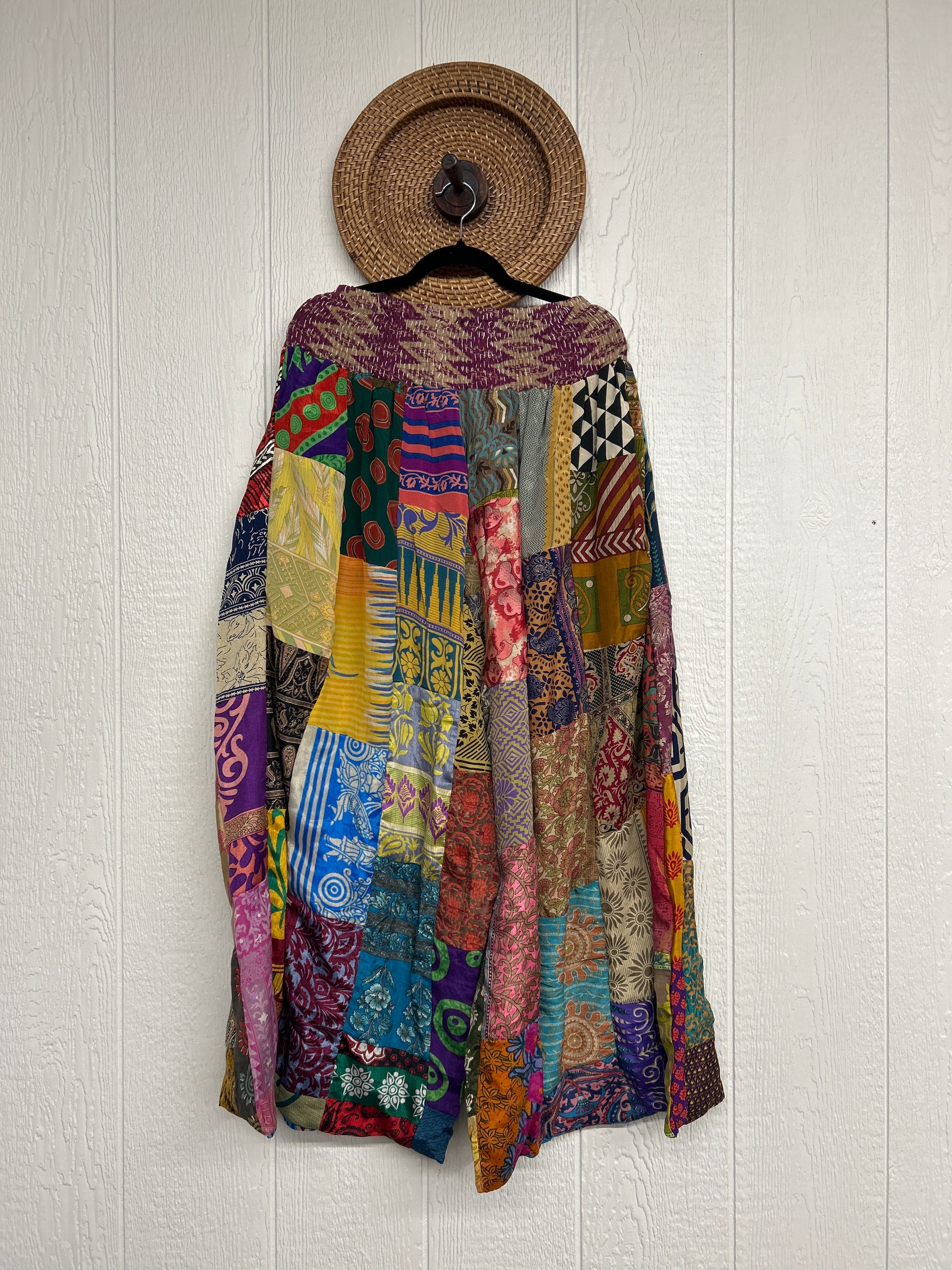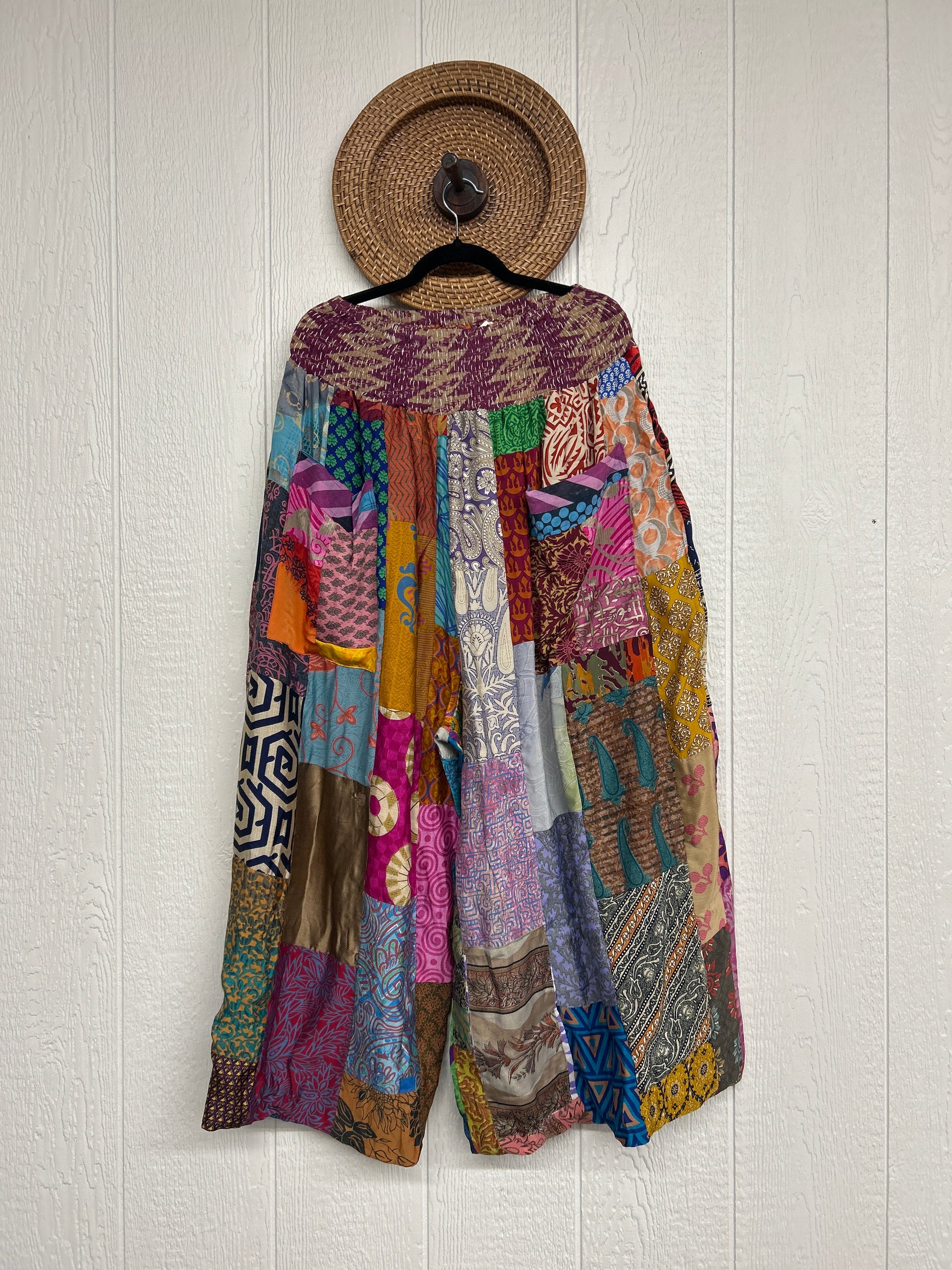 Features super wide legs that make your pants dance when you walk. Front slouchy pockets are deep enough to fill with your treasures. Vintage Rasgulla and Crepe Sari make up the beautiful patchwork featured on the outside with vintage cotton sari lining on the inside. Fully reversible and free size in all the ways!