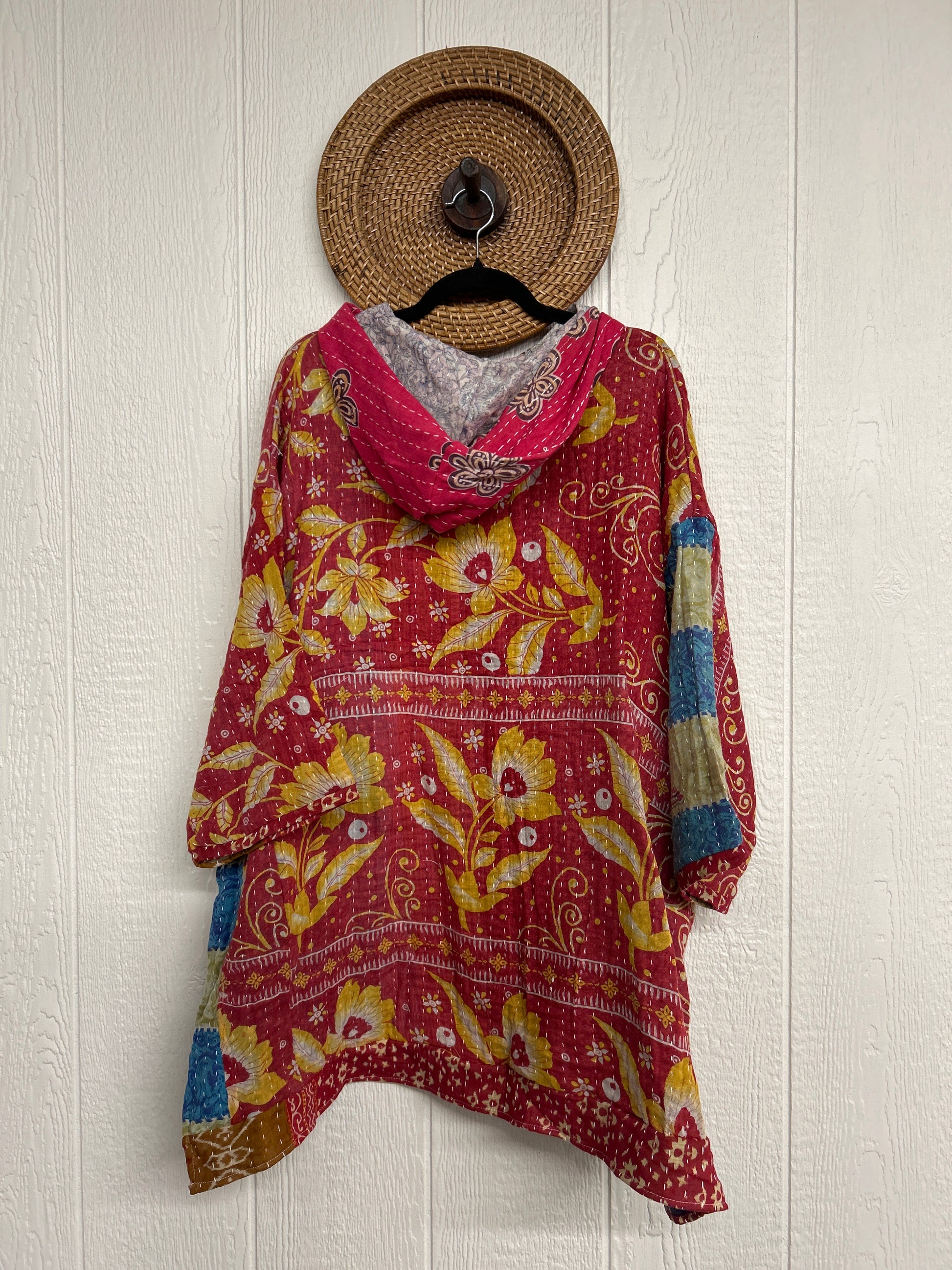 Crafted from koverlet kantha stitched cotton sari this slouchy hoodie features two exterior slouchy pockets for your treasures, a high low hem and hood.