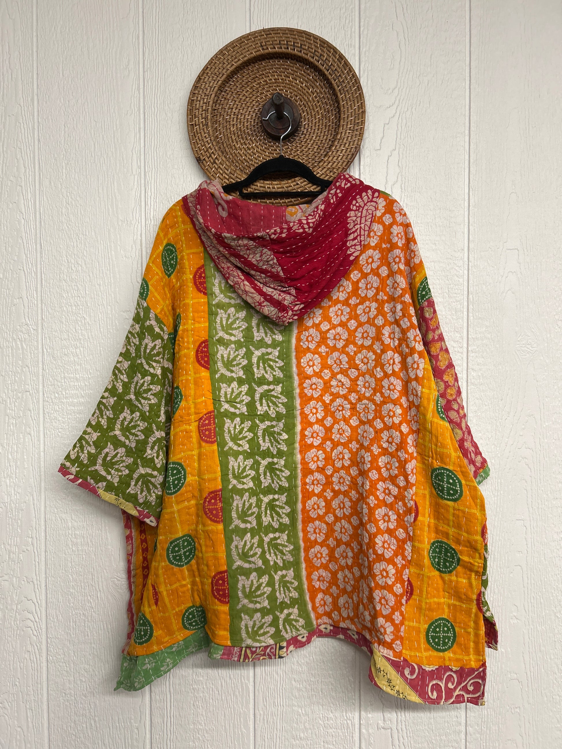 Crafted from koverlet kantha stitched cotton sari this slouchy hoodie features two exterior slouchy pockets for your treasures, a high low hem and hood.