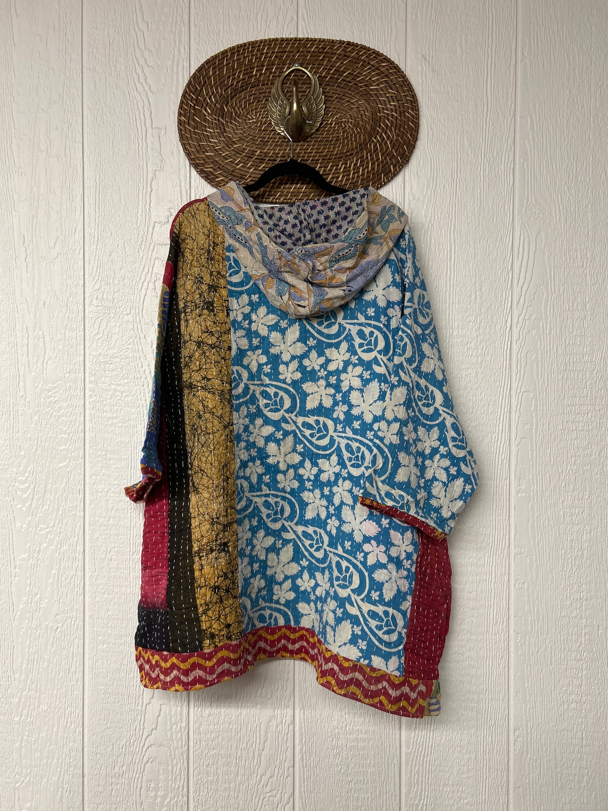 Crafted from koverlet kantha stitched cotton sari this slouchy hoodie features two exterior slouchy pockets for your treasures, a high low hem and hood.