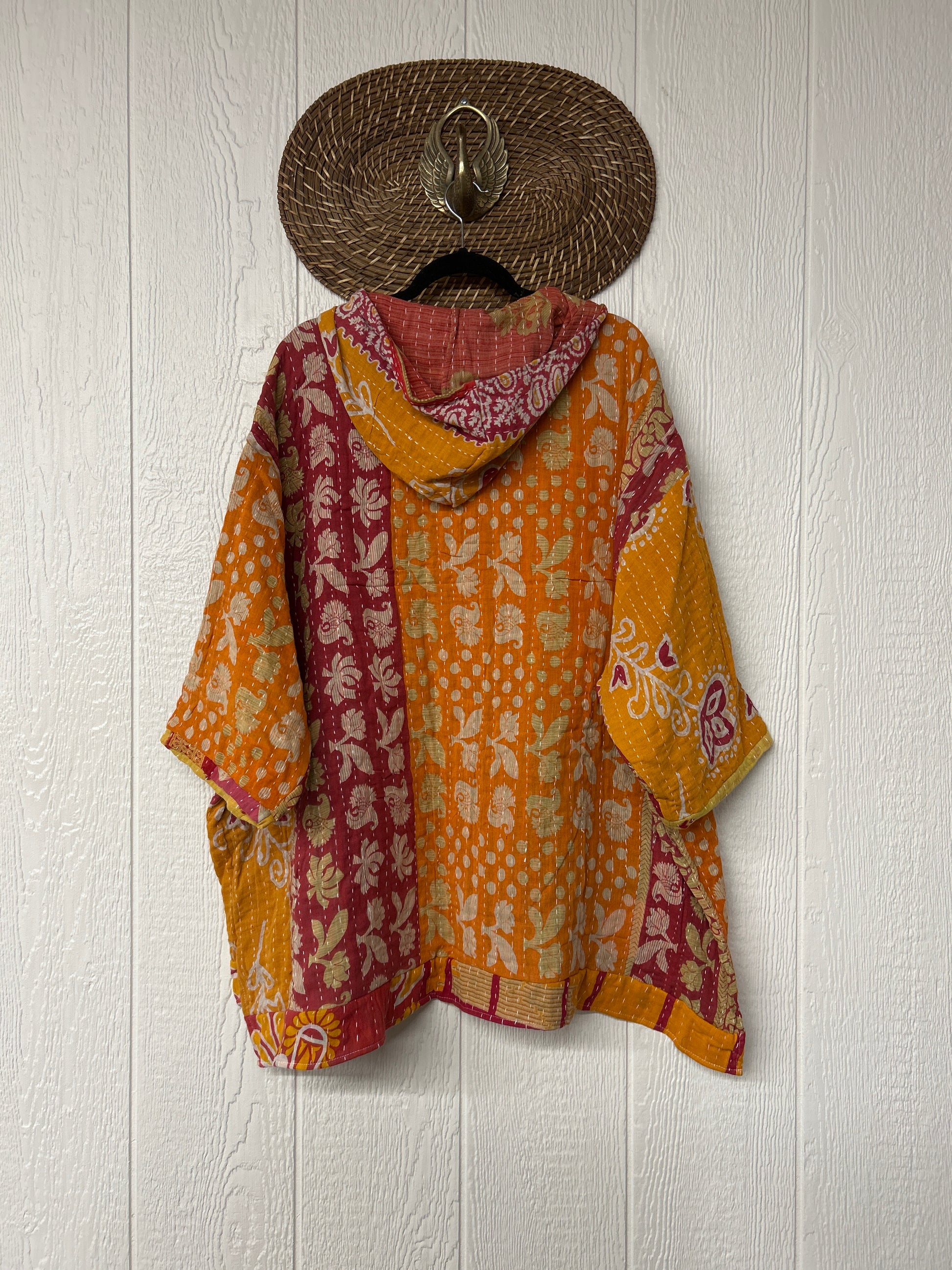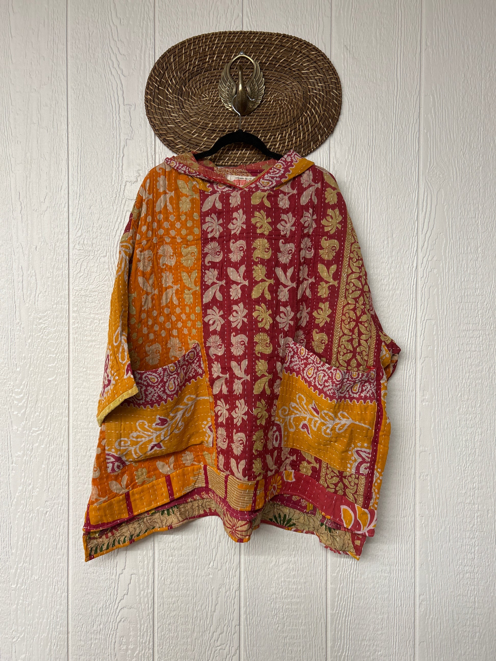 Crafted from koverlet kantha stitched cotton sari this slouchy hoodie features two exterior slouchy pockets for your treasures, a high low hem and hood.