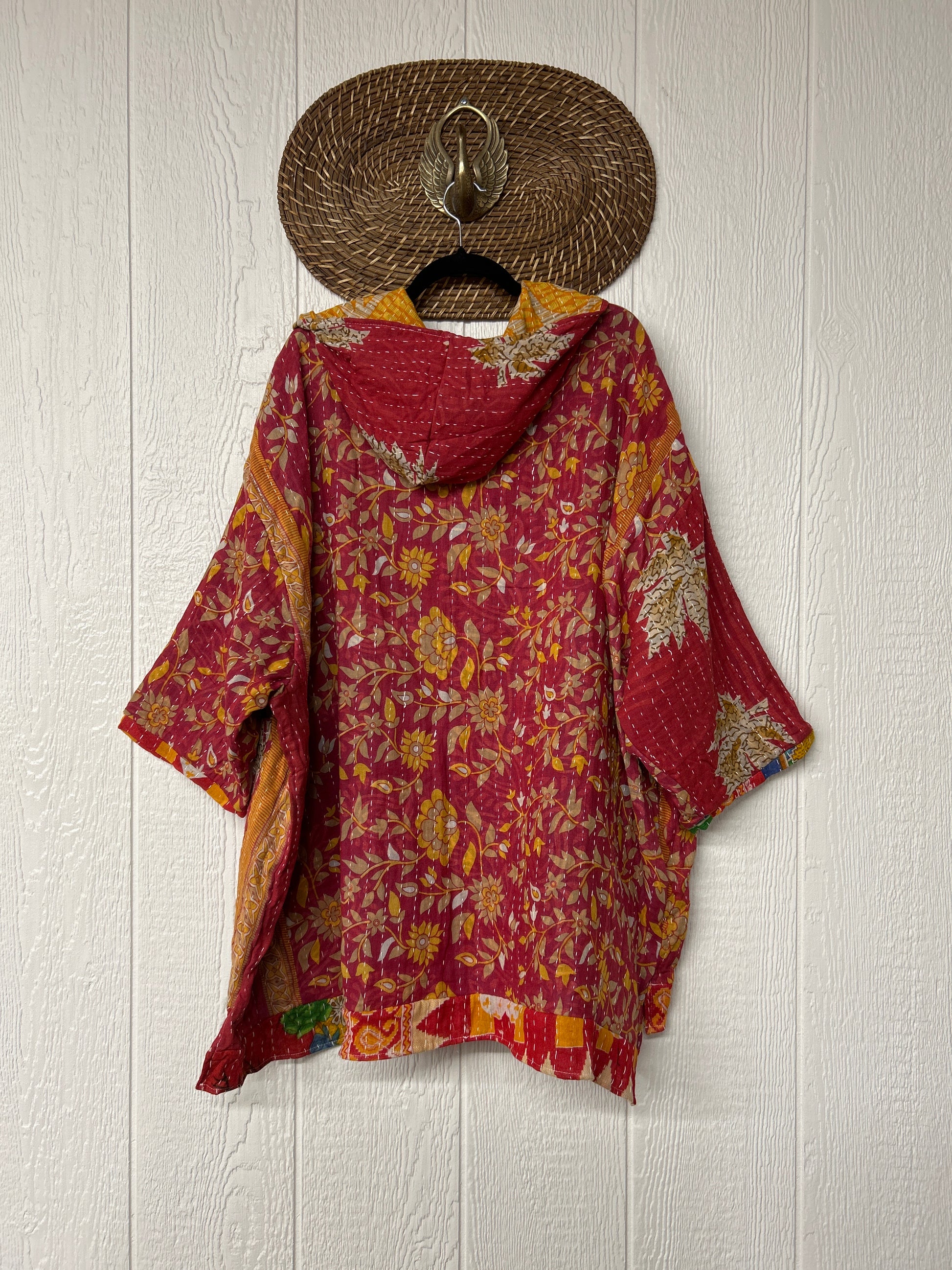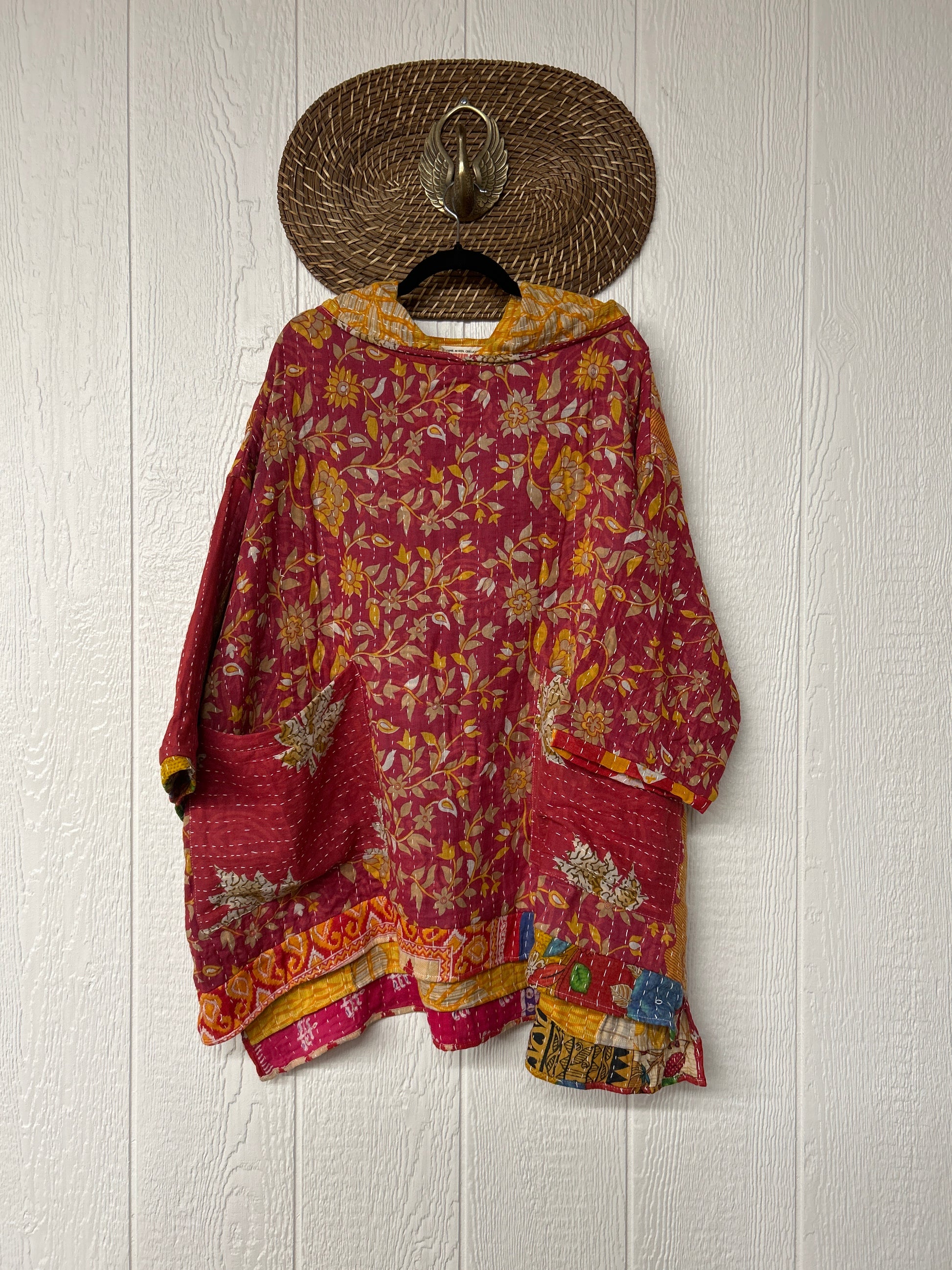 Crafted from koverlet kantha stitched cotton sari this slouchy hoodie features two exterior slouchy pockets for your treasures, a high low hem and hood.