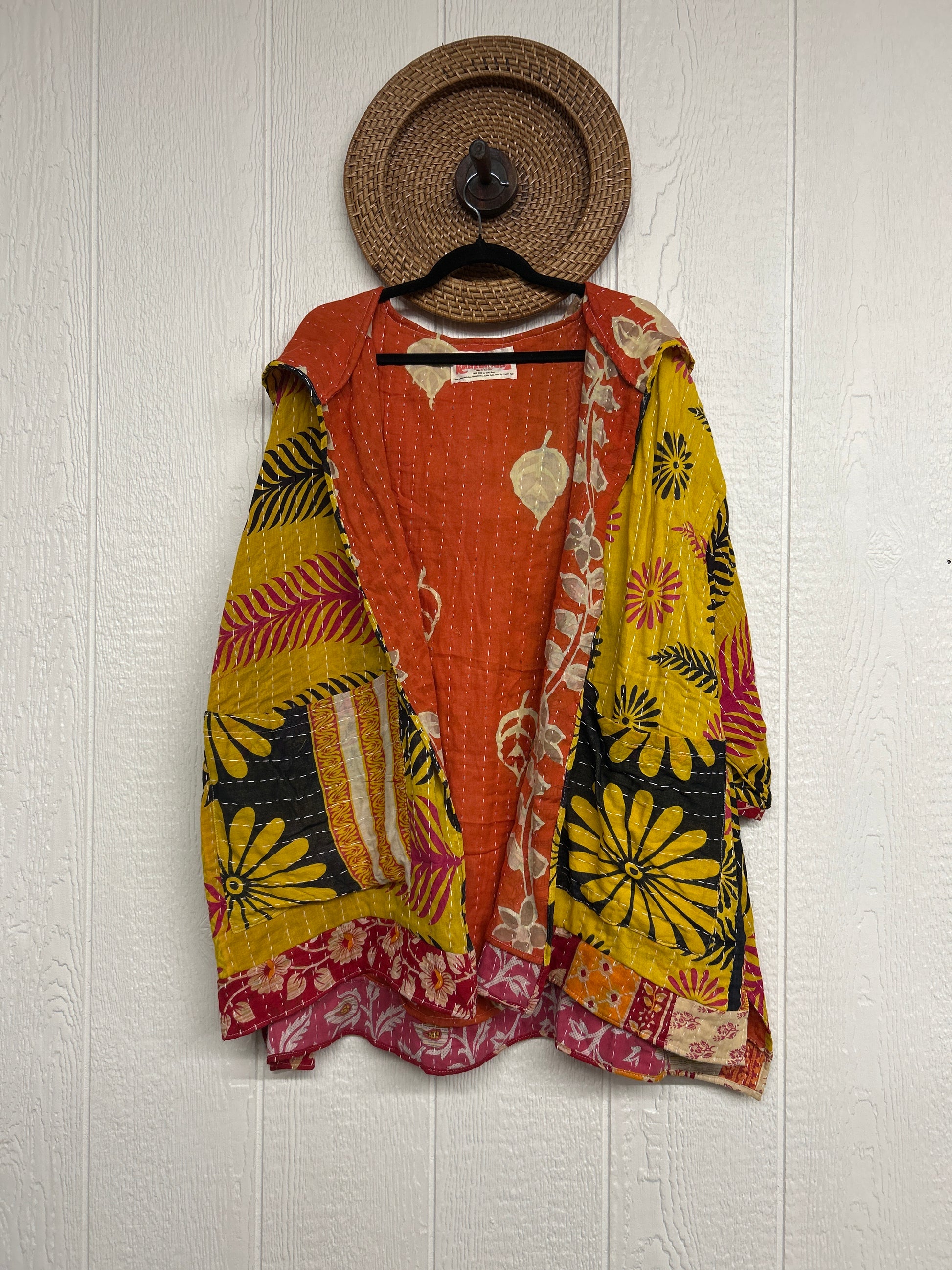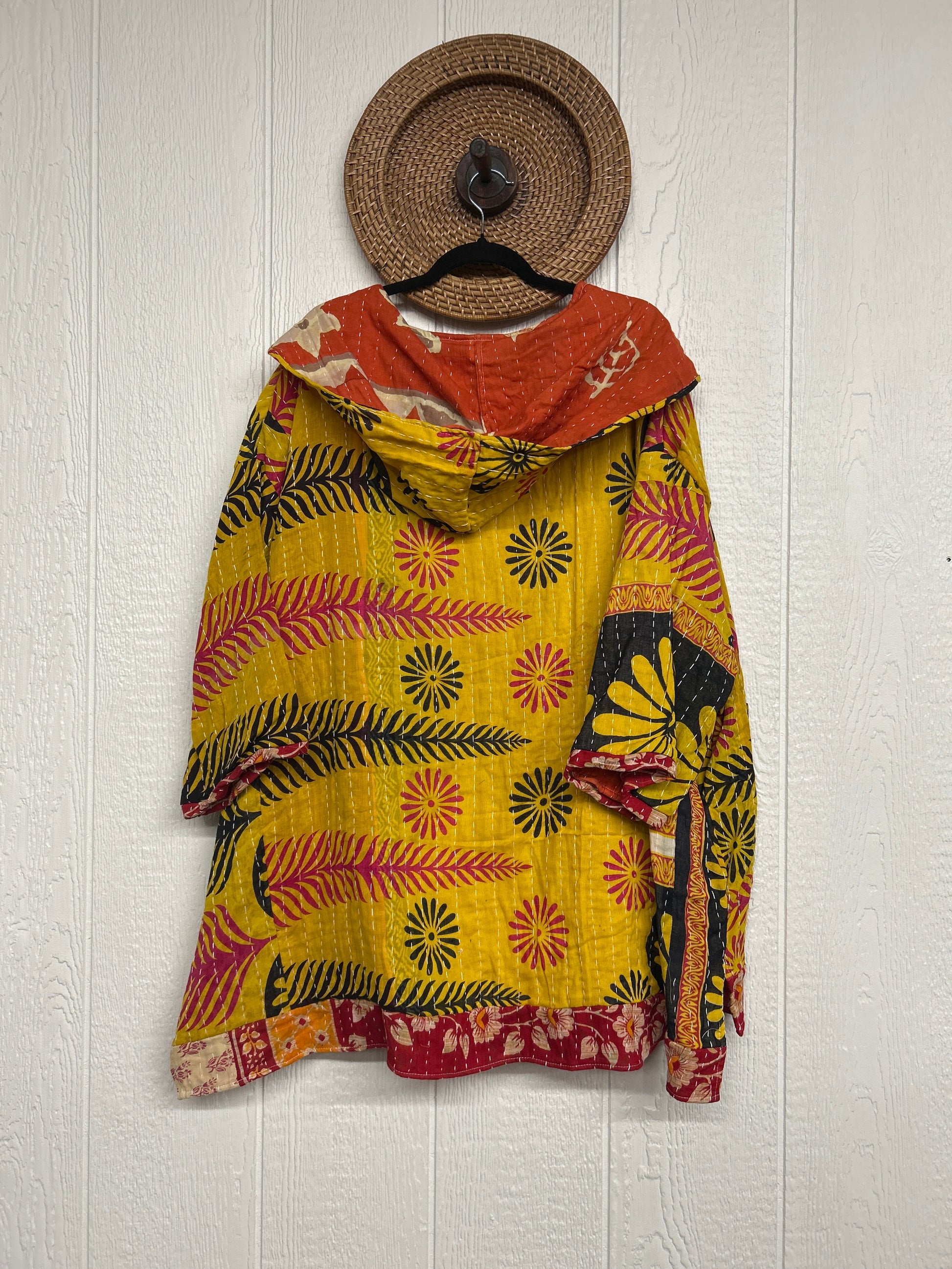Crafted from koverlet kantha stitched cotton sari this slouchy hoodie features two exterior slouchy pockets for your treasures, a high low hem, hood, and open front for layering versatility.