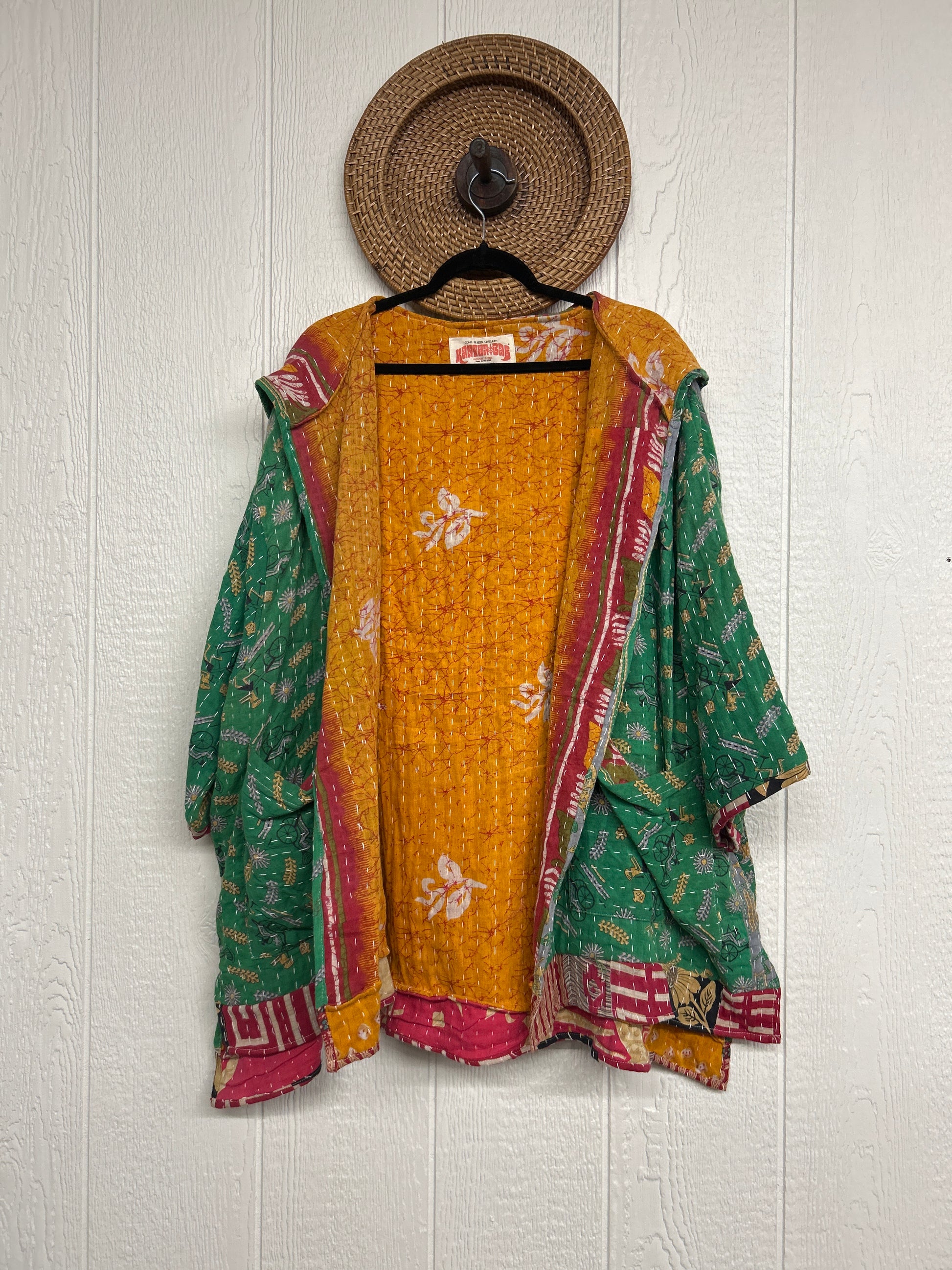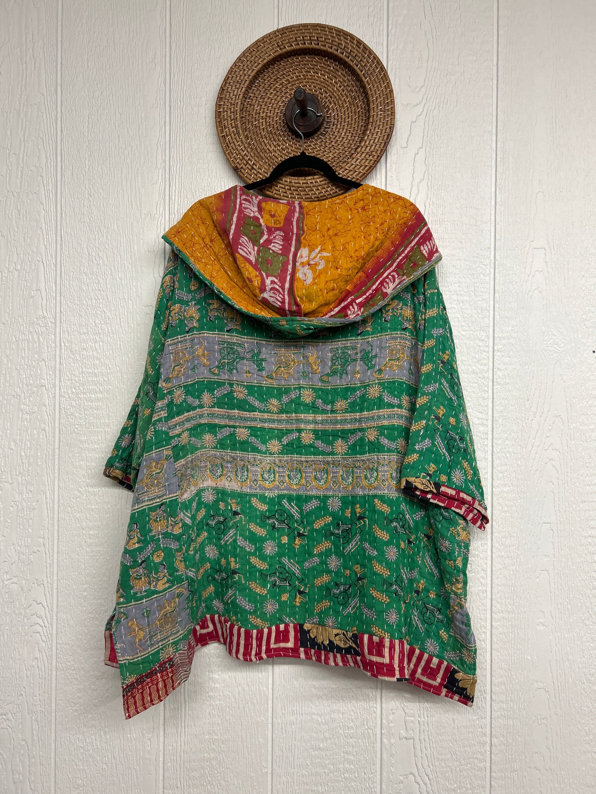 Crafted from koverlet kantha stitched cotton sari this slouchy hoodie features two exterior slouchy pockets for your treasures, a high low hem, hood, and open front for layering versatility.