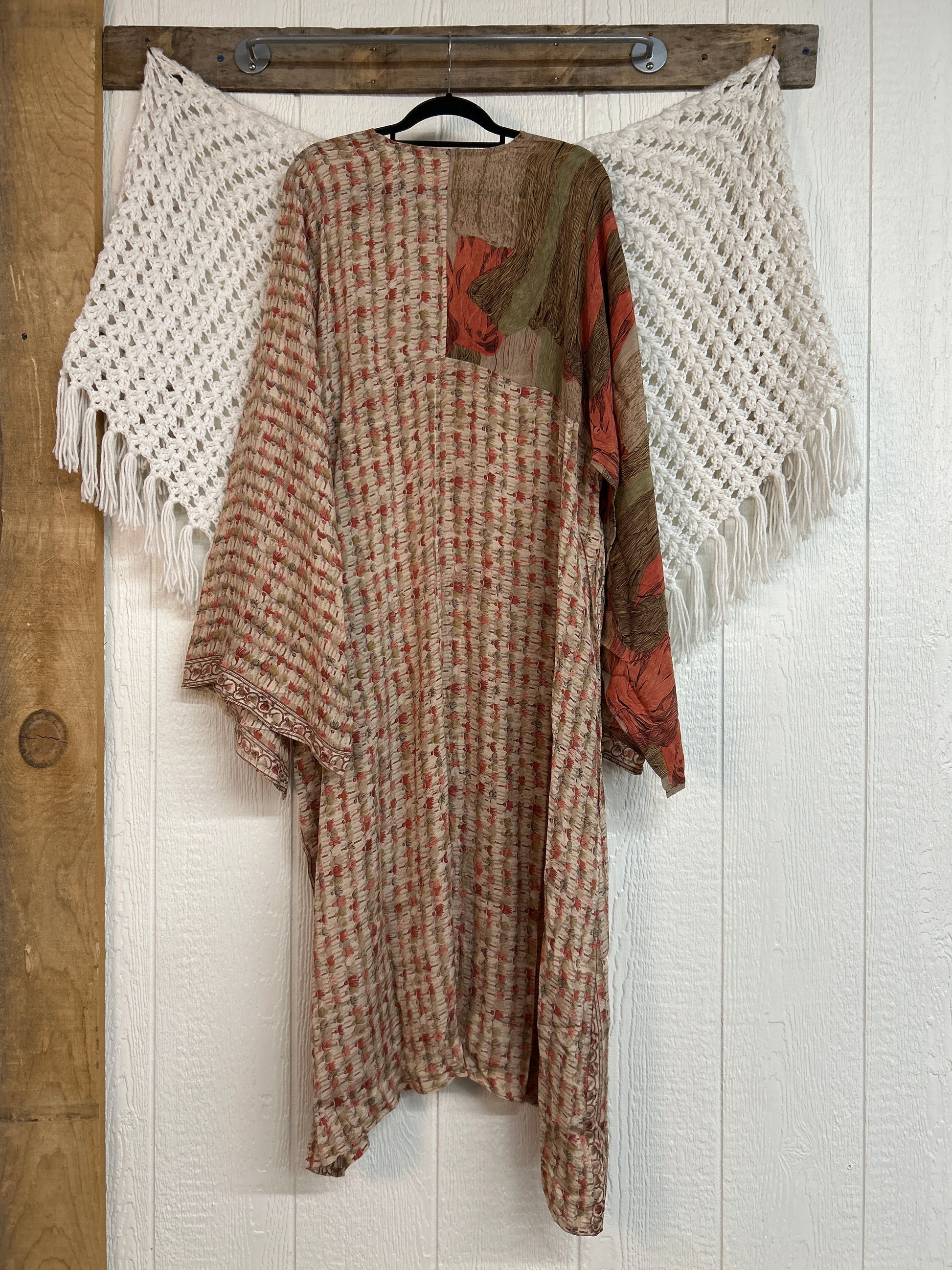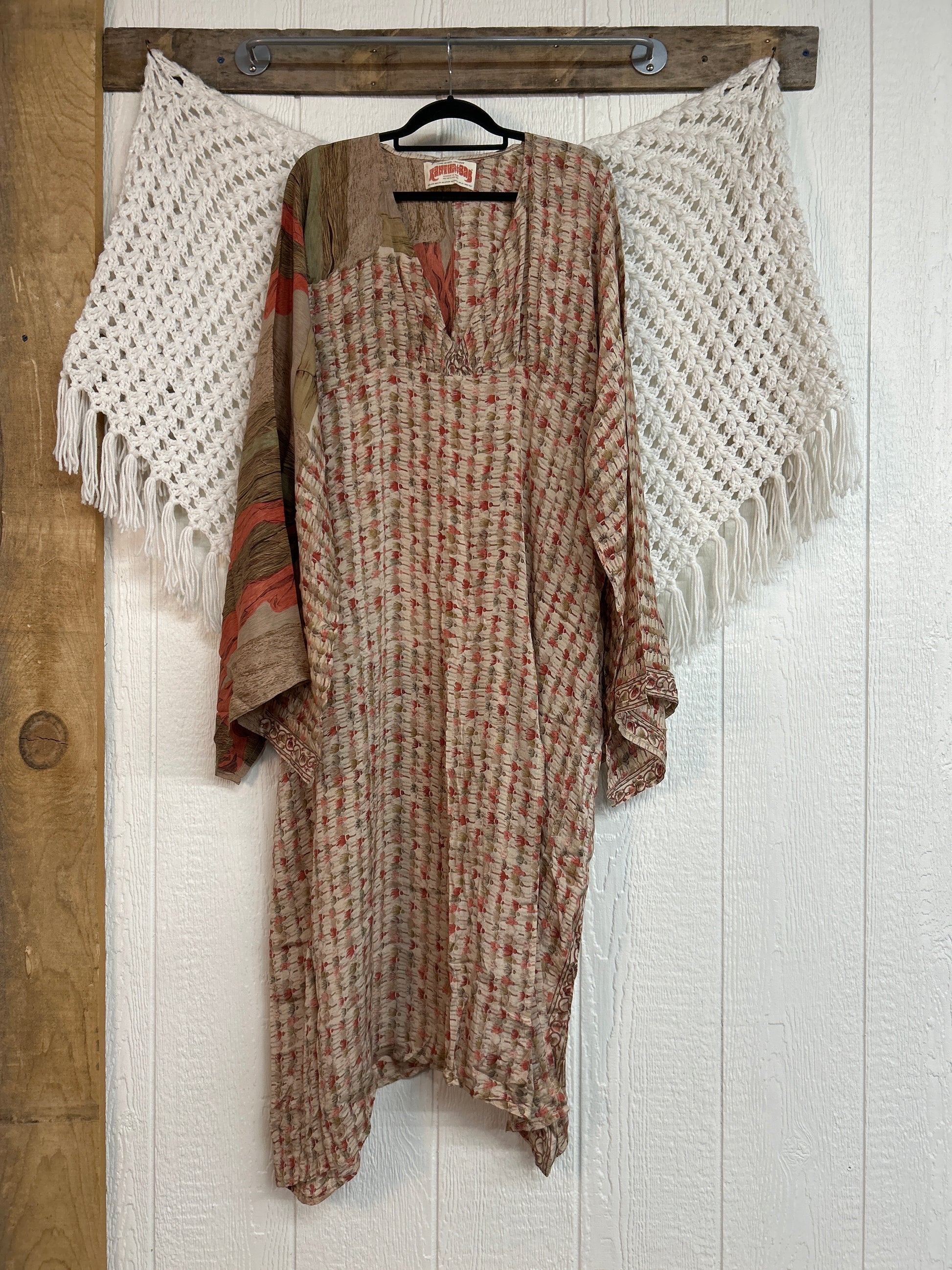 Crafted from our ultra lux vintage crepe sari this floaty dream features wide bell sleeves, deep v neckline, maxi silhouette with side slits for extra dimension.