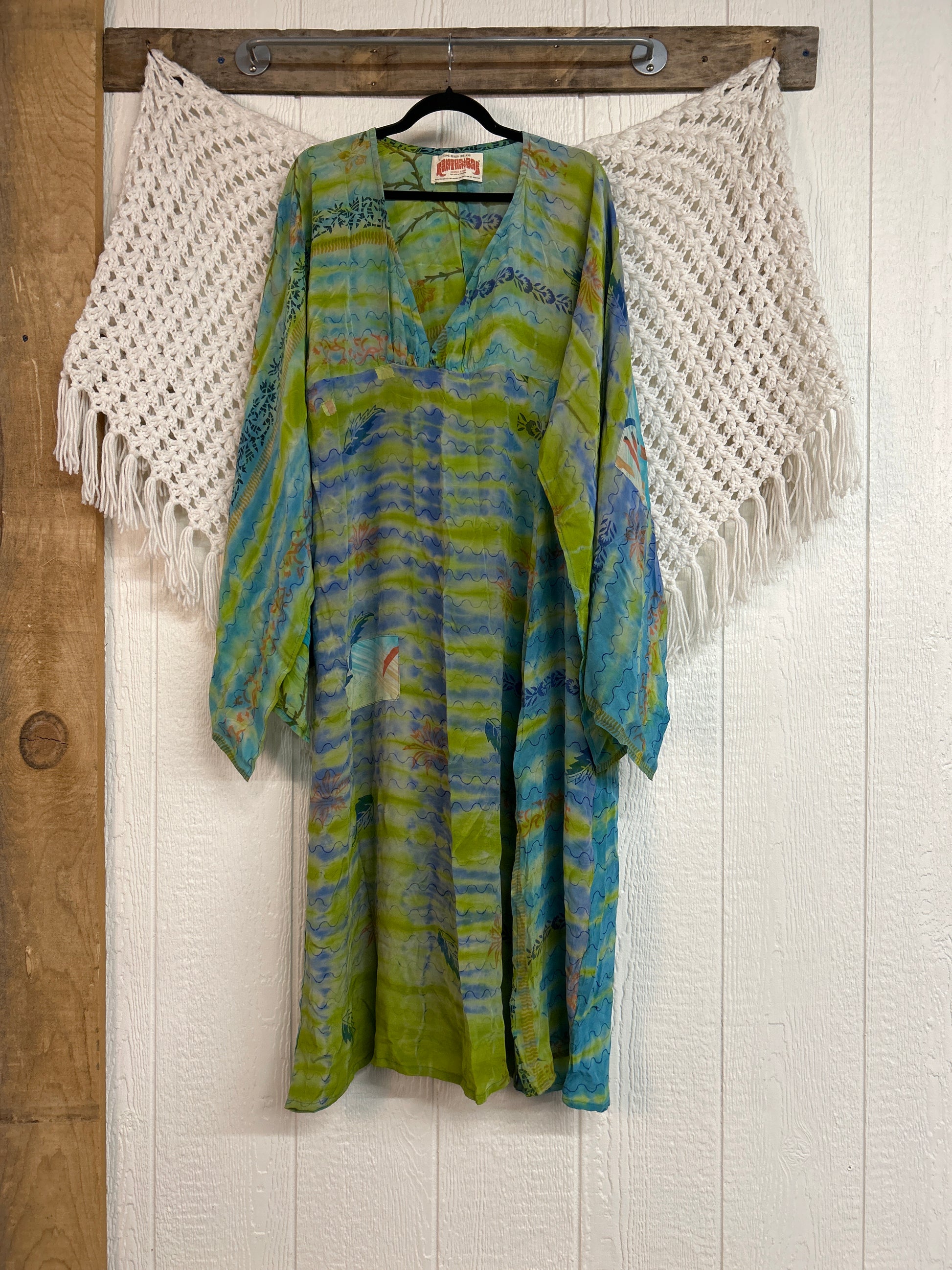 Crafted from our ultra lux vintage crepe sari this floaty dream features wide bell sleeves, deep v neckline, maxi silhouette with side slits for extra dimension.