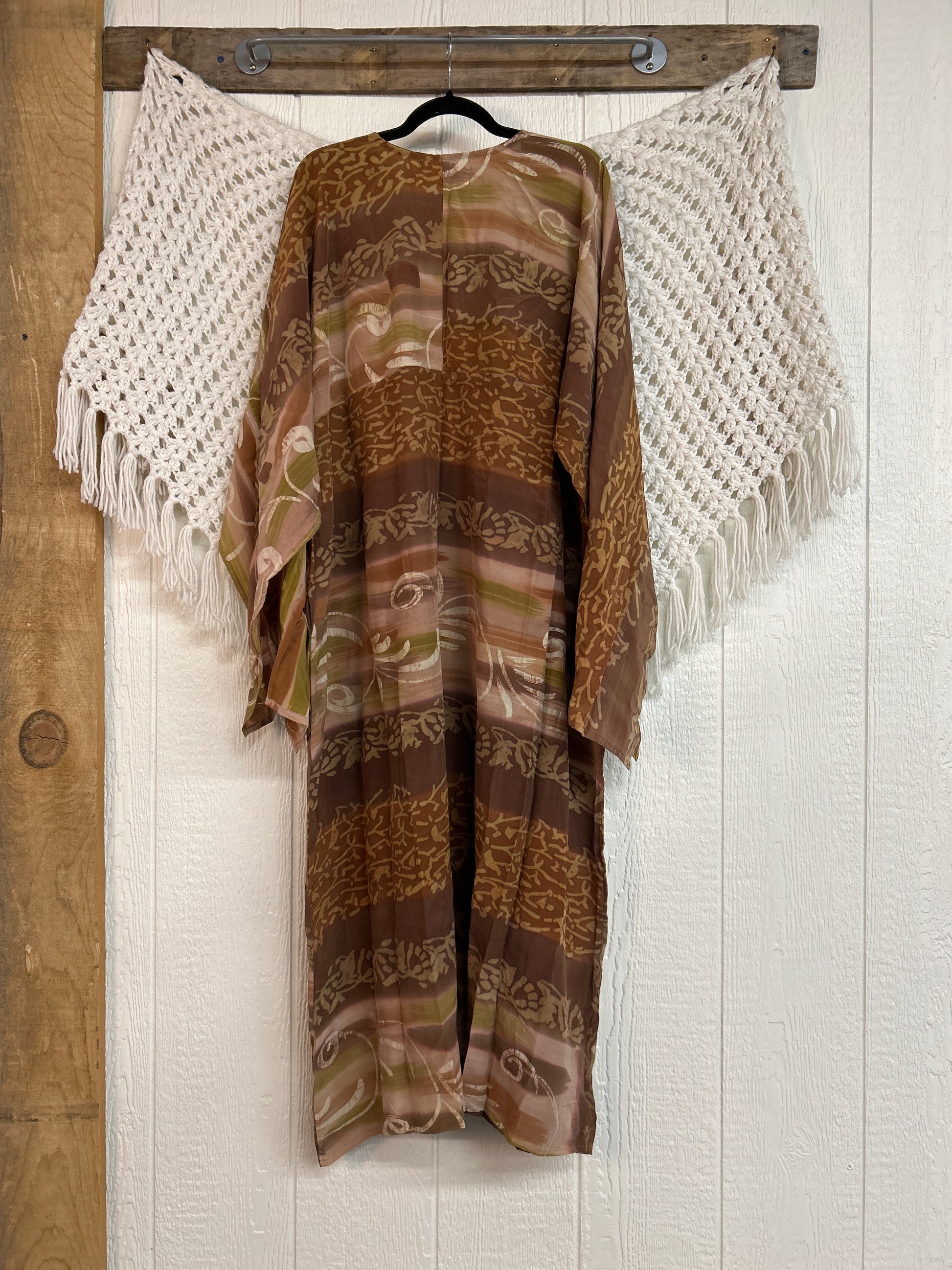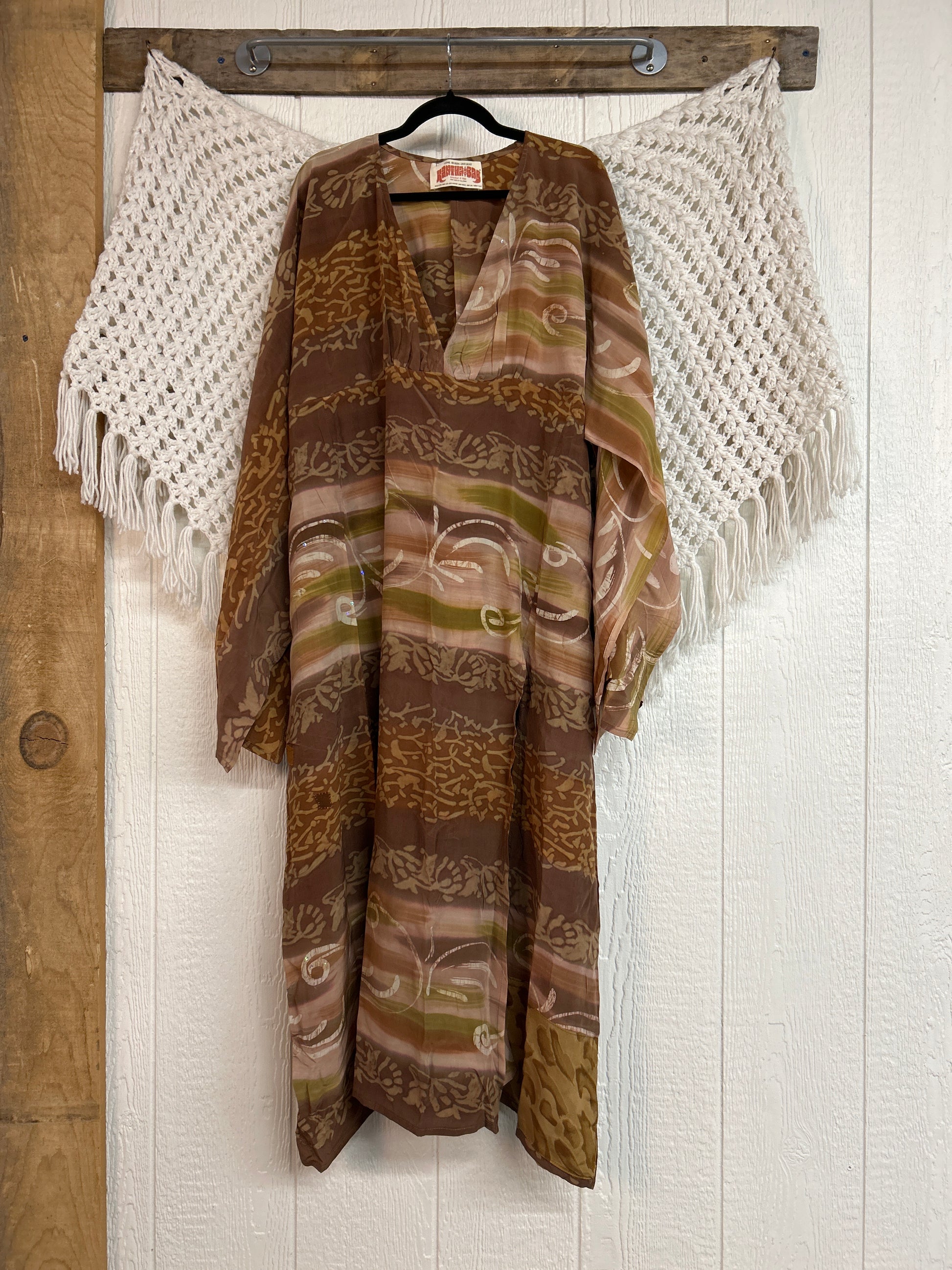 Crafted from our ultra lux vintage crepe sari this floaty dream features wide bell sleeves, deep v neckline, maxi silhouette with side slits for extra dimension.