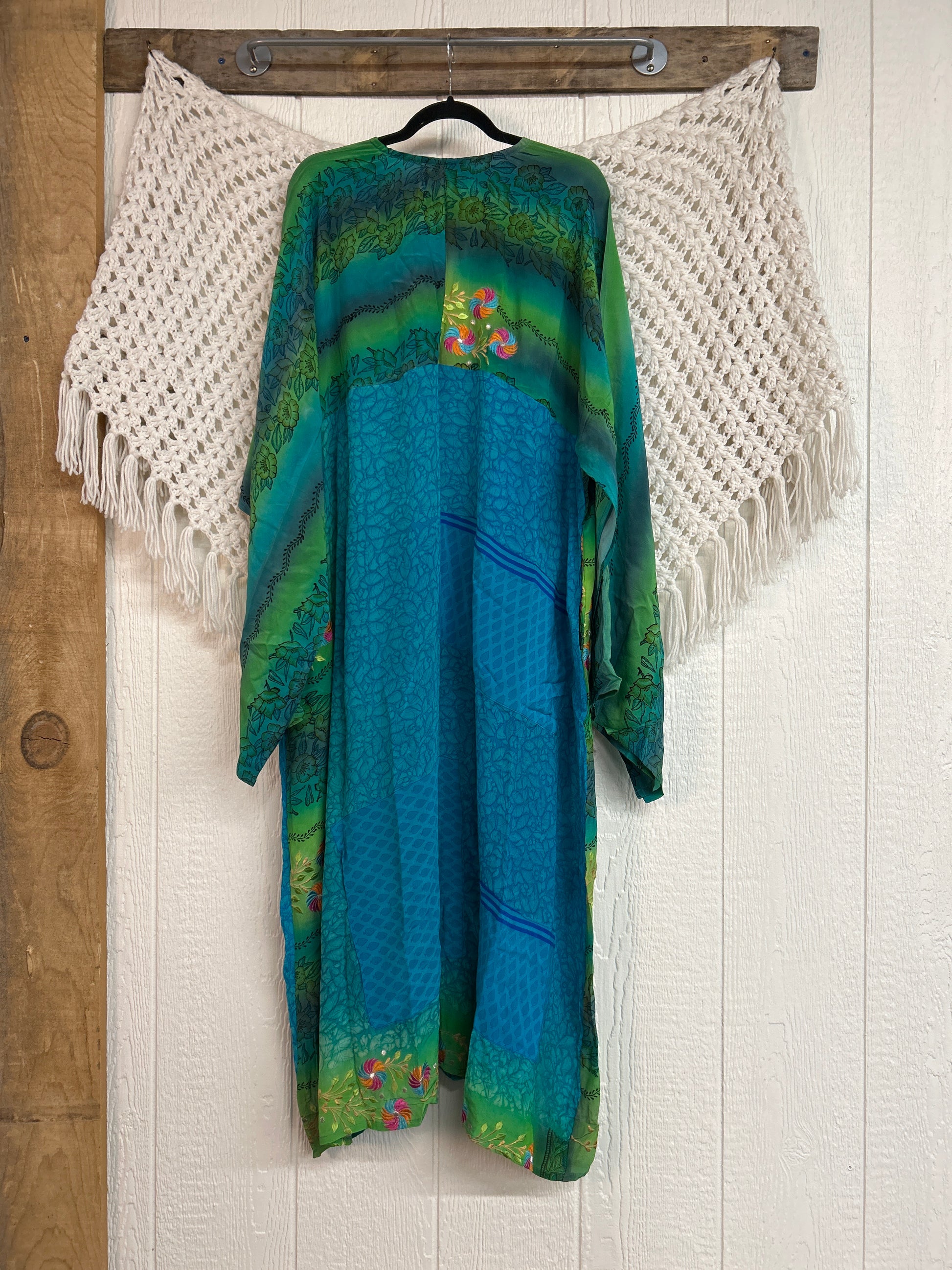 Crafted from our ultra lux vintage crepe sari this floaty dream features wide bell sleeves, deep v neckline, maxi silhouette with side slits for extra dimension.