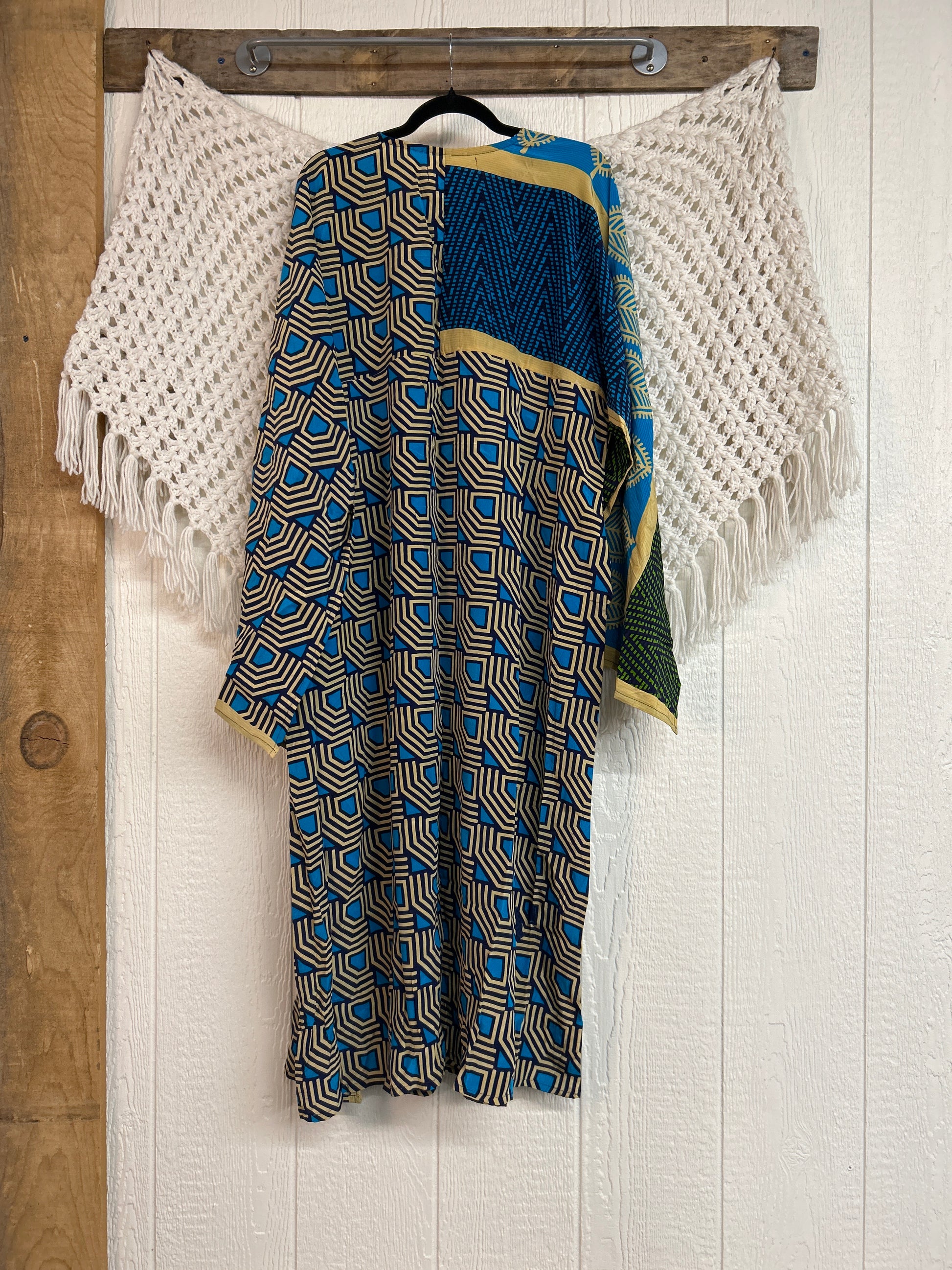 Fabrics may have small threads or holes in the layers. Color inconsistency or small stains may be present. The saris are sewn together and extend the life of each design.