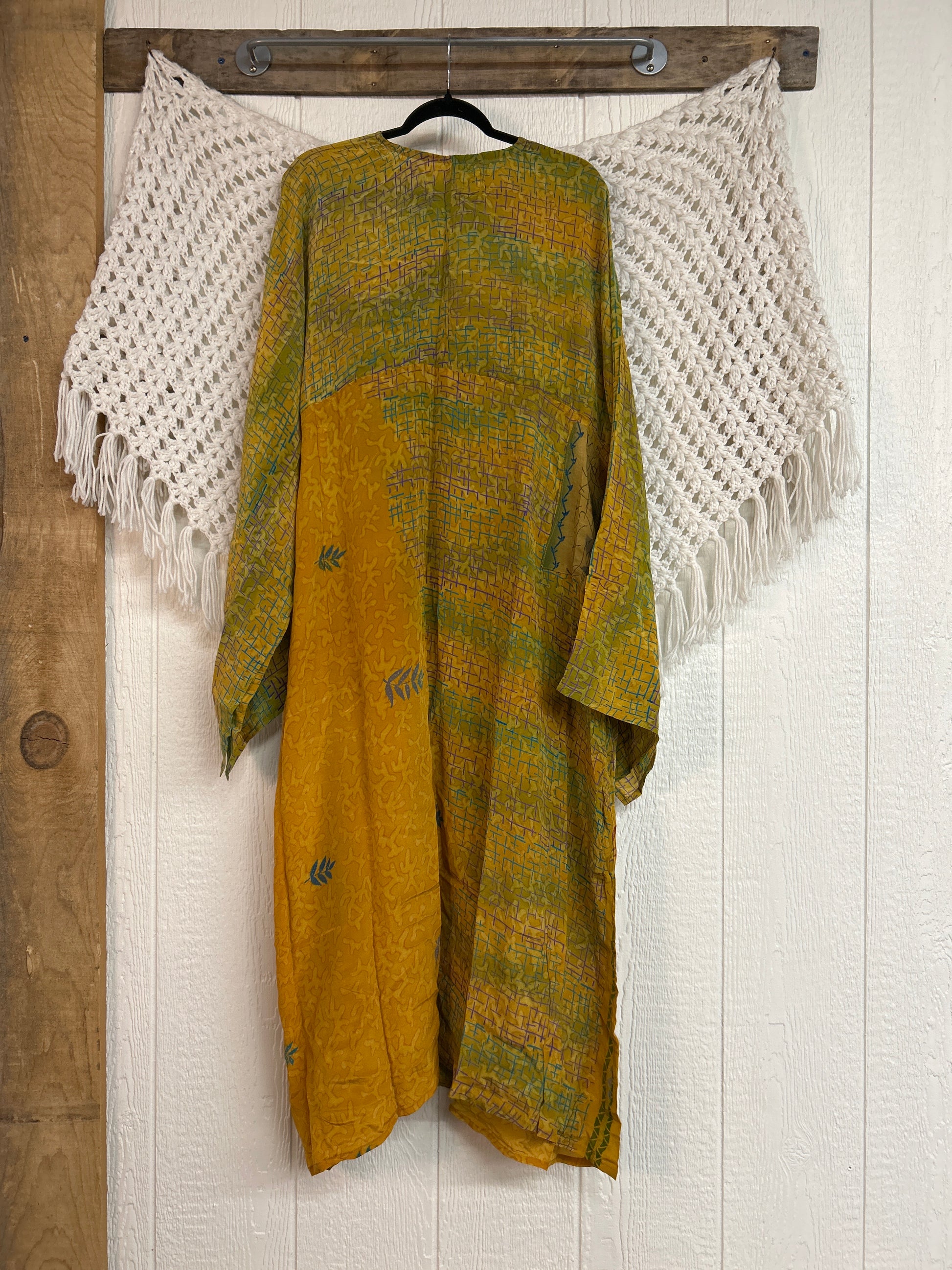 Crafted from our ultra lux vintage crepe sari this floaty dream features wide bell sleeves, deep v neckline, maxi silhouette with side slits for extra dimension.