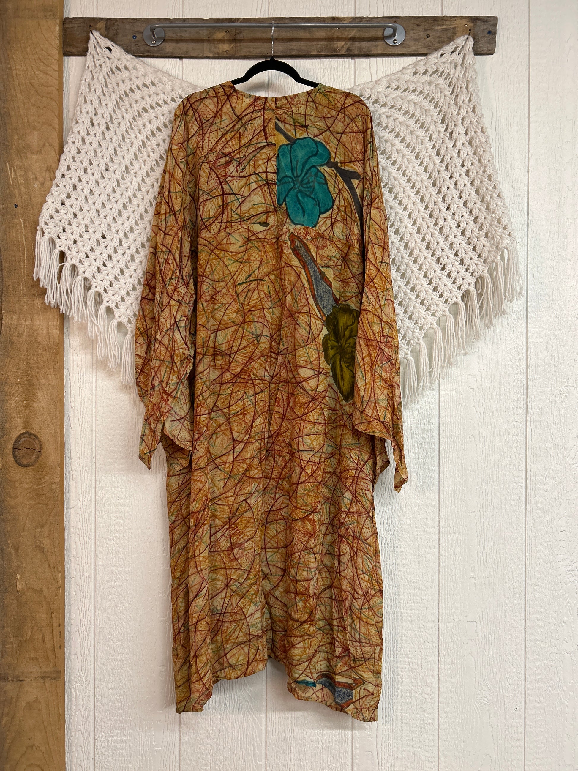 Crafted from our ultra lux vintage crepe sari this floaty dream features wide bell sleeves, deep v neckline, maxi silhouette with side slits for extra dimension.