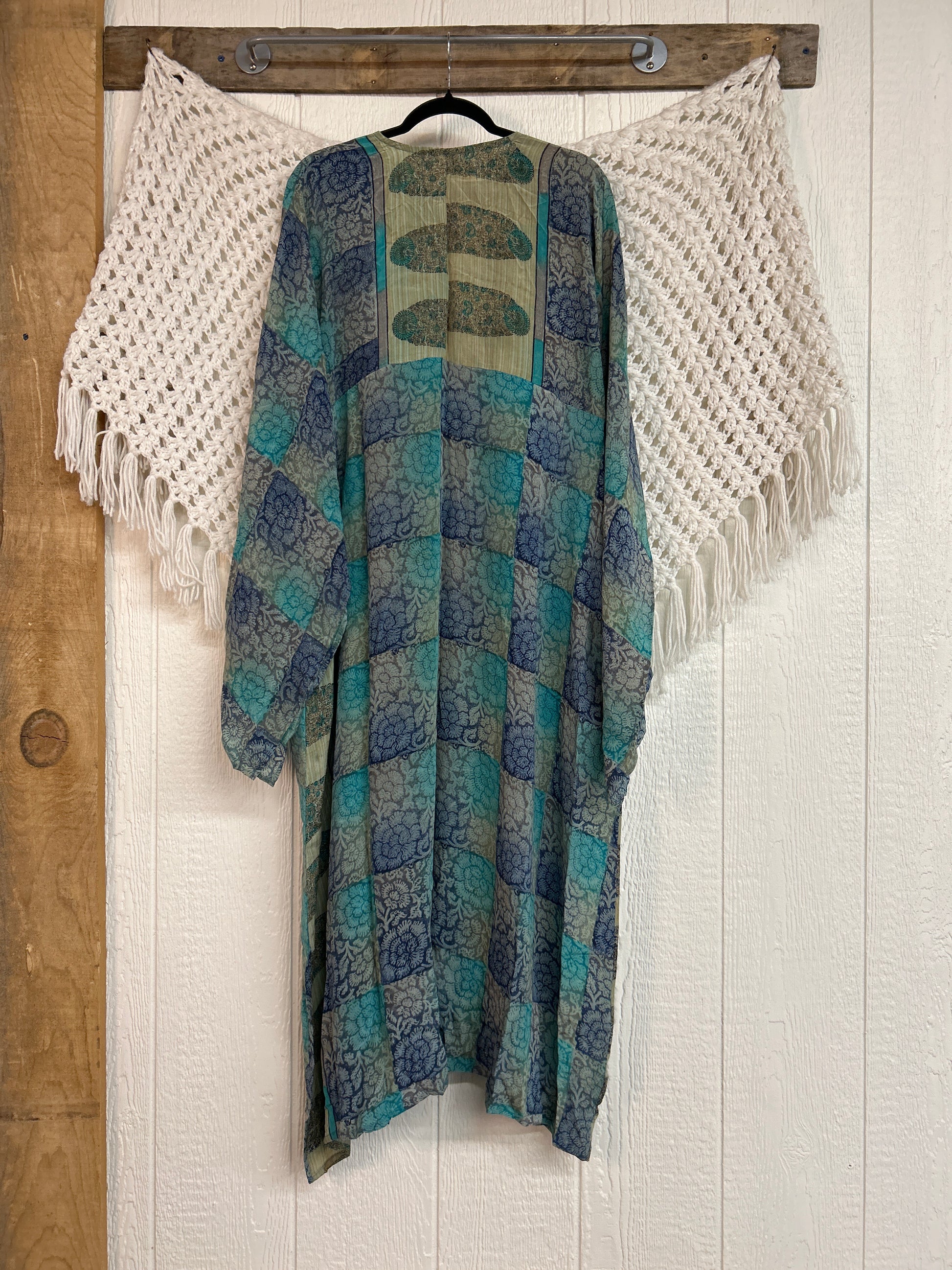 Fabrics may have small threads or holes in the layers. Color inconsistency or small stains may be present. The saris are sewn together and extend the life of each design.