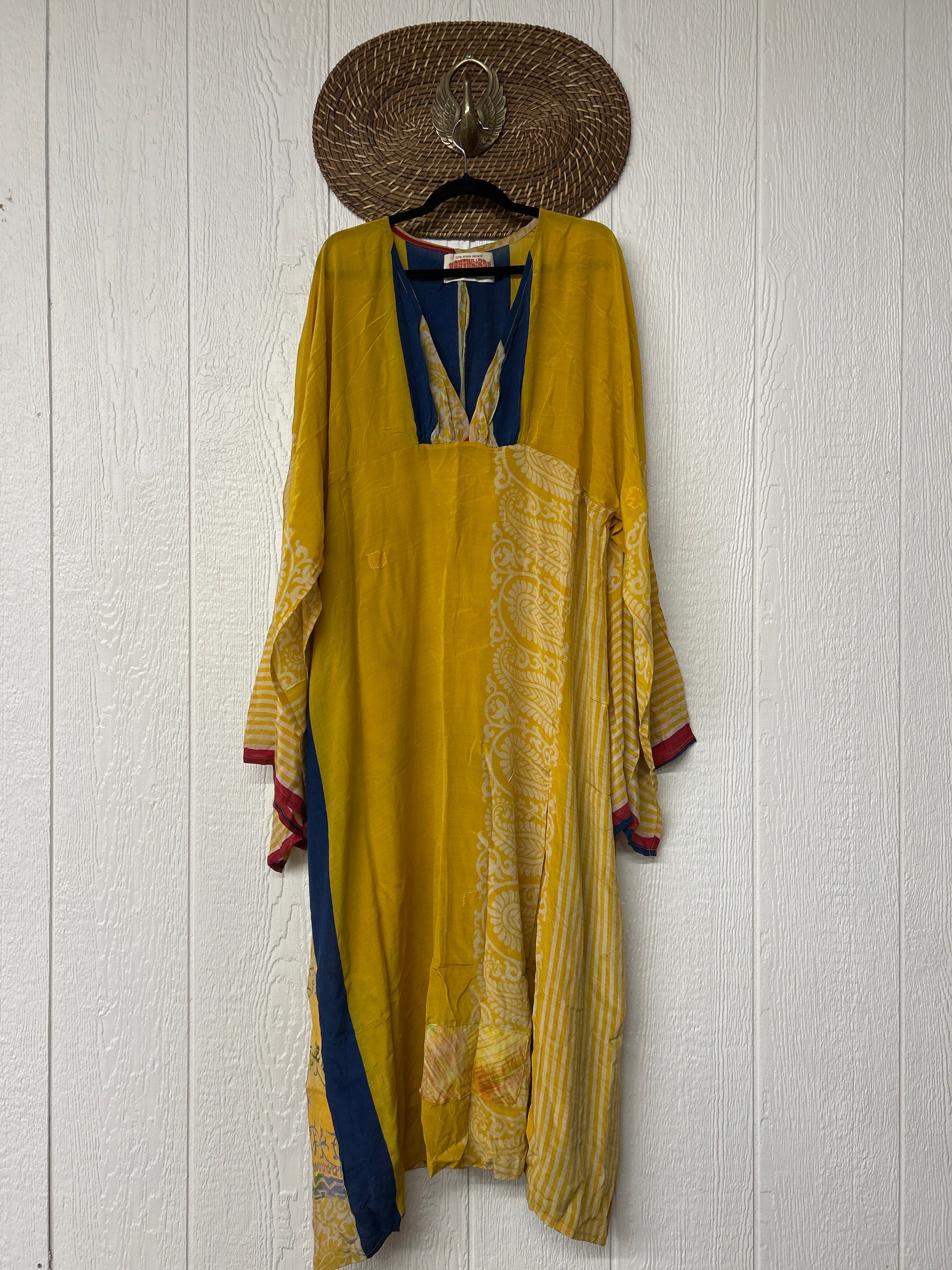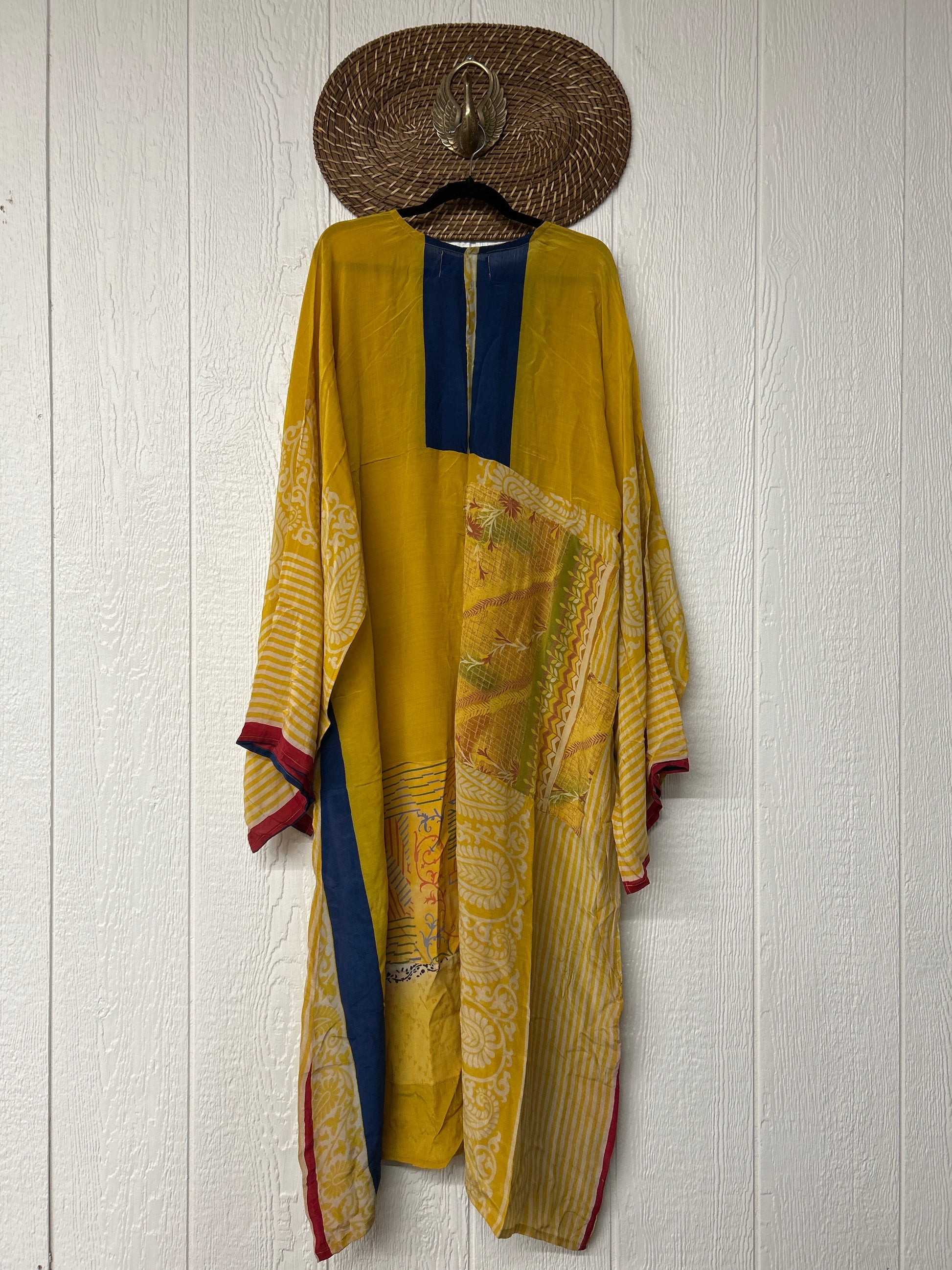 Fabrics may have small threads or holes in the layers. Color inconsistency or small stains may be present. The saris are sewn together and extend the life of each design.