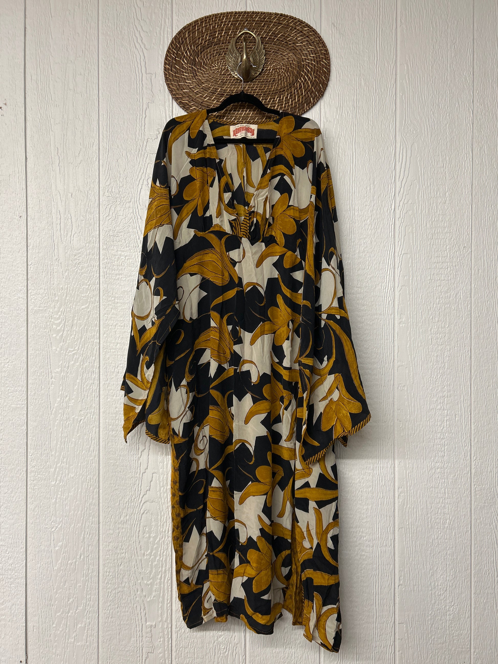 Crafted from our ultra lux vintage crepe sari this floaty dream features wide bell sleeves, deep v neckline, maxi silhouette with side slits for extra dimension.