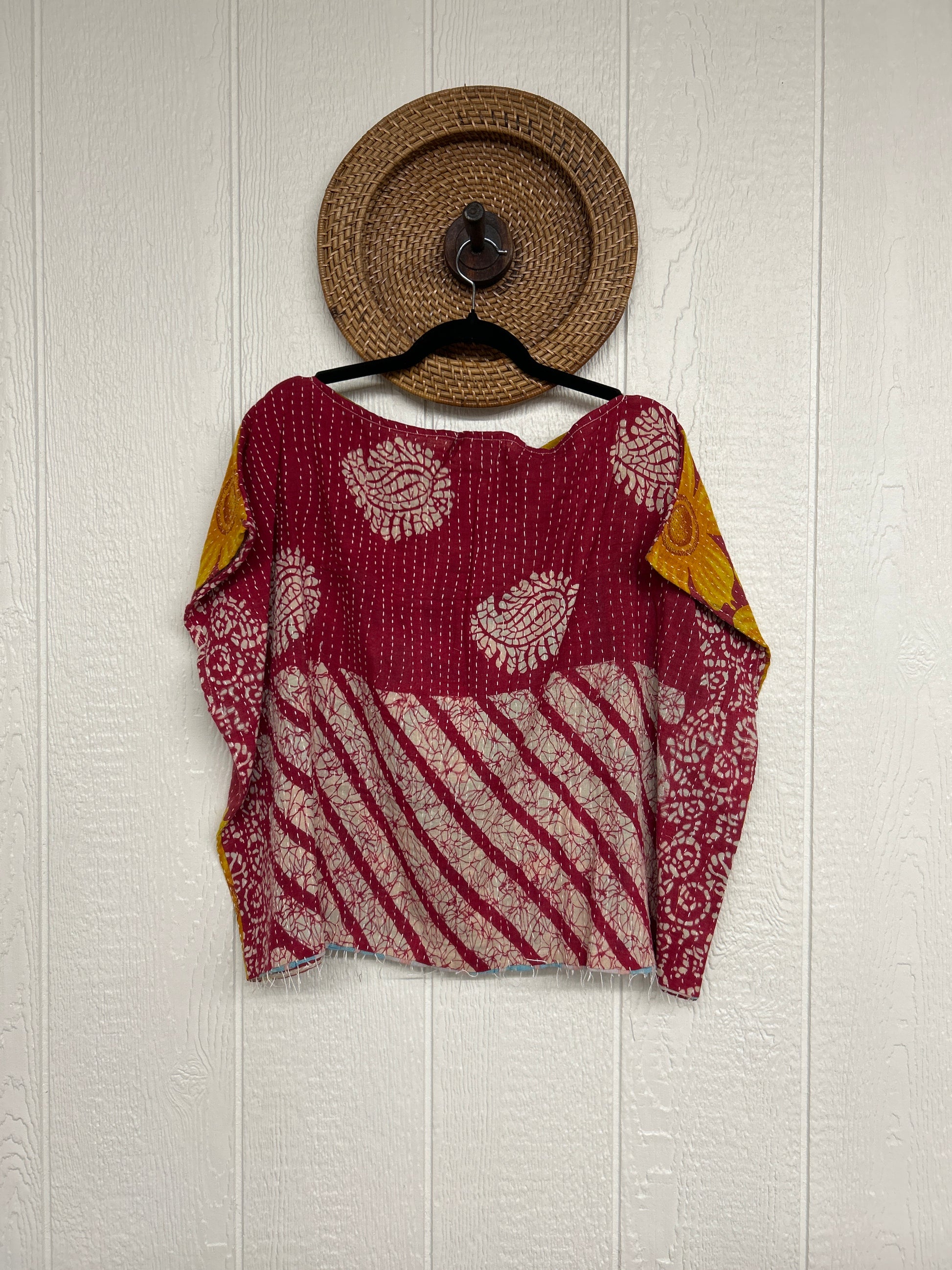 Disclosure: Our vintage styles have lived a full life before becoming the designs in our shop. Fabrics may have small threads or holes in the layers. Color inconsistency or small stains may be present. The saris are sewn together and extend the life of each design.