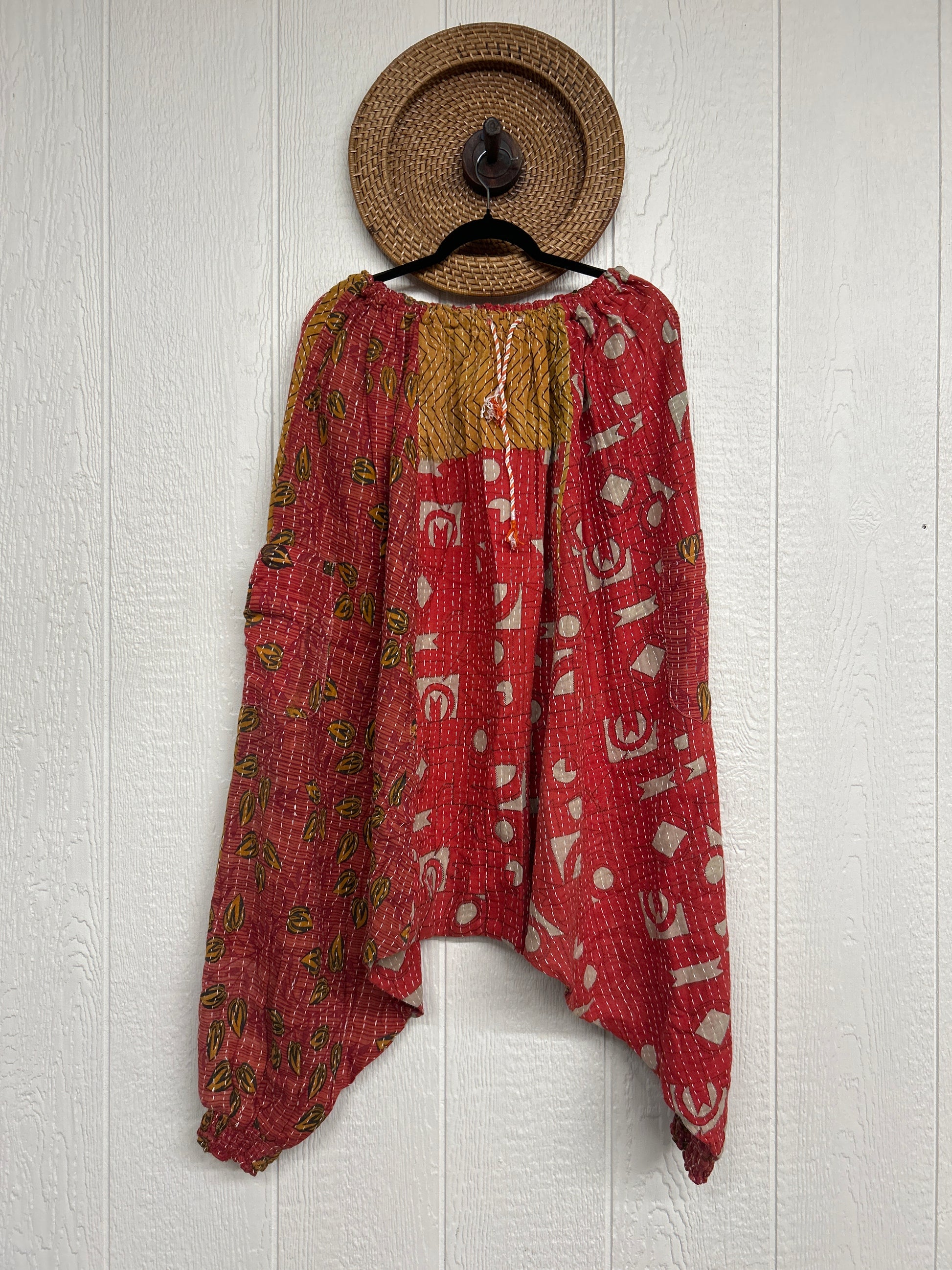 Made from our vintage kantha cotton sari with a super slouchy low harem crotch drop, slouchy exterior pockets, elastic waist with drawstring snd soft smocked elastic on the ankles.