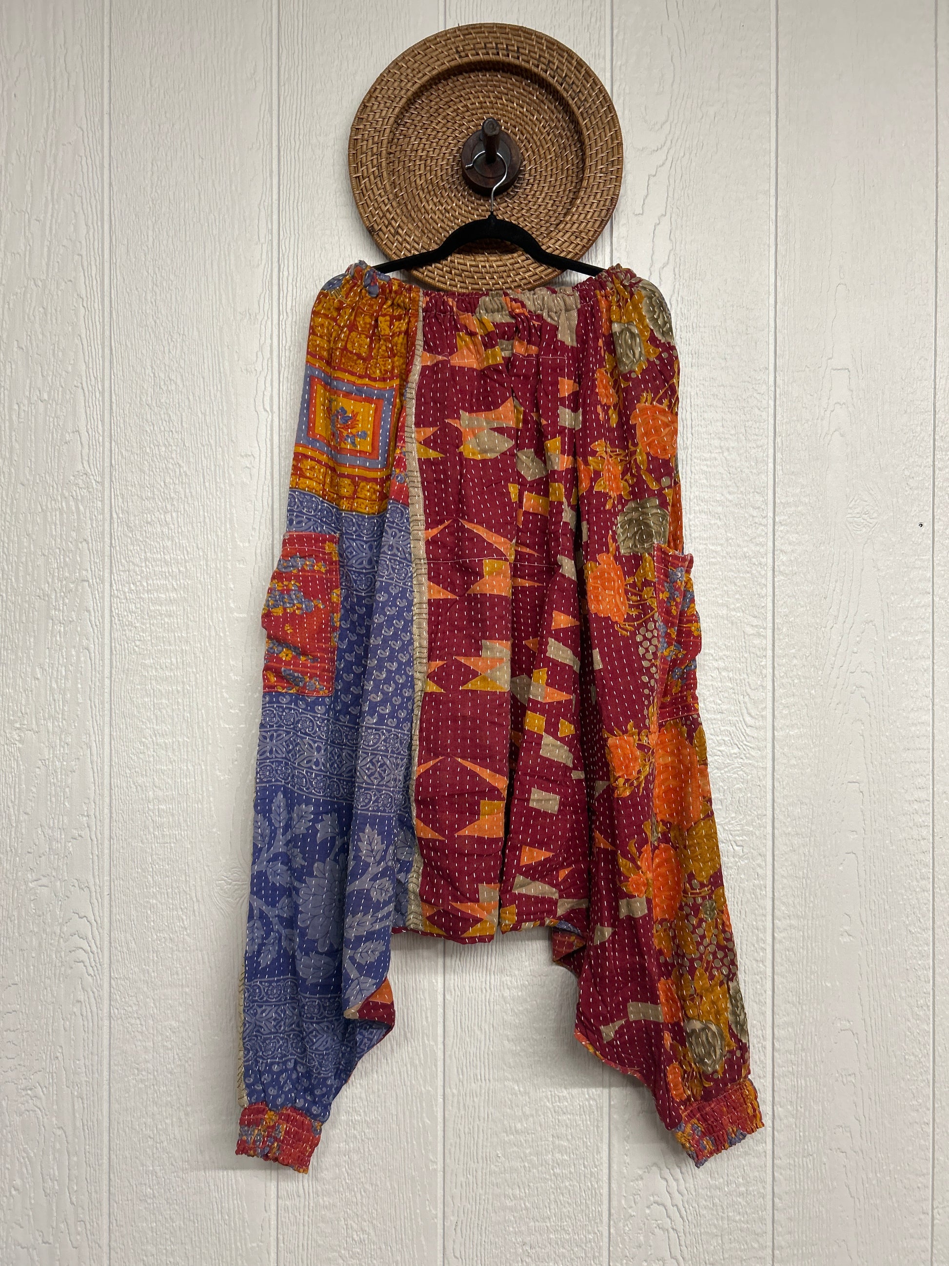 Made from our vintage kantha cotton sari with a super slouchy low harem crotch drop, slouchy exterior pockets, elastic waist with drawstring snd soft smocked elastic on the ankles.