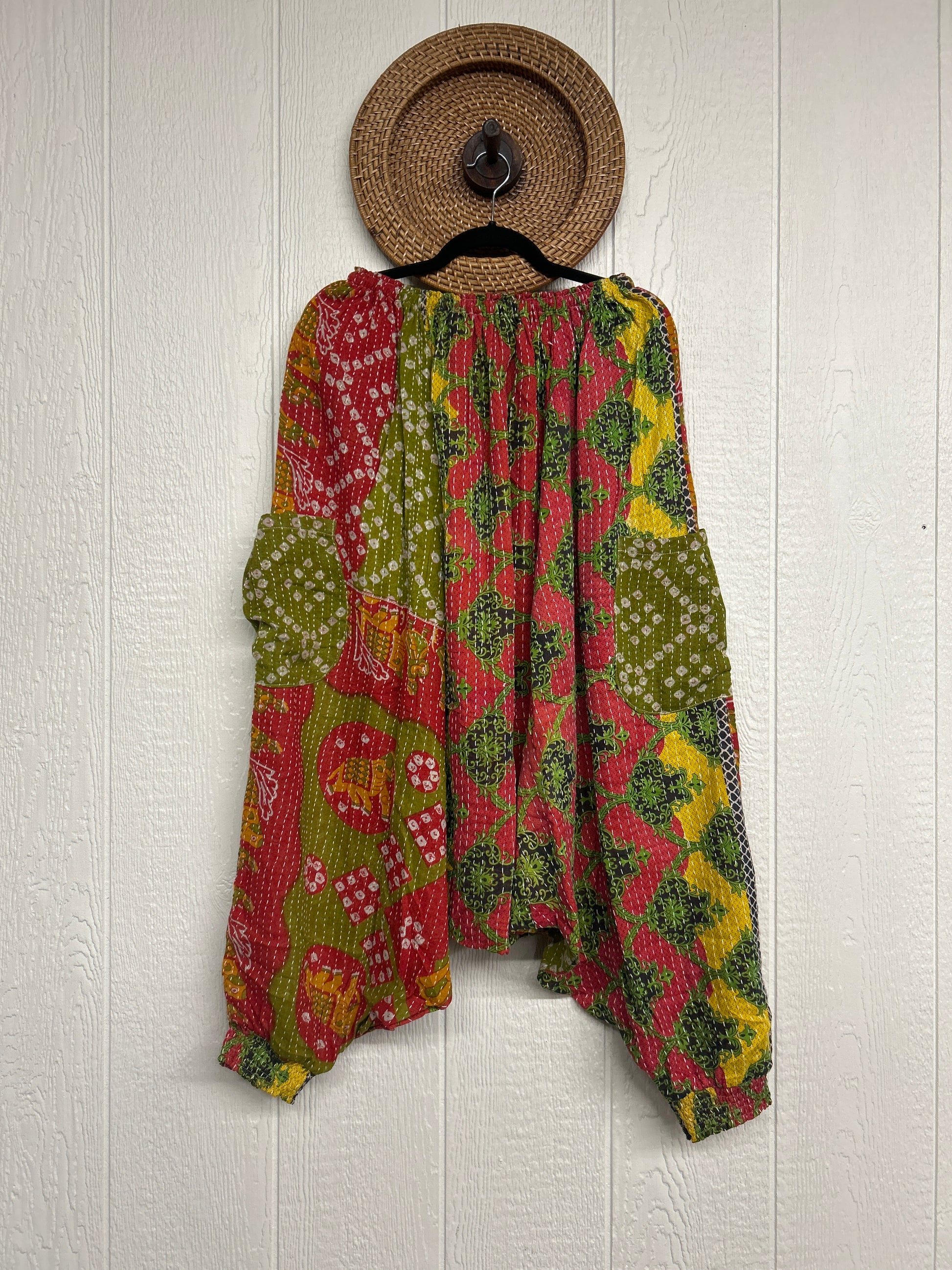 Made from our vintage kantha cotton sari with a super slouchy low harem crotch drop, slouchy exterior pockets, elastic waist with drawstring snd soft smocked elastic on the ankles.