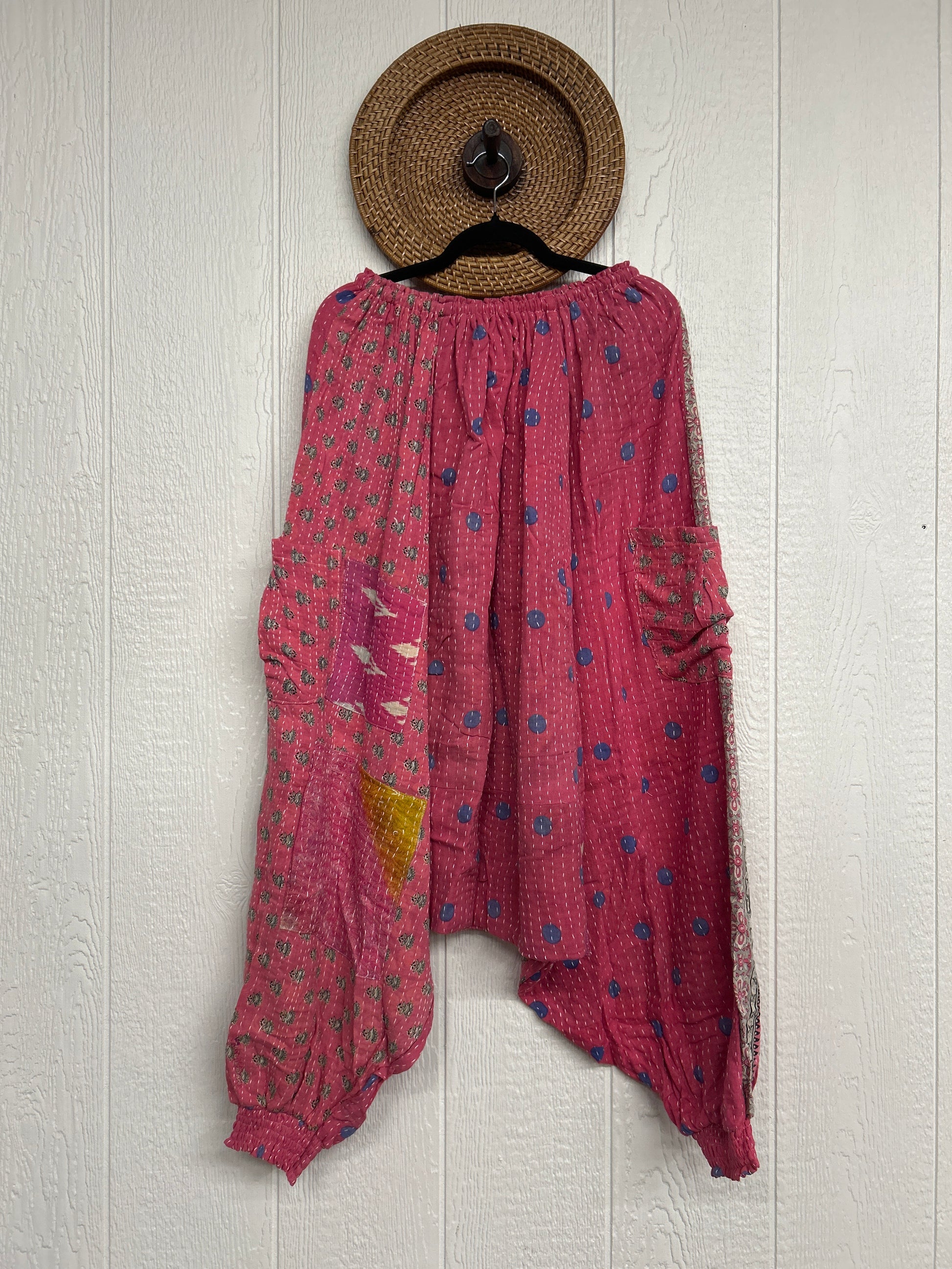 Made from our vintage kantha cotton sari with a super slouchy low harem crotch drop, slouchy exterior pockets, elastic waist with drawstring snd soft smocked elastic on the ankles.