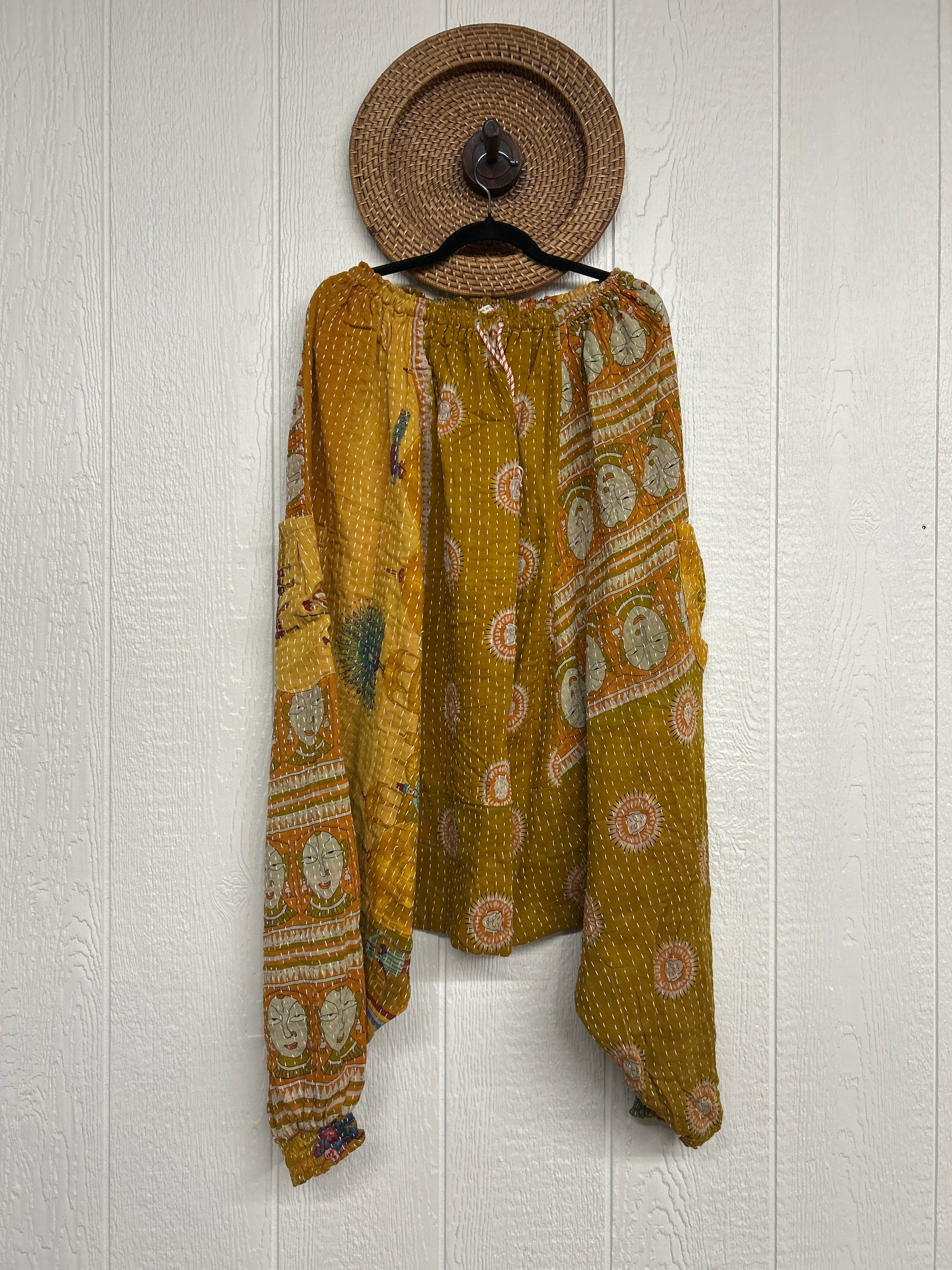 Made from our vintage kantha cotton sari with a super slouchy low harem crotch drop, slouchy exterior pockets, elastic waist with drawstring snd soft smocked elastic on the ankles.