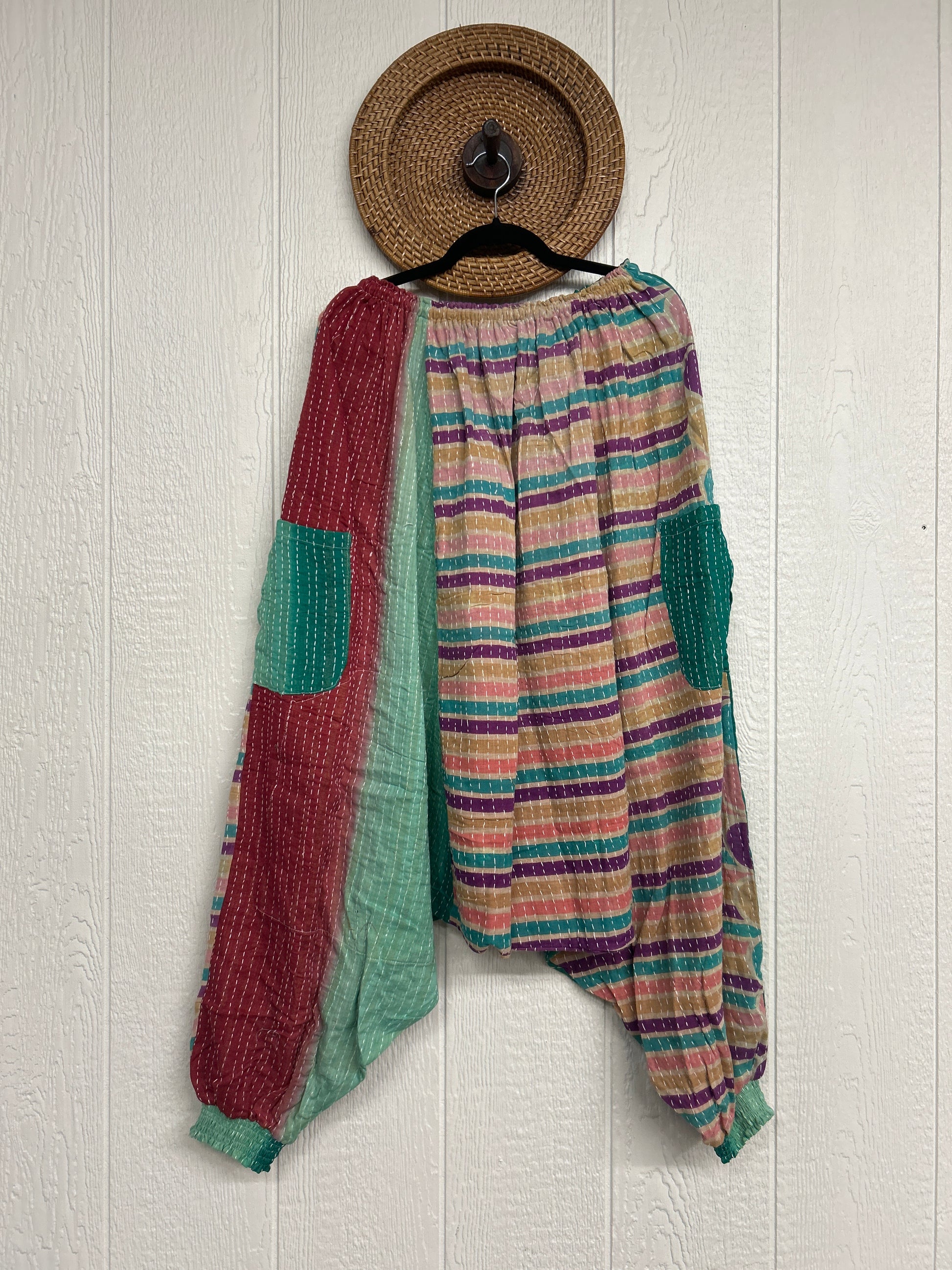 Made from our vintage kantha cotton sari with a super slouchy low harem crotch drop, slouchy exterior pockets, elastic waist with drawstring snd soft smocked elastic on the ankles.