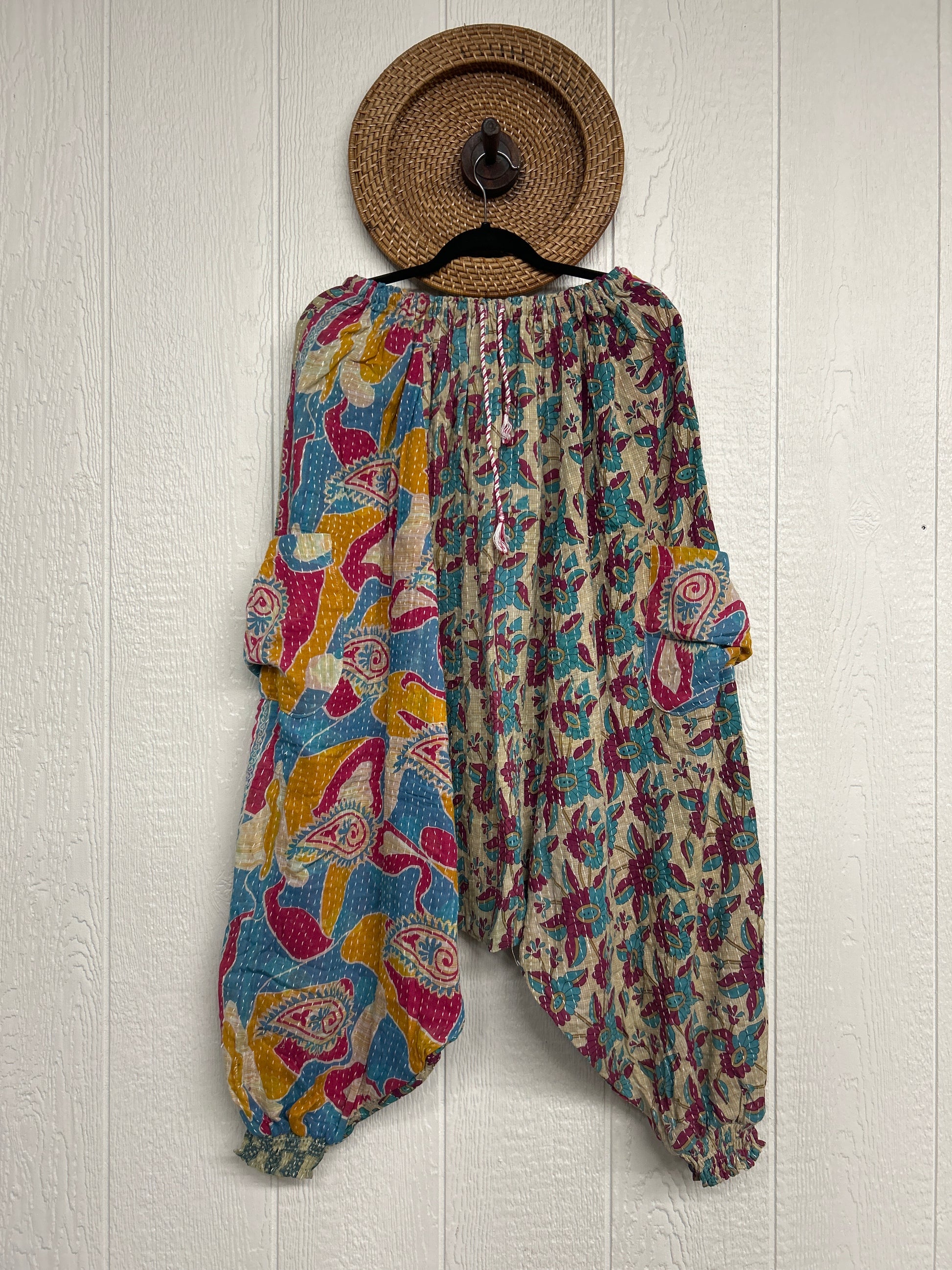 Made from our vintage kantha cotton sari with a super slouchy low harem crotch drop, slouchy exterior pockets, elastic waist with drawstring snd soft smocked elastic on the ankles.