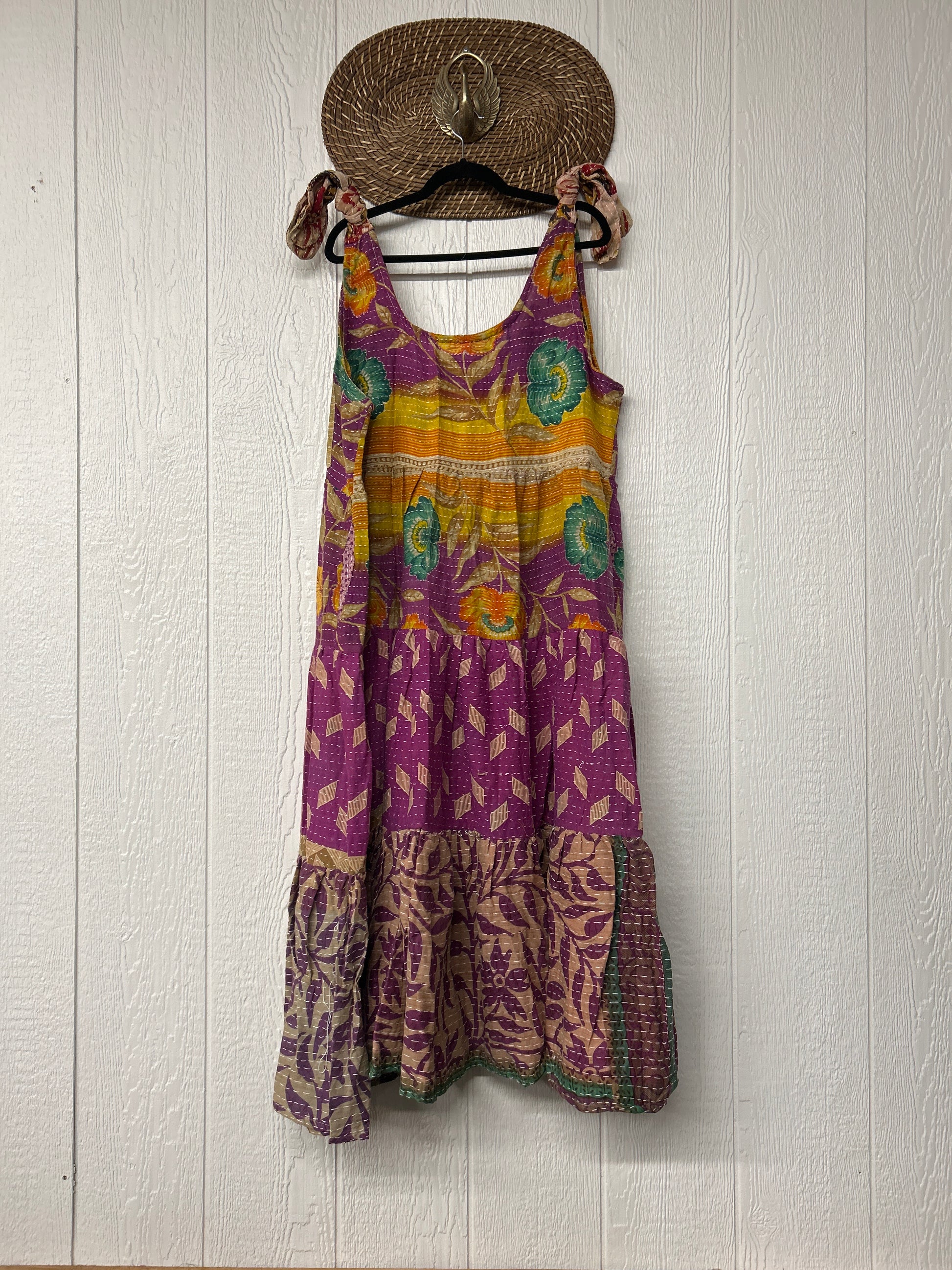 Fabrics may have small threads or holes in the layers. Color inconsistency or small stains may be present. The saris are sewn together and extend the life of each design. Imperfections should be celebrated.