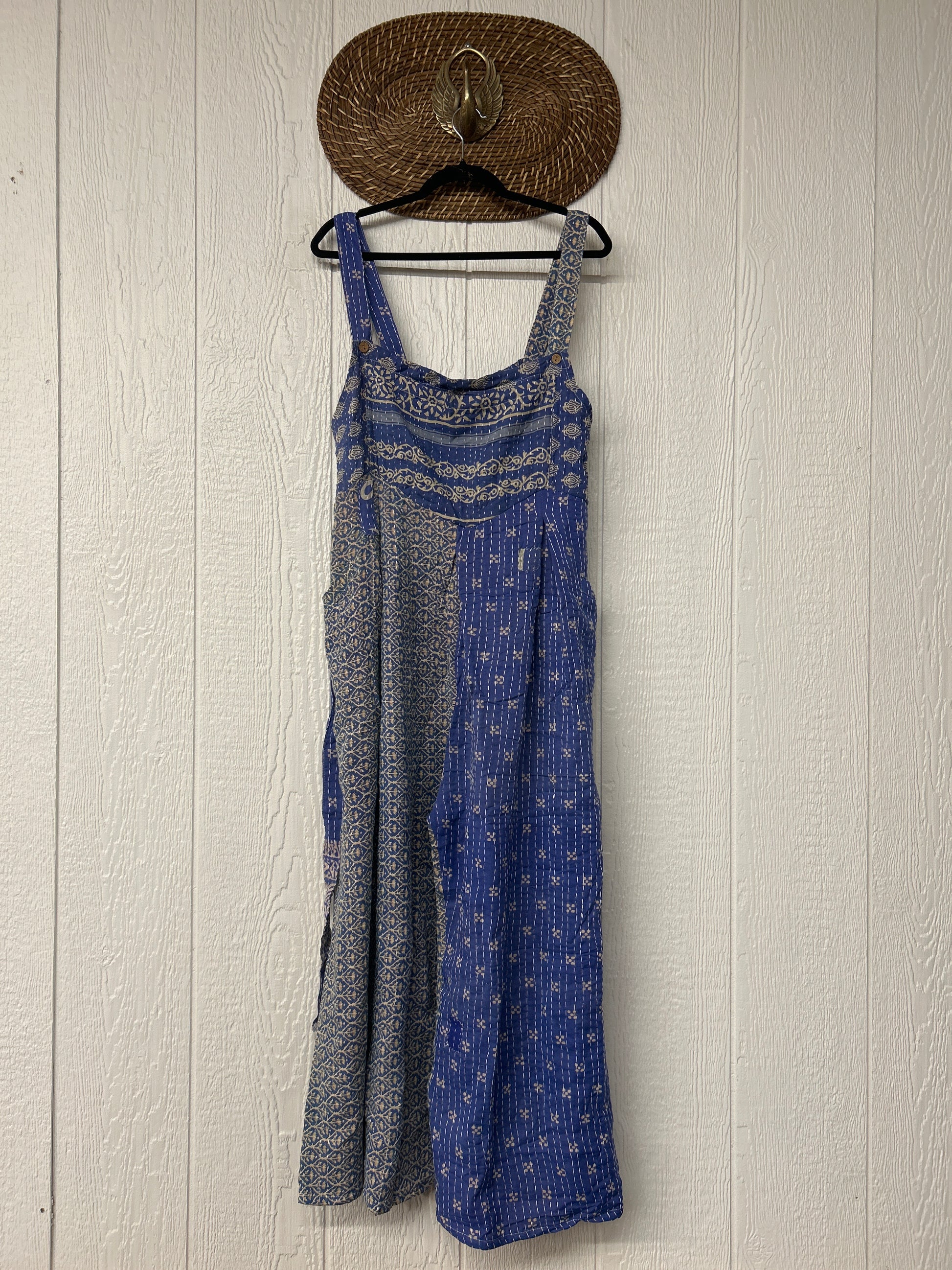 Features adjustable button straps, deep interior pockets, front bib pocket and wide flowy legs