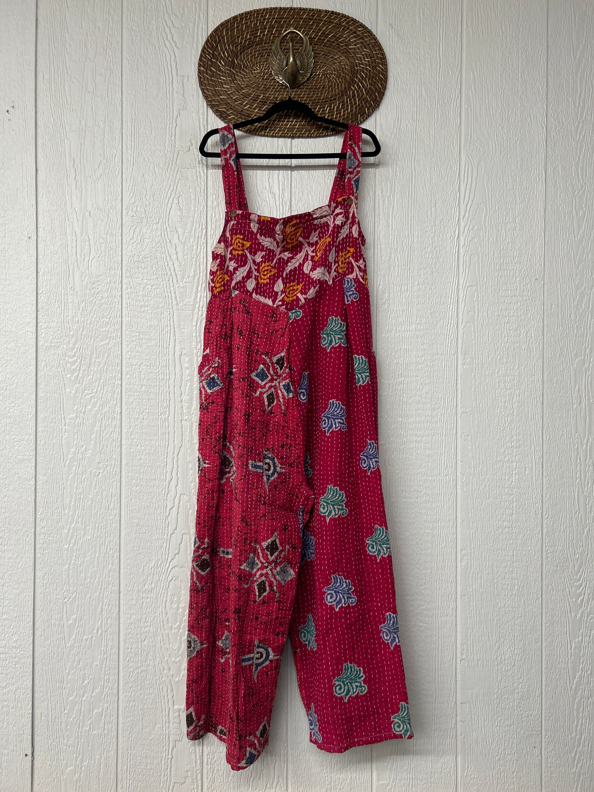 Features adjustable button straps, deep interior pockets, front bib pocket and wide flowy legs