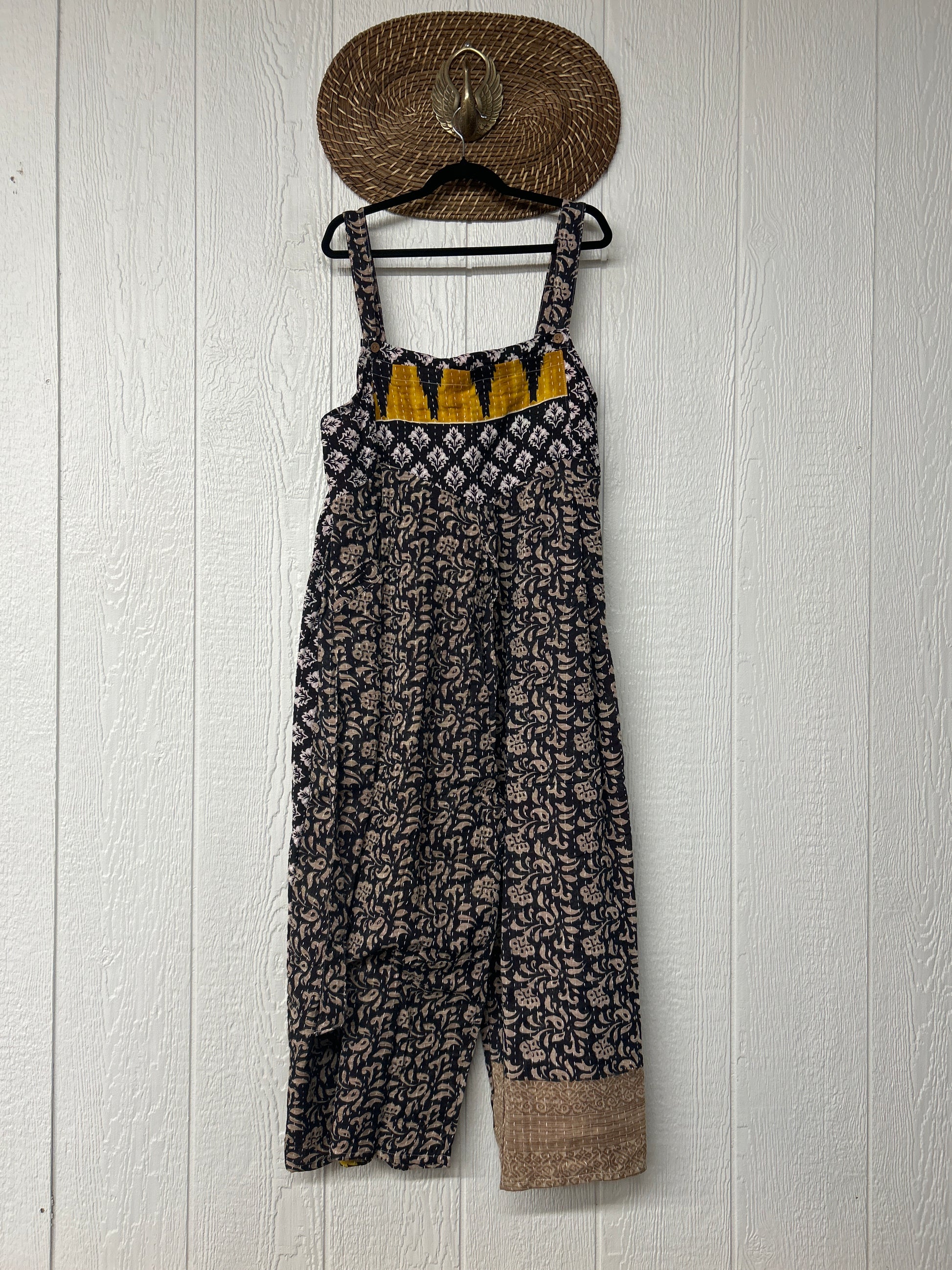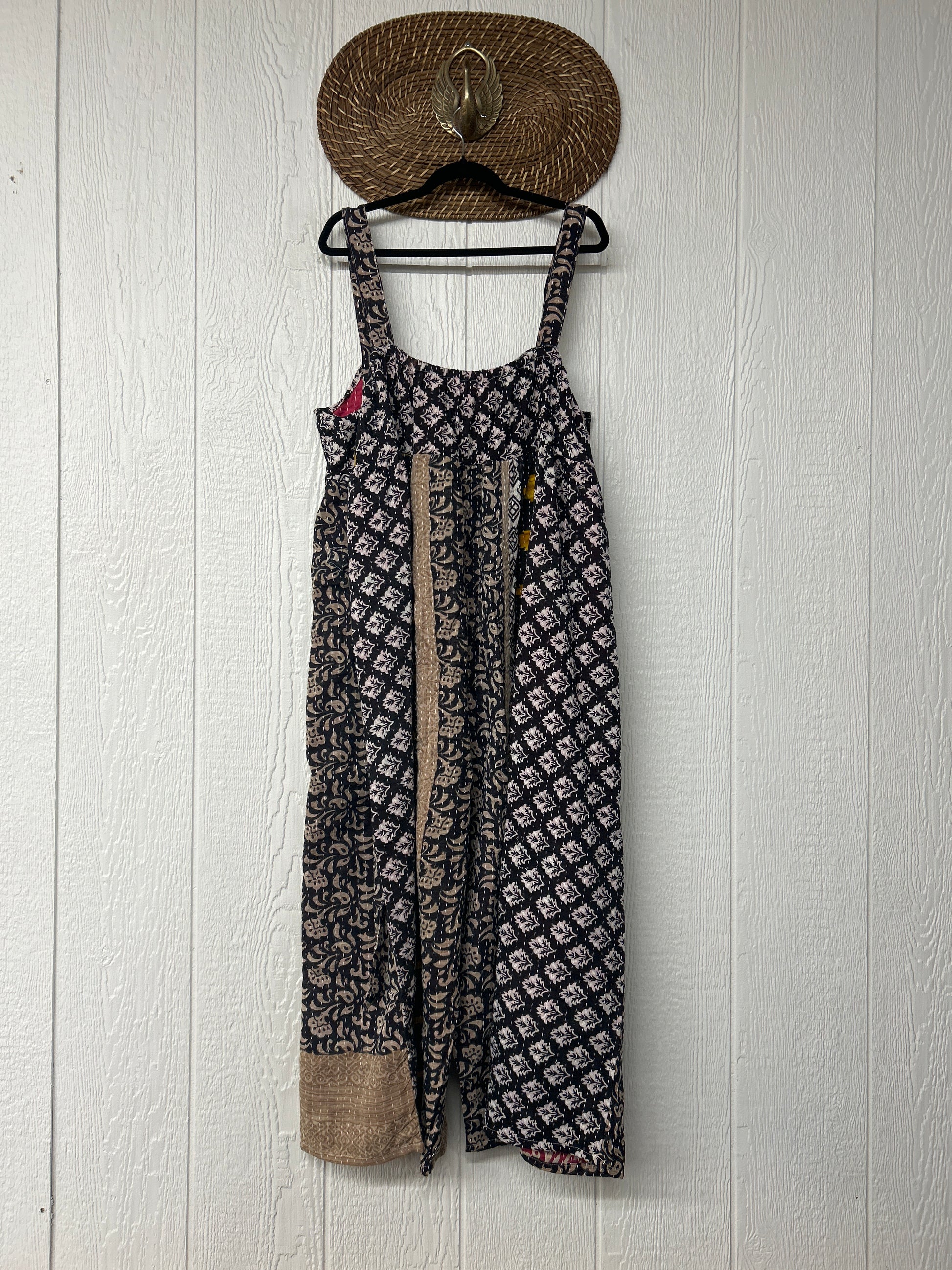 Features adjustable button straps, deep interior pockets, front bib pocket and wide flowy legs