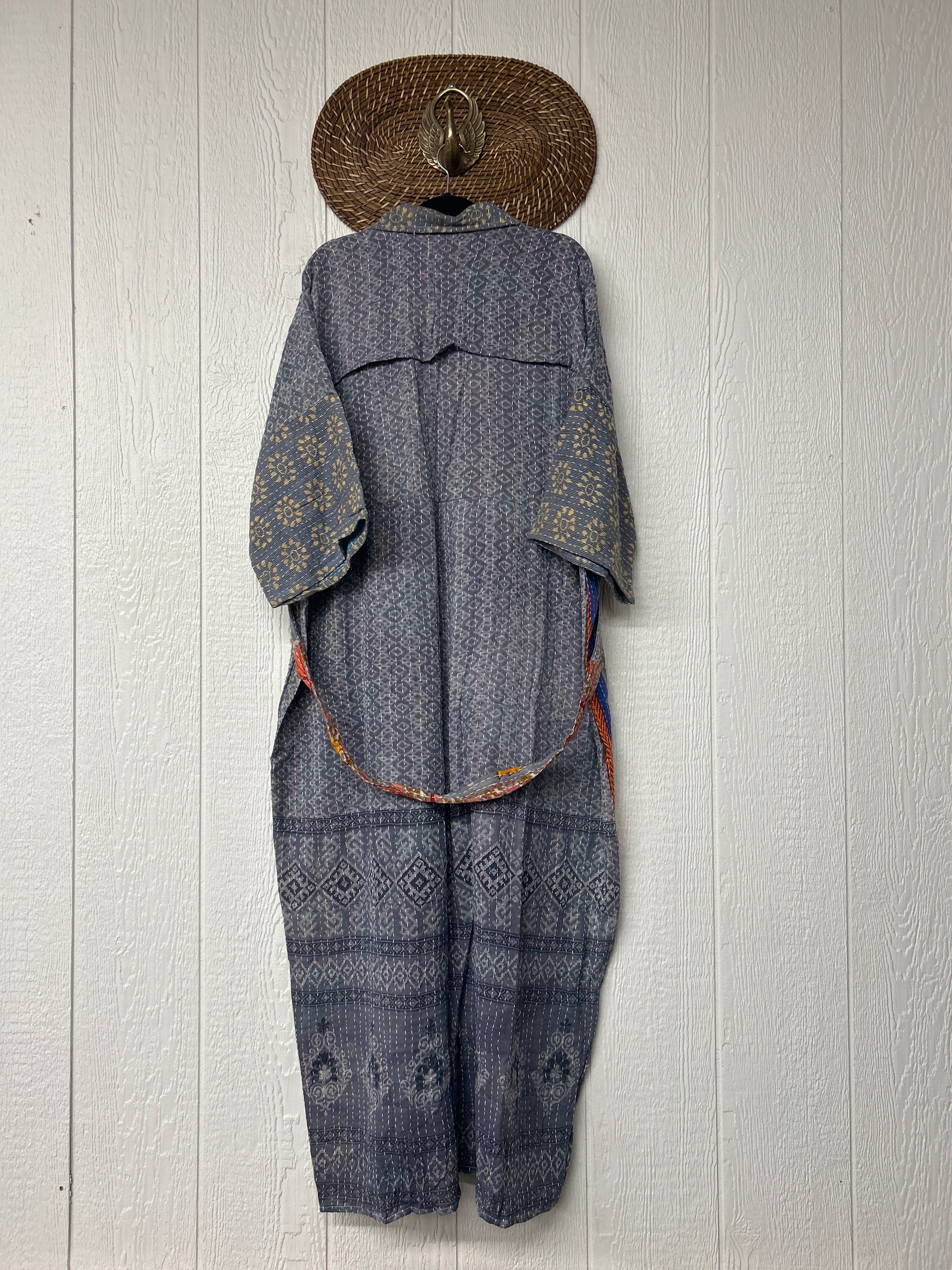 Crafted from our ultra-luxe Kantha stitch vintage cotton sari the Gravity Duster Dress features a button down front placket, adjustable belt.