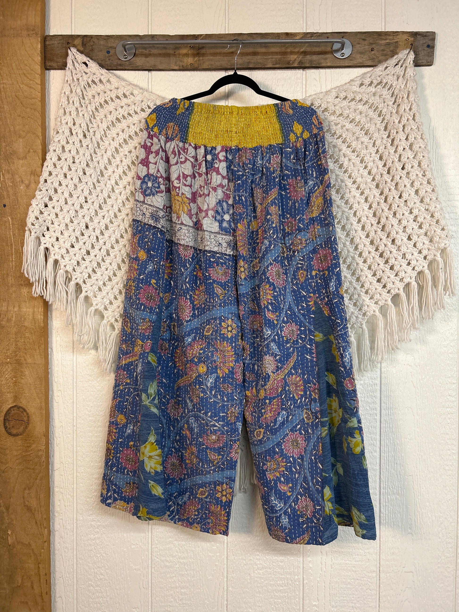 Crafted from our ultra lux vintage cotton kantha stitched sari these floaty pants feature super wide legs with front and back vintage crepe inserts that make your pants dance when you walk. Front slouchy pockets are deep enough to fill with your treasures.