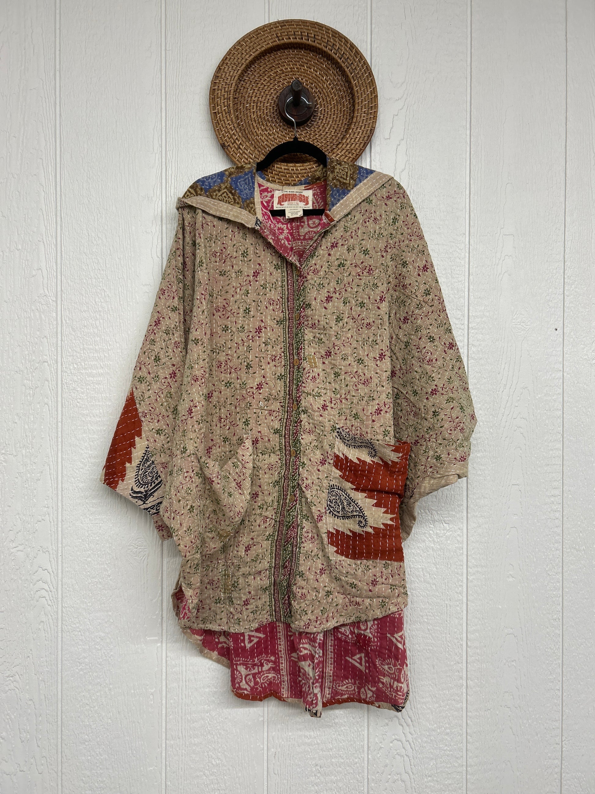 Made from our hand kantha stitched vintage cotton sari, this piece of wearable art features a Button-down opening with functional buttons, slouchy outer pockets, billowy sleeves, a rounded hemline and a vibey hood. The perfect top to compliment your favorite kantha pants or bell bottoms.
