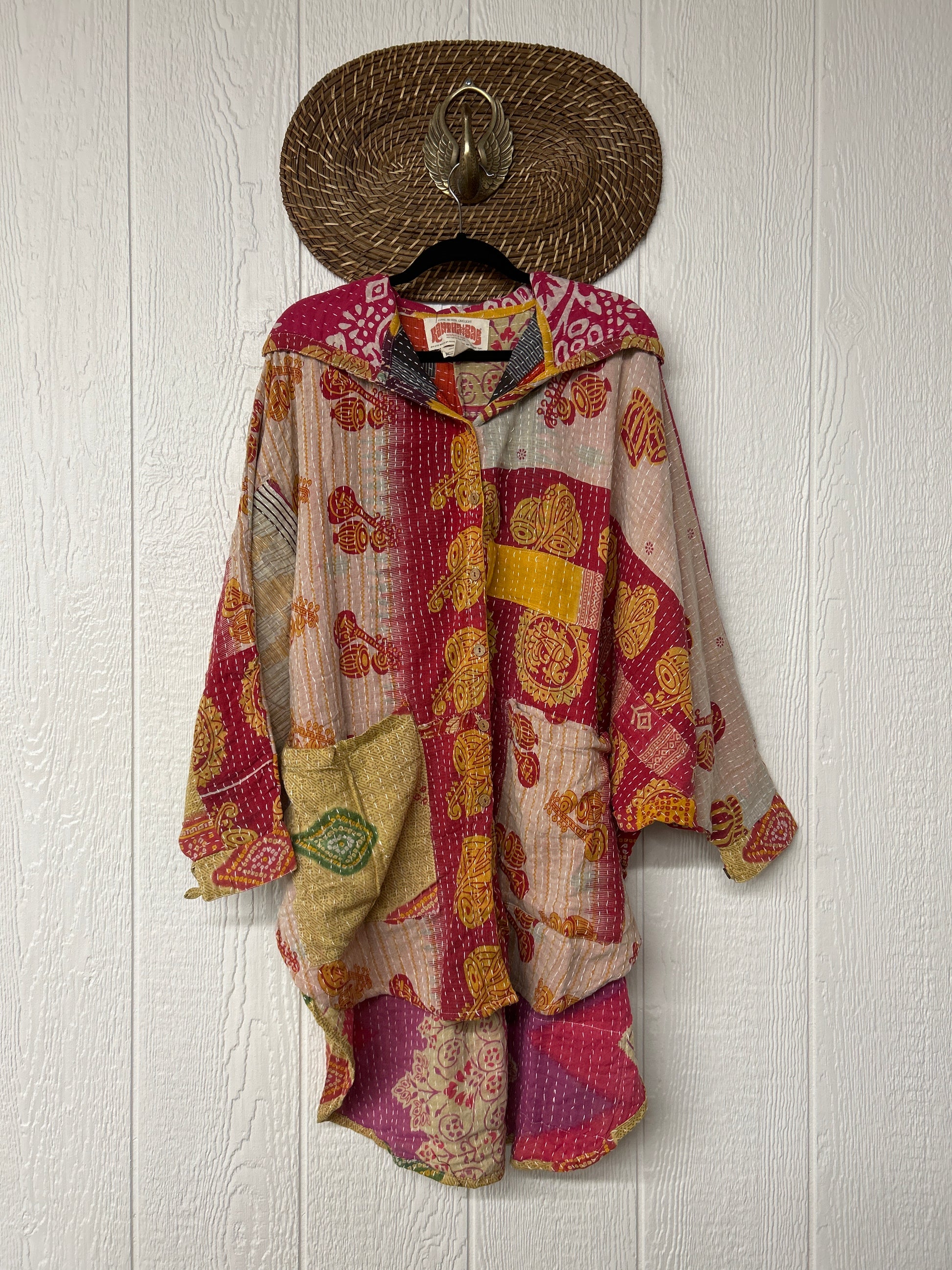 Made from our hand kantha stitched vintage cotton sari, this piece of wearable art features a Button-down opening with functional buttons, slouchy outer pockets, billowy sleeves, a rounded hemline and a vibey hood. The perfect top to compliment your favorite kantha pants or bell bottoms.