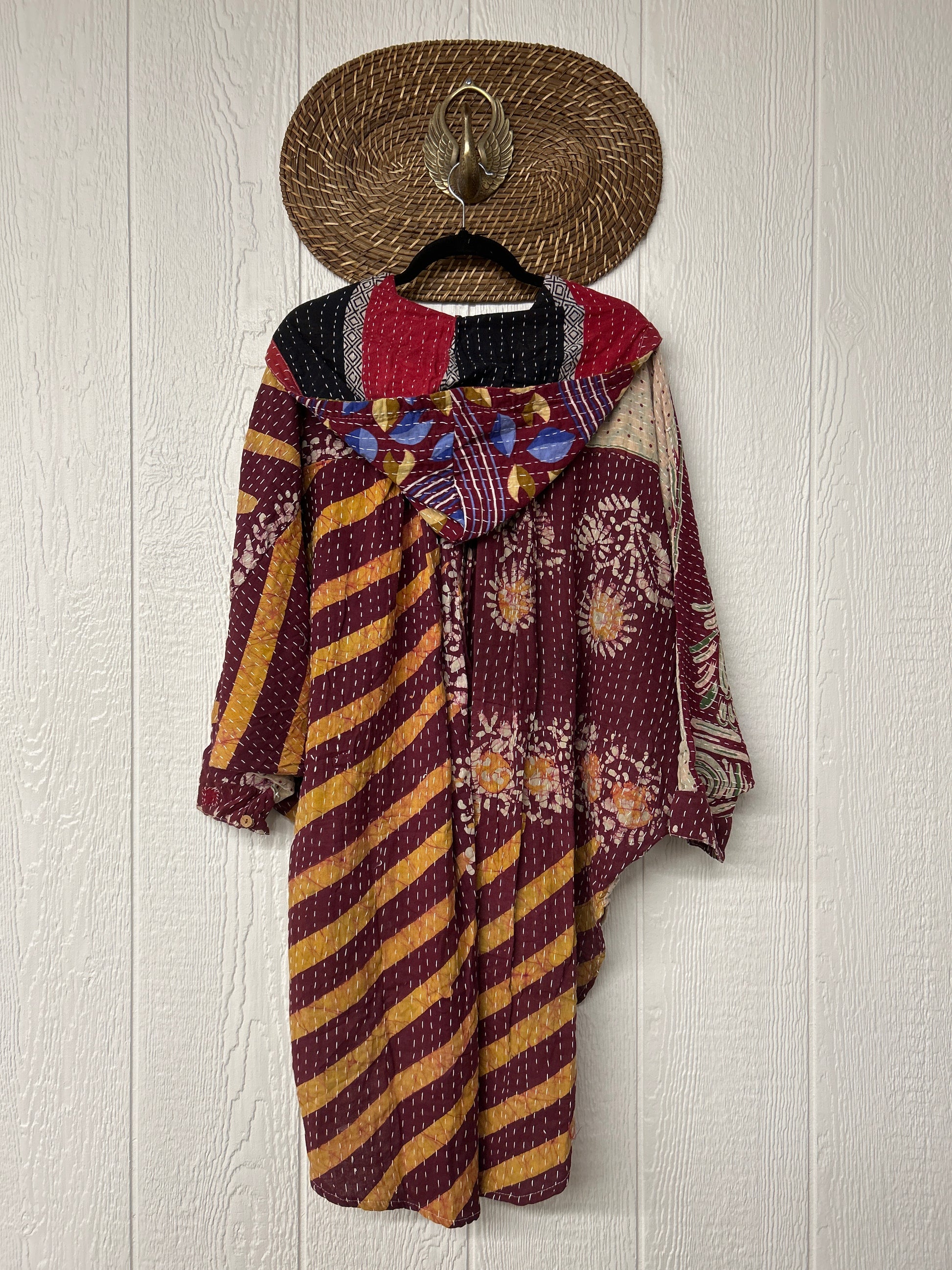 Made from our hand kantha stitched vintage cotton sari, this piece of wearable art features a Button-down opening with functional buttons, slouchy outer pockets, billowy sleeves, a rounded hemline and a vibey hood. The perfect top to compliment your favorite kantha pants or bell bottoms.