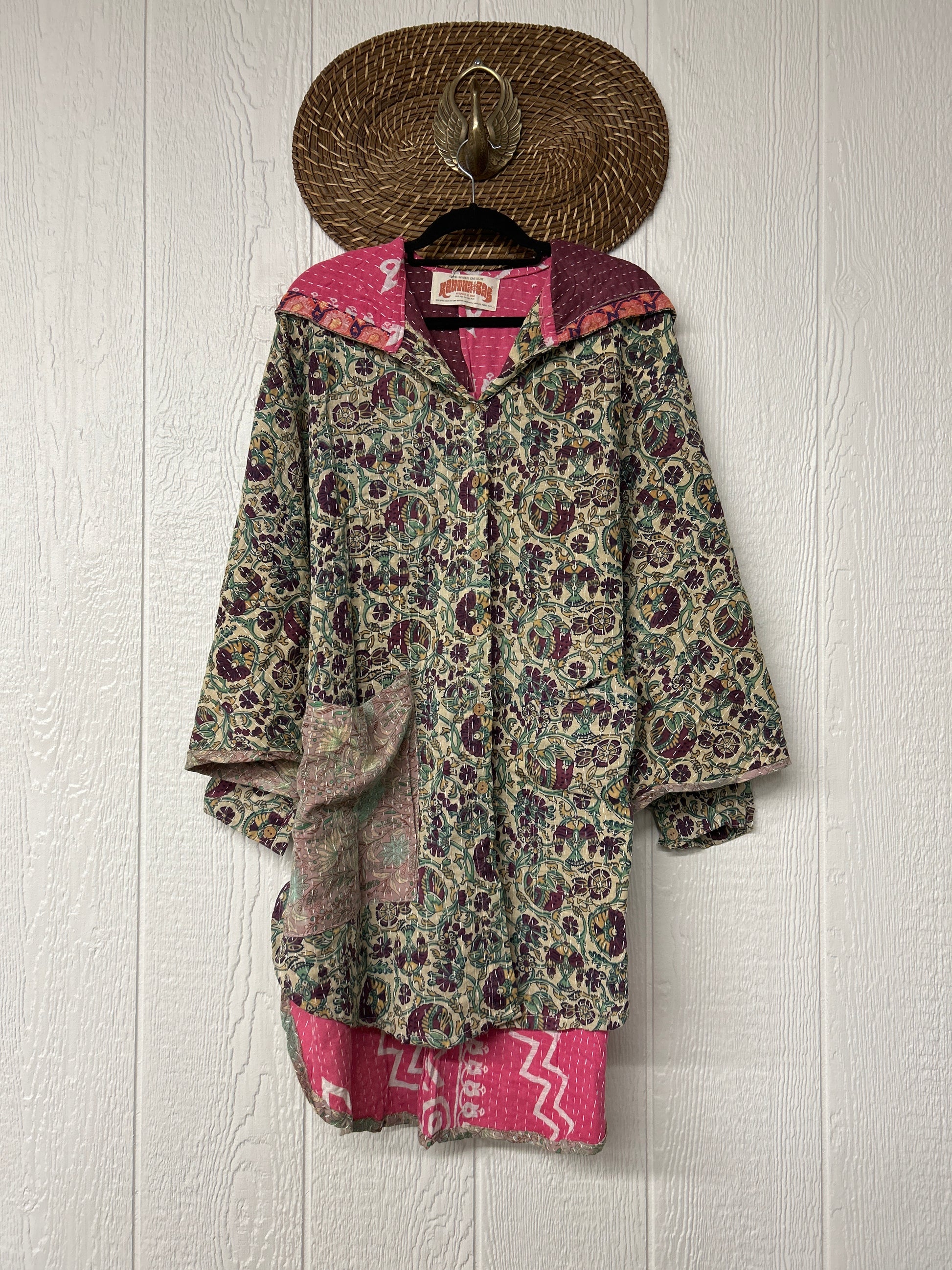 Made from our hand kantha stitched vintage cotton sari, this piece of wearable art features a Button-down opening with functional buttons, slouchy outer pockets, billowy sleeves, a rounded hemline and a vibey hood. The perfect top to compliment your favorite kantha pants or bell bottoms.
