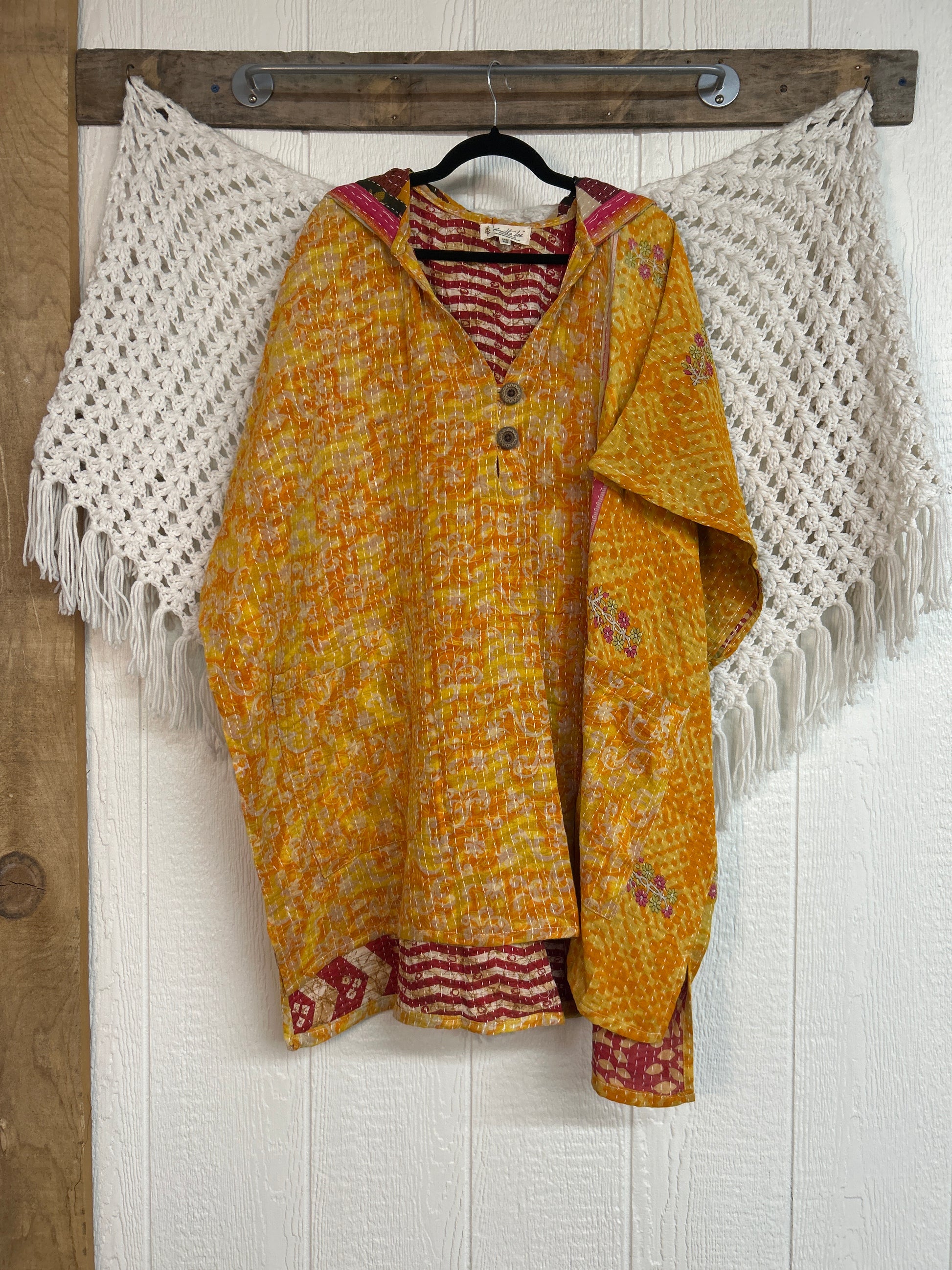 Crafted from our pareo kantha stitched cotton sari this dream peace features a hood, two buttons, two slouchy big pockets and side slits for extra dimension. A timeless transitional piece that will transform any outfit into a lux hippie moment!