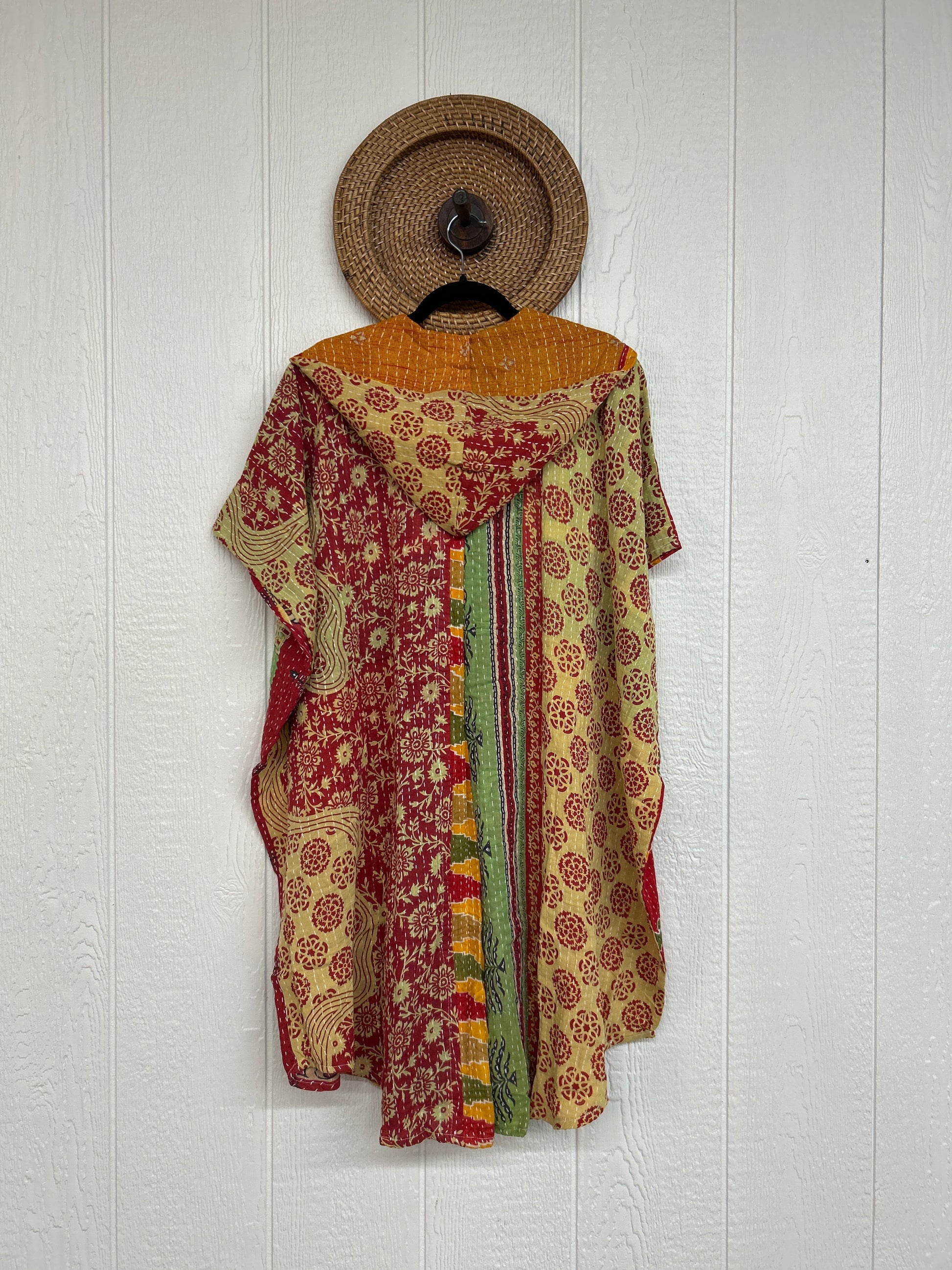 Made from our hand Kantha stitched cotton sari, this one piece wonder features a hood, front button-down closure, pockets, and super flowy shorts. Size Recommended 00-20/22. Crafted and sewn by families in a small village in Northern India, providing work and a fair living.